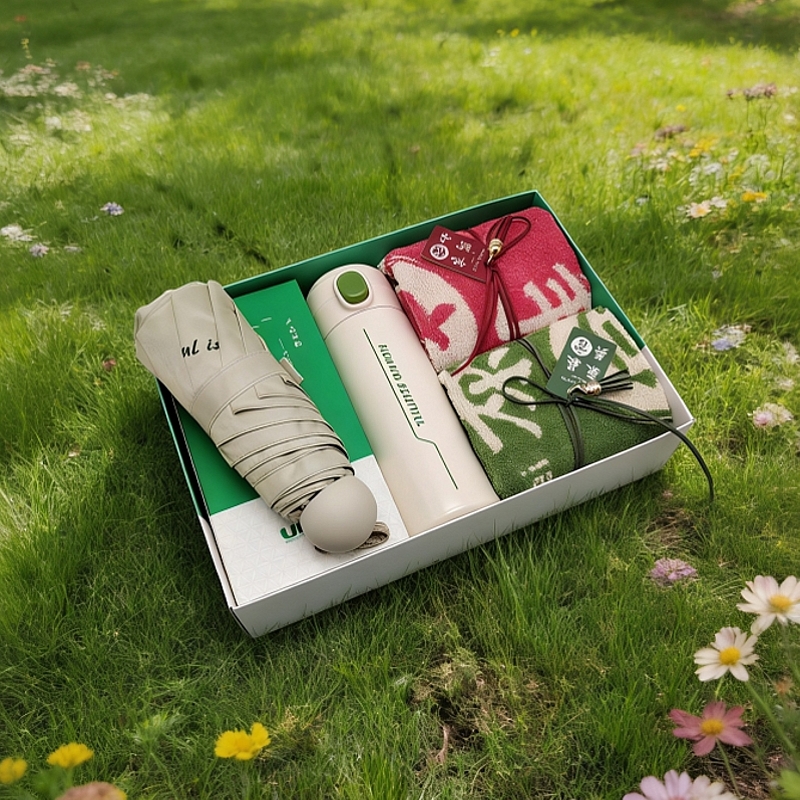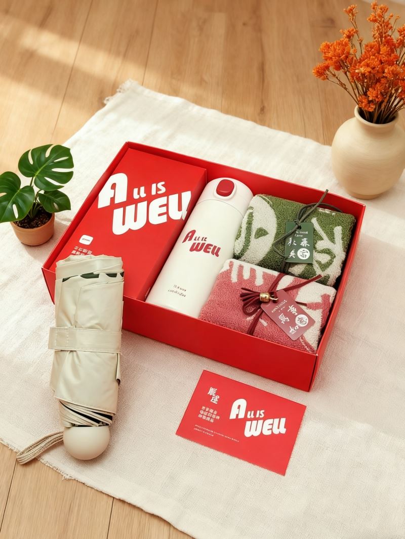 型号: A8B11S2 产品内容: 1、筑福精梳棉大方巾×2 每条克重60克 35*35CM 2、大号晴雨伞 ×1 五折八骨 伞下直径95CM 3、炫彩保温杯 ×1 420毫升容量 内胆304 杯盖PP 礼盒: 29.5×21×7.4cm 天地盖+拎袋 1、筑福系列精梳棉大方巾 祝福融入 精梳棉材质 2、420毫升高颜值保温杯 304内胆 精美设计文案 3、大号晴雨伞主题设计融入 五折八骨大伞 外观靓丽 实用性强