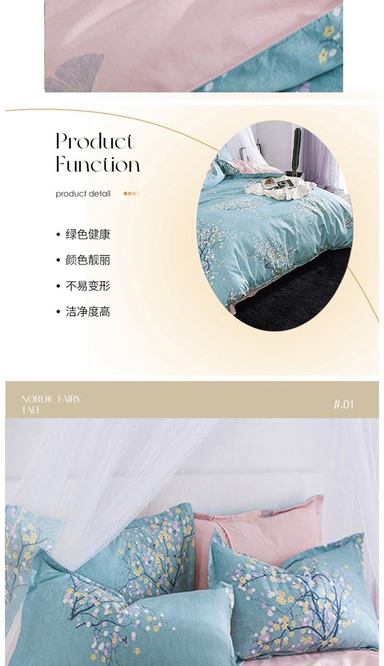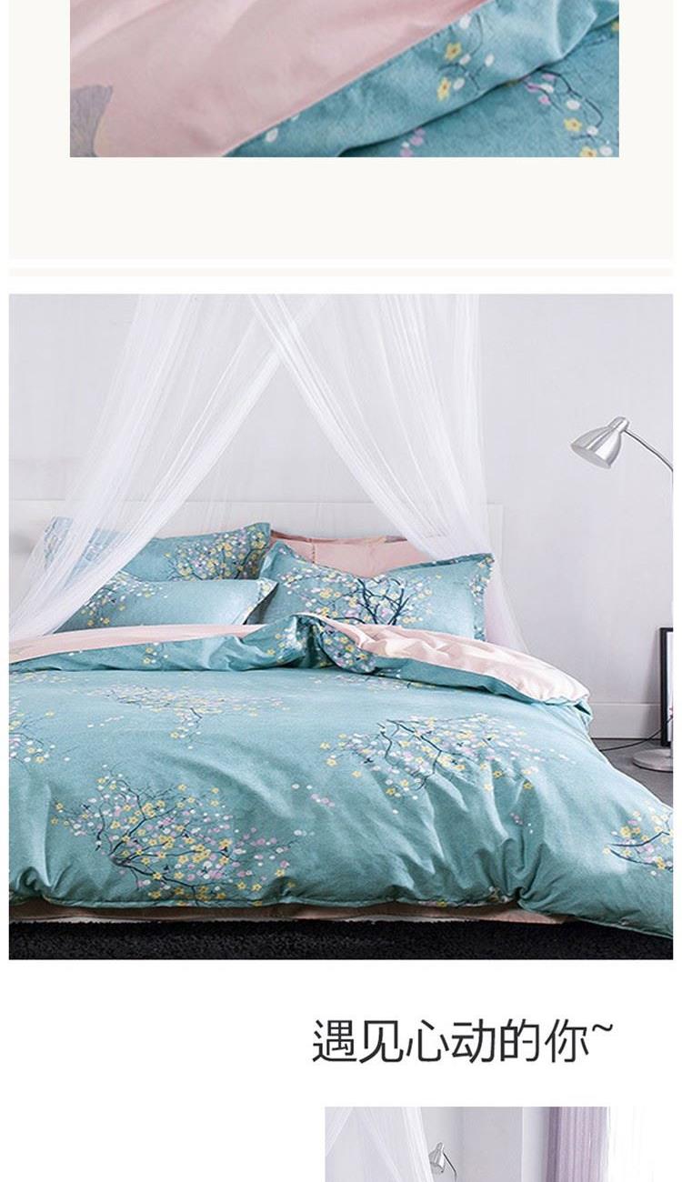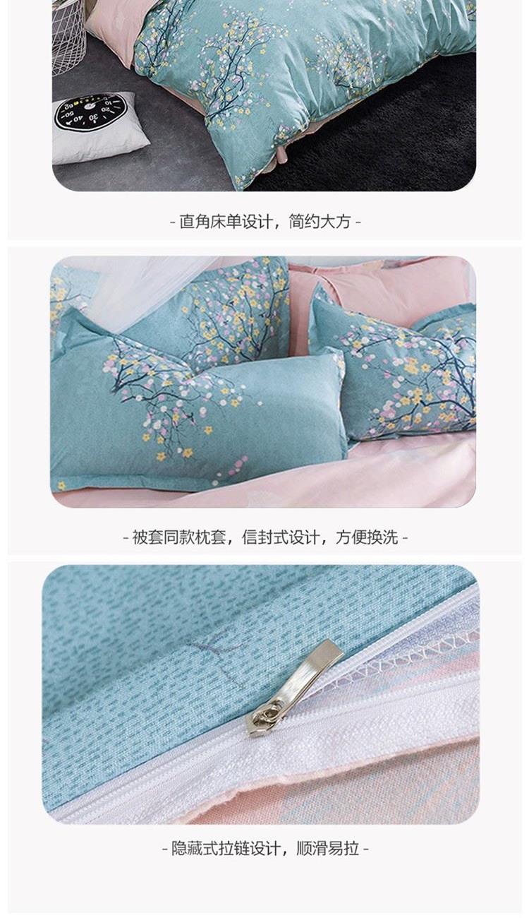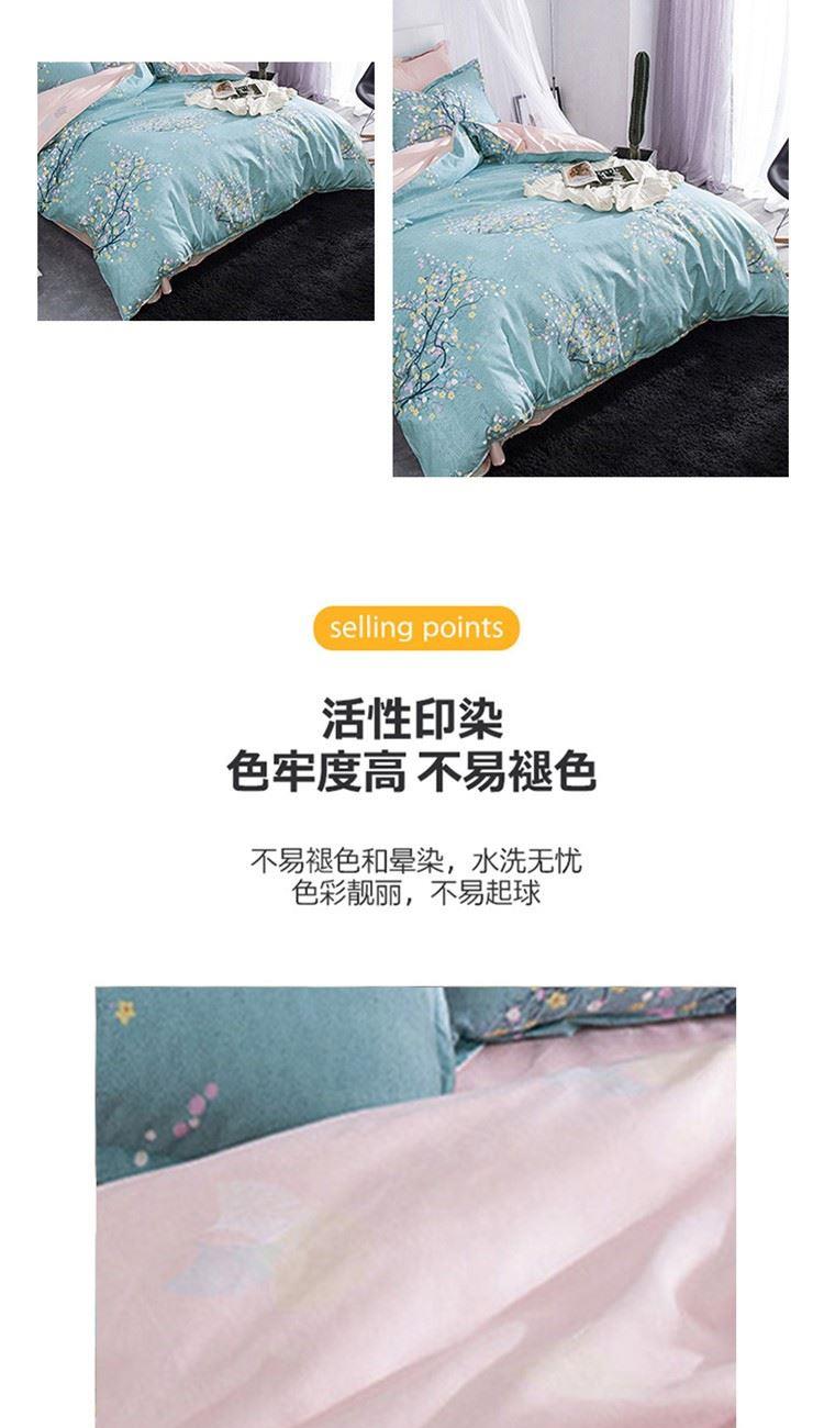 规格: 床单:230*230cm±5cm 被罩:200*230cm 枕套:48*74cmx2 面料:澳绒磨毛(聚酯纤维) 1.甄选亲肤舒适磨毛面料制作,透气吸湿,更加细腻柔软 2.小清时尚型,点亮家居生活 3.活性印染工艺,绿色健康,色牢度高,不易褪色,不易起球