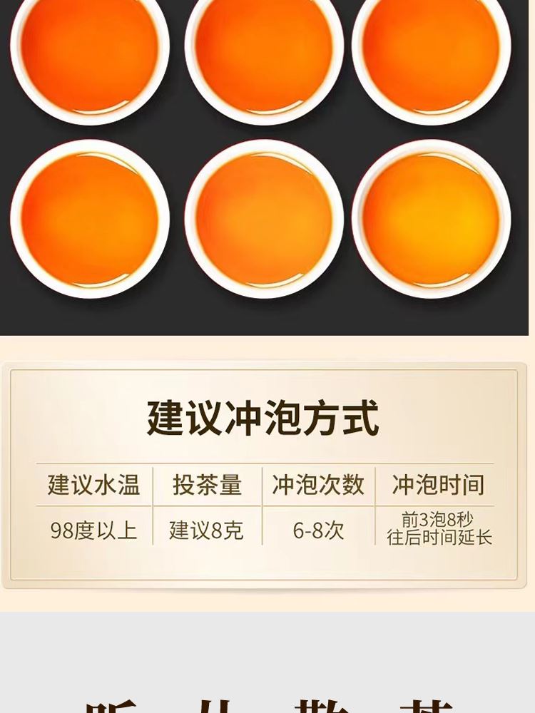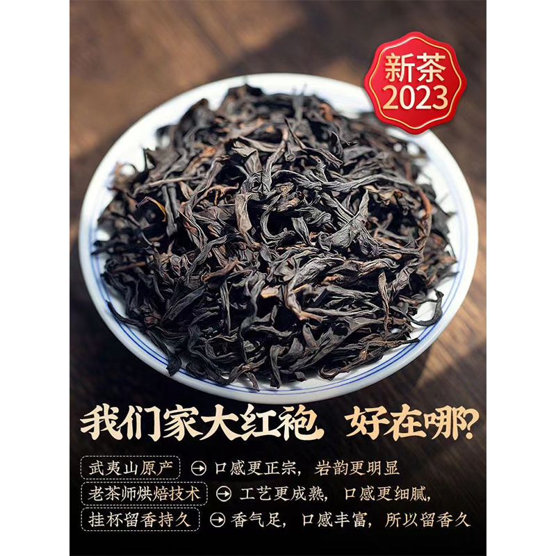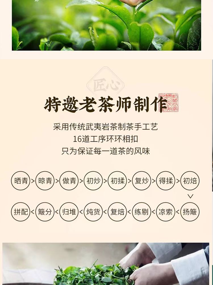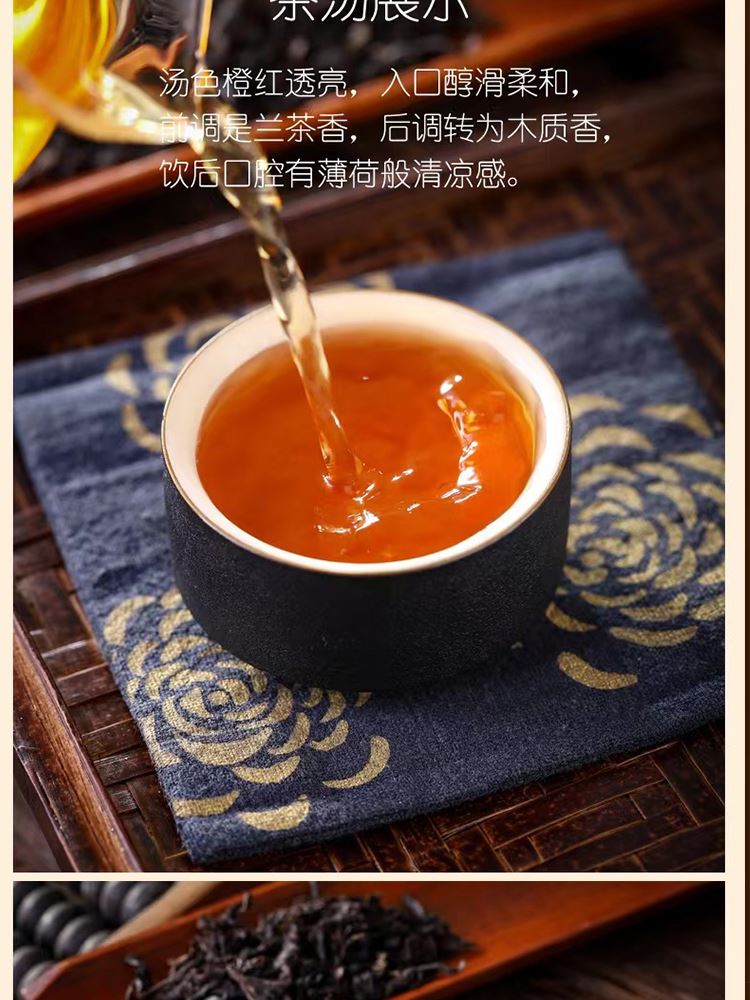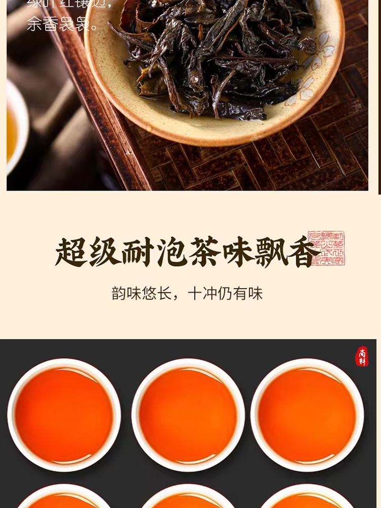 大红袍产于福建武夷山,属于乌龙茶,其外形条索紧结,色泽绿褐鲜润,冲泡后汤色橙黄明亮,叶片红绿相间。大红袍的香气馥郁,具有兰花香,且“岩韵”明显,此外,大红袍的耐泡性极强,冲泡七、八次仍有香味。 大红袍的口感醇厚且甘甜,带有轻微的涩感,但回甘迅速,口腔留香持久,香气高扬,花香与果香交织,汤色橙黄明亮! 【重量】:250g(31小泡) 【配件】:小泡茶+礼盒+手提袋 【口味】:清香型 【产地】:福建·武夷山