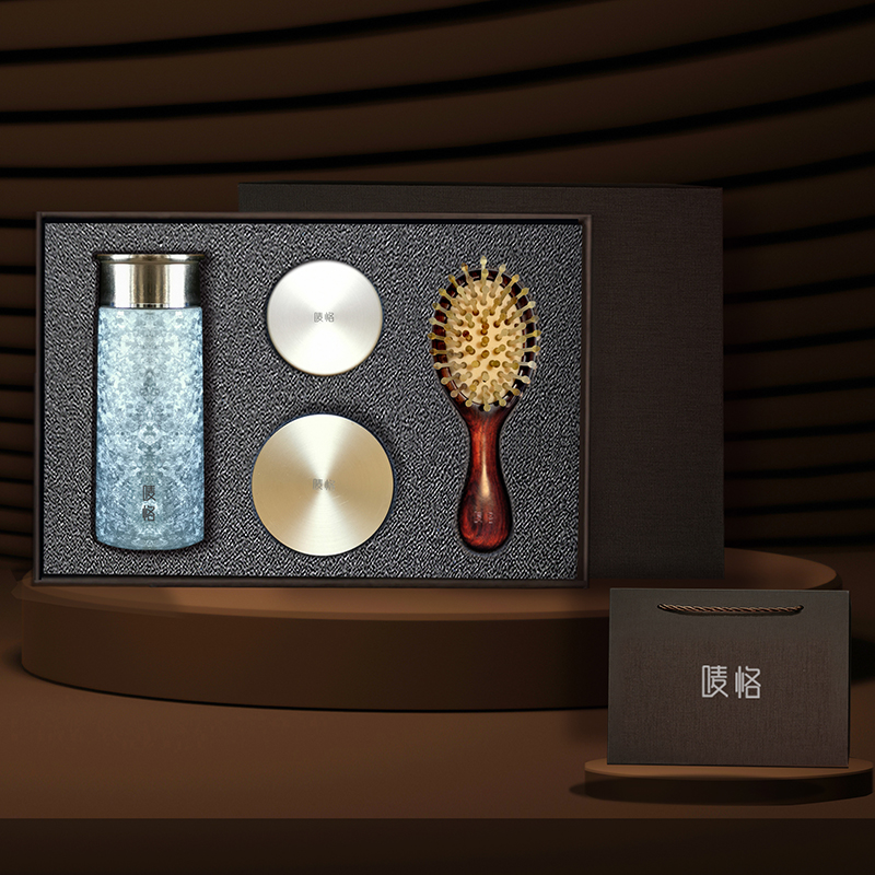 主要材质:老羊角、檀木、纯钛、黄铜 产品:纯钛保温杯、香熏炉二件、老羊角气垫梳 薰香炉尺寸:68*28MM 储香罐尺寸:55*18MM(配香) 气垫梳尺寸:160*60MM 纯钛杯尺寸:160*60MM 纯钛杯容量:260ML 包装尺寸: 290*205*75MM