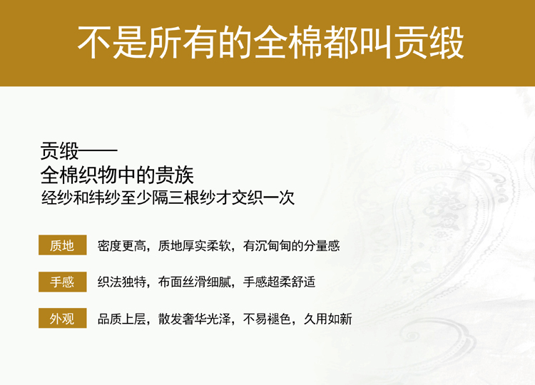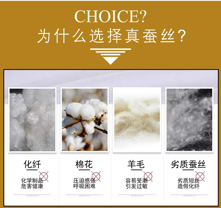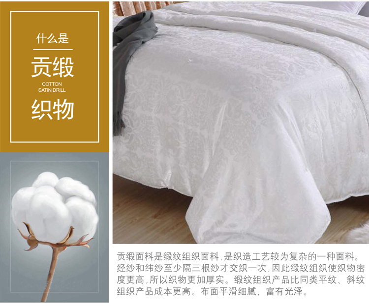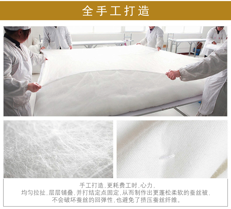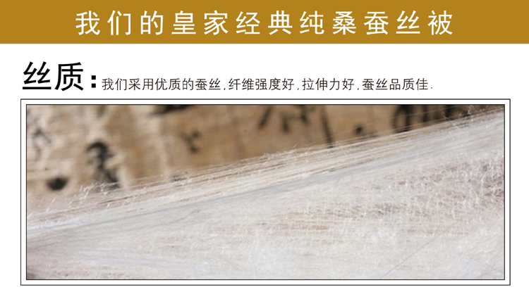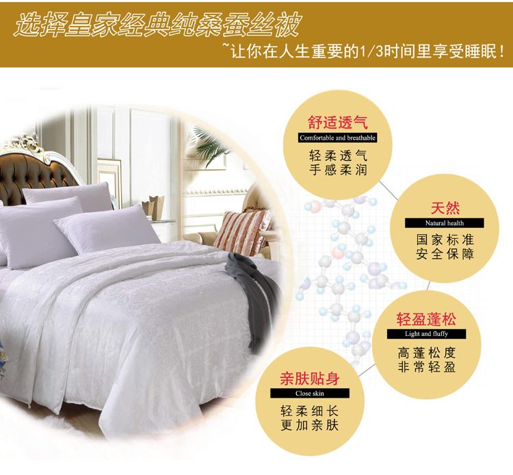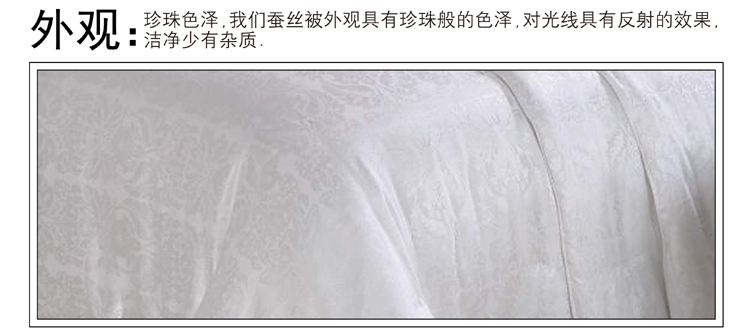 尺寸:200x230cm 填充物:1000g 被重:2500g 【面 料】60支全棉贡缎大提花 【填充物】纯桑蚕丝 产品特点: 1.优质桑蚕丝填充,含有丰富丝素蛋白,多种氨基酸,,洁净舒适,尽享睡眠spa; 2.全棉大提花面料,柔滑如丝,莹润有光泽,低调奢华; 3.桑蚕丝,无添加,更环保,蓬松轻柔,贴身抱合力强; 4.纯手作蚕丝精品,支持多种规格,重量定制。