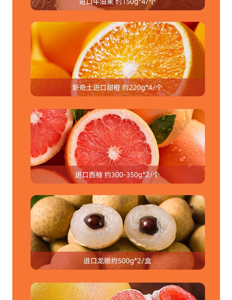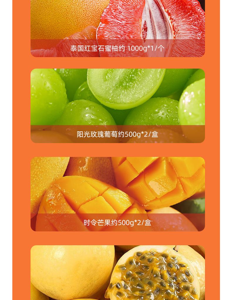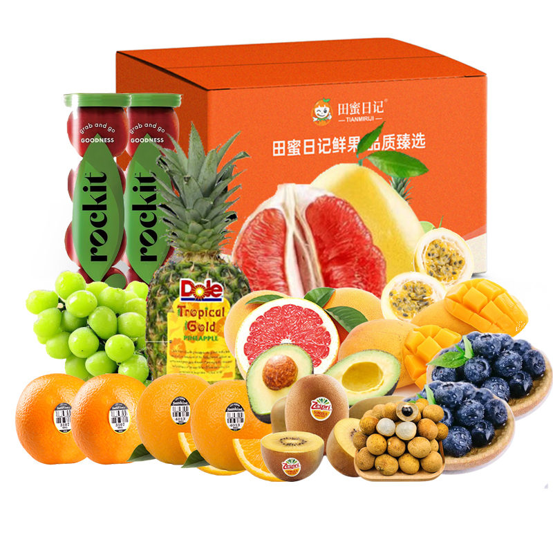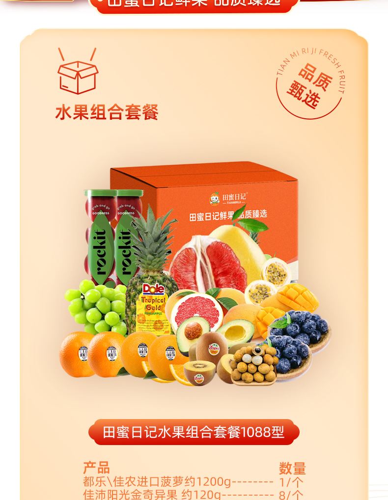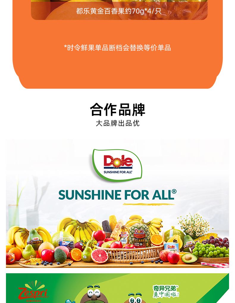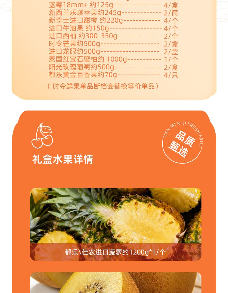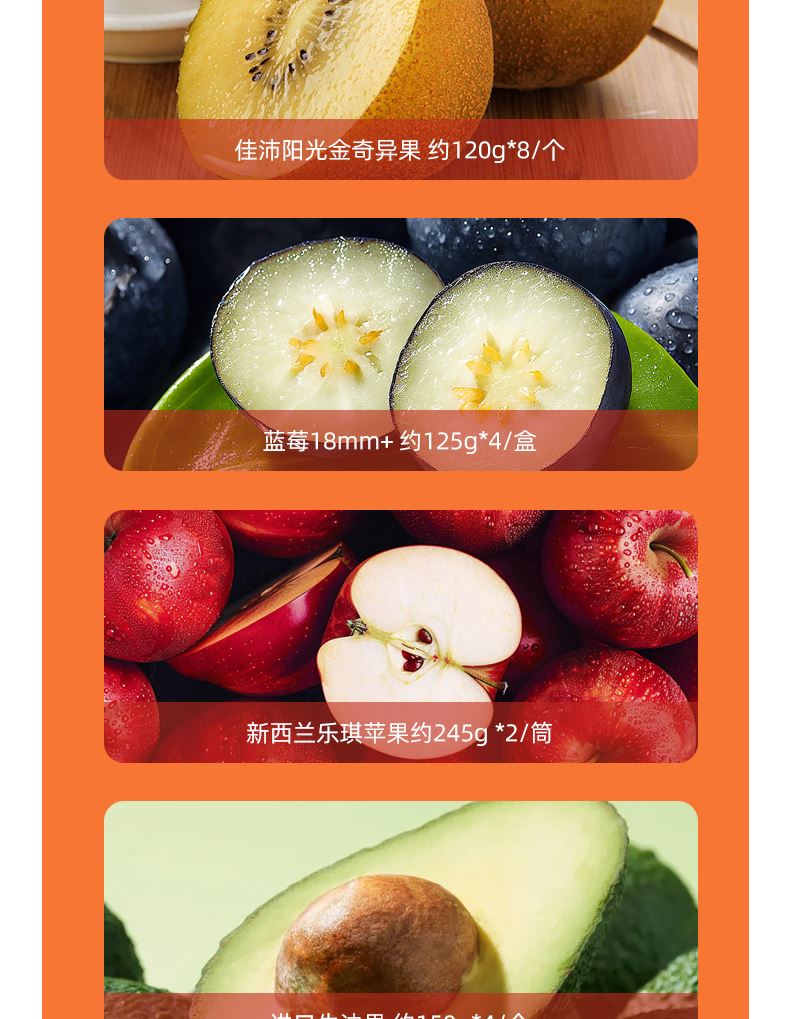 "都乐\佳农进口菠萝约1200g*1/个 佳沛阳光金奇异果 约120g*8/个 蓝莓18mm+ 约125g*4/盒 新西兰乐琪苹果约245g *2/筒 新奇士进口甜橙 约220g*4/个 进口牛油果 约150g*4/个 进口西柚 约300-350g*2/个 时令芒果约500g*2/盒 进口龙眼约500g*2/盒 泰国红宝石蜜柚约 1000g*1/个 阳光玫瑰葡萄约500g*2/盒) 都乐黄金百香果约70g*4/只 ( 时令鲜果单品断档会替换等价单品)"