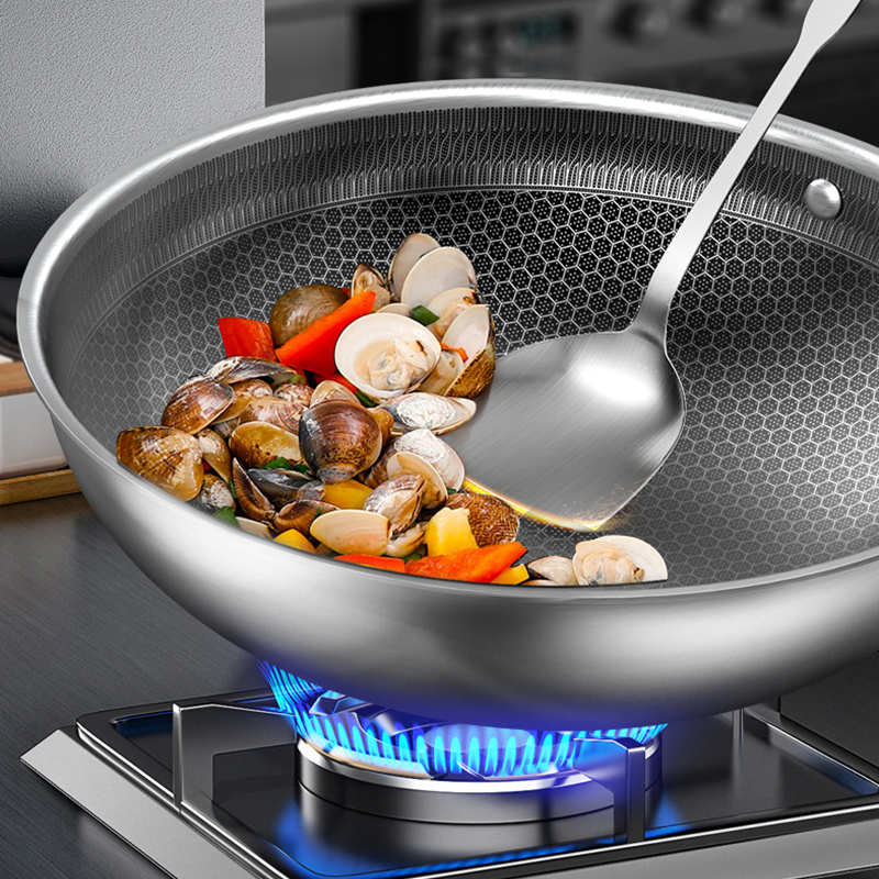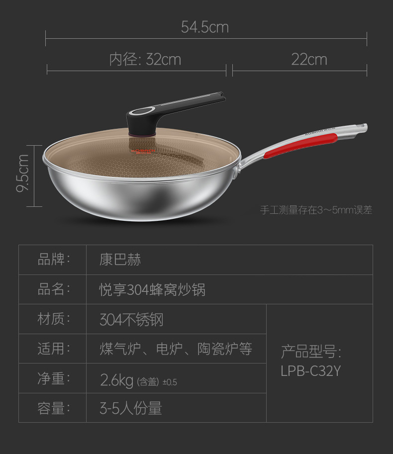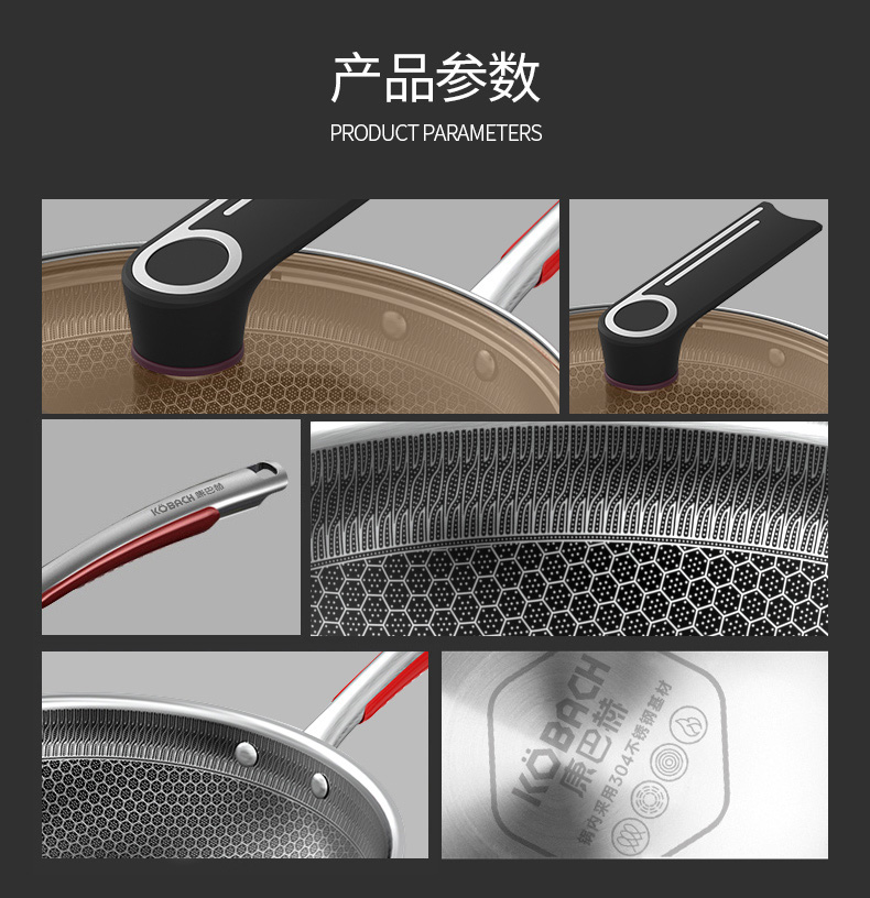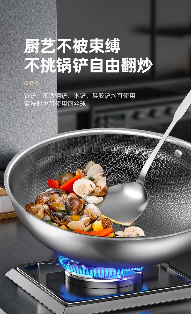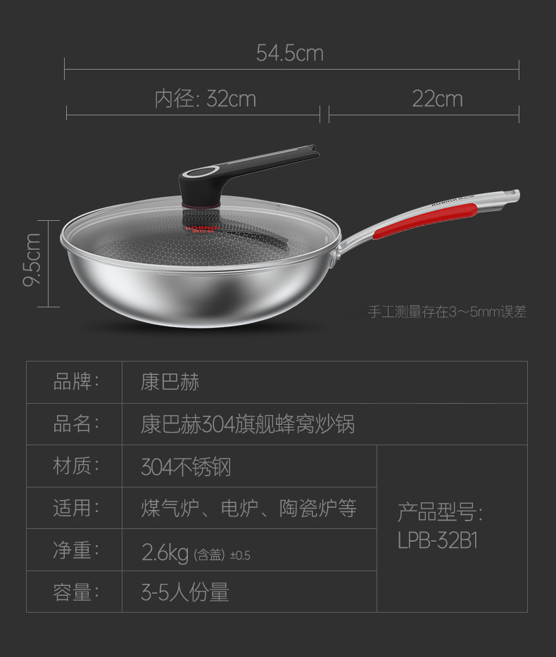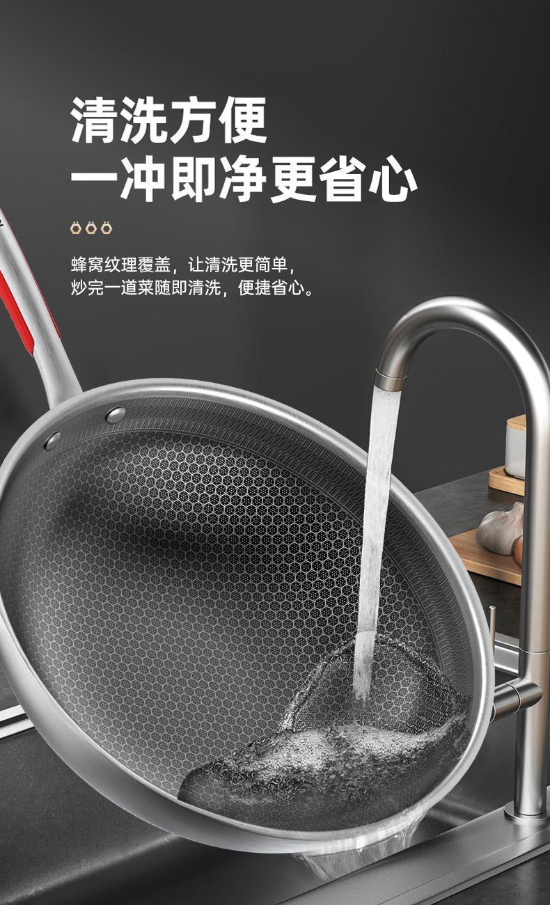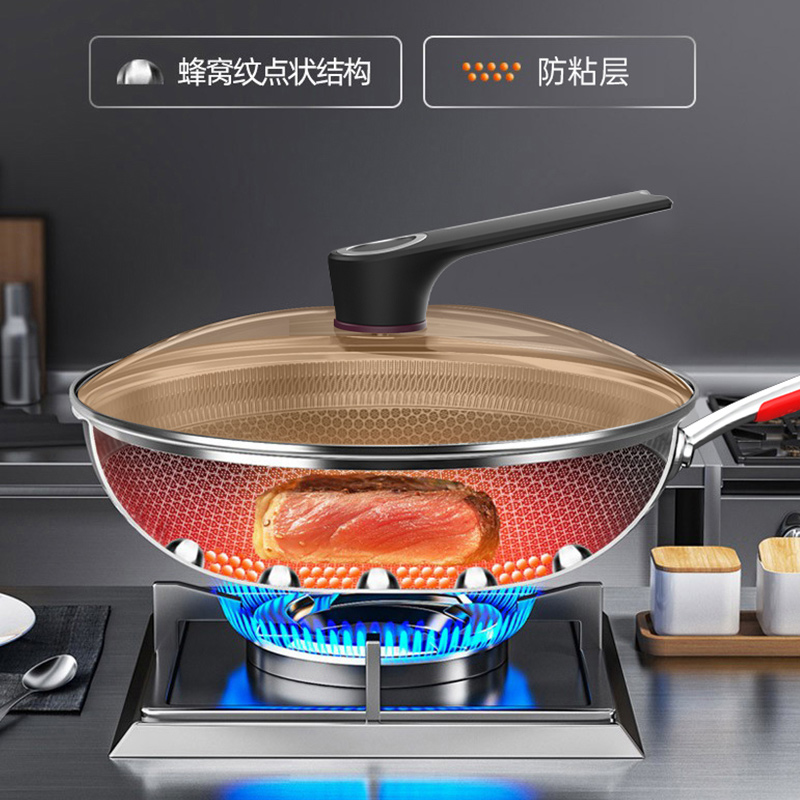 规格:32cm 重量:2.8KG 包装尺寸:57.4*39.4*78cm ◎锅身采用3层特殊工艺及材料制作,均匀加热,锅底不变形并导热迅速,将热能传递到锅身; ◎蜂窝纹的点线之间会产生一层水蒸气膜,在高温的作用下食用油与水蒸气共同加热,避免更多的油烟产生; ◎蜂窝结构和纳米不粘技术的结合使不粘无烟效果达到一个新高度; ◎304不锈钢作为公认的食用级健康材质,可以完好地保留食材原汁原味; ◎可立锅盖,方便、卫生;可视玻璃盖,透明烹饪看得见; ◎解决清洗难题,不生锈,炒完一道菜随即清洗,便捷省心。