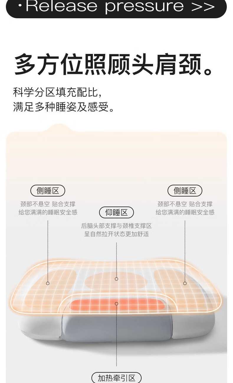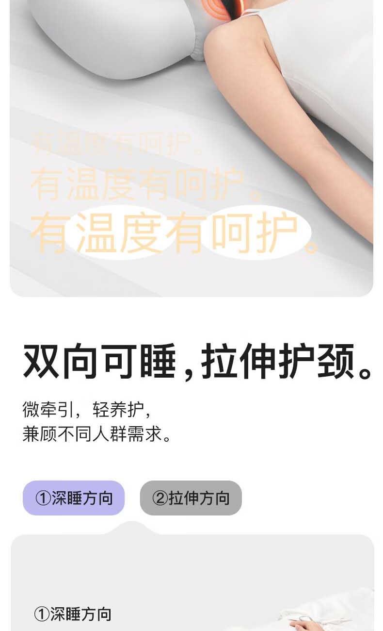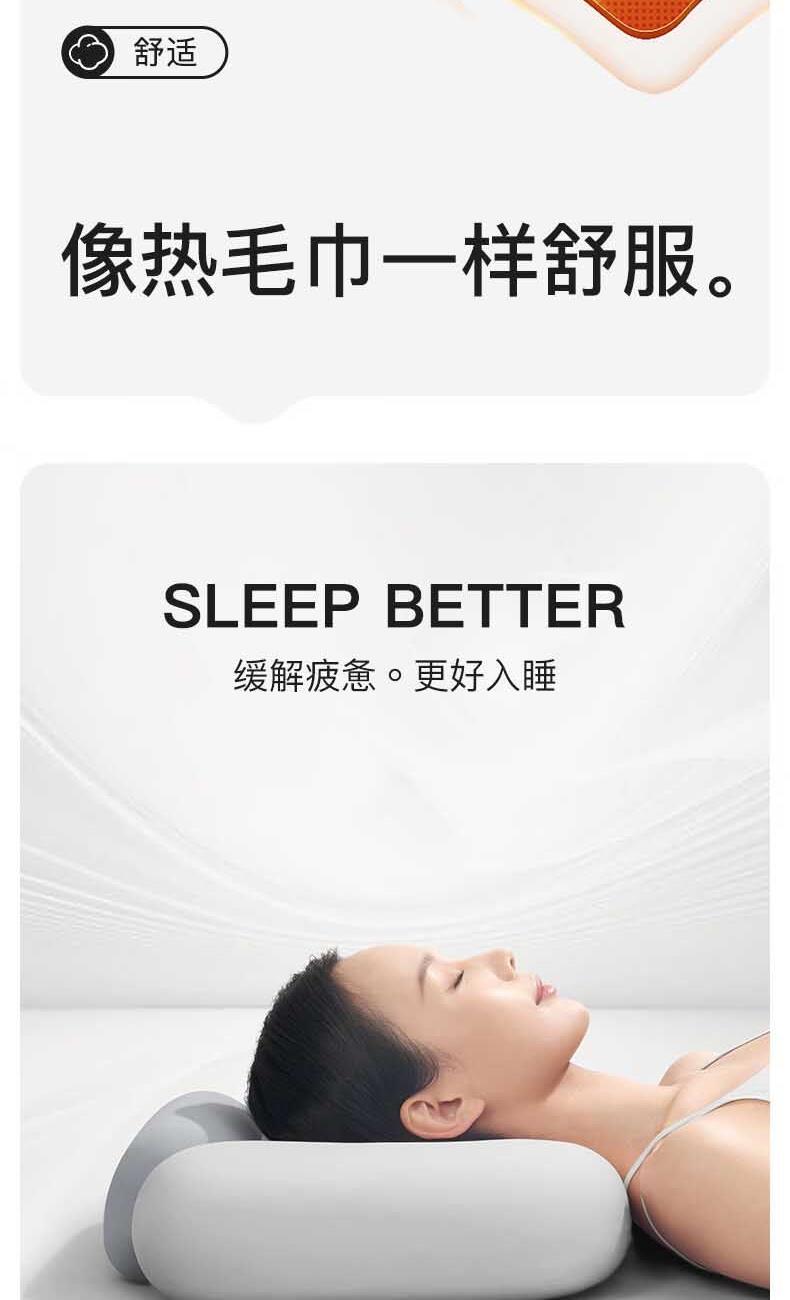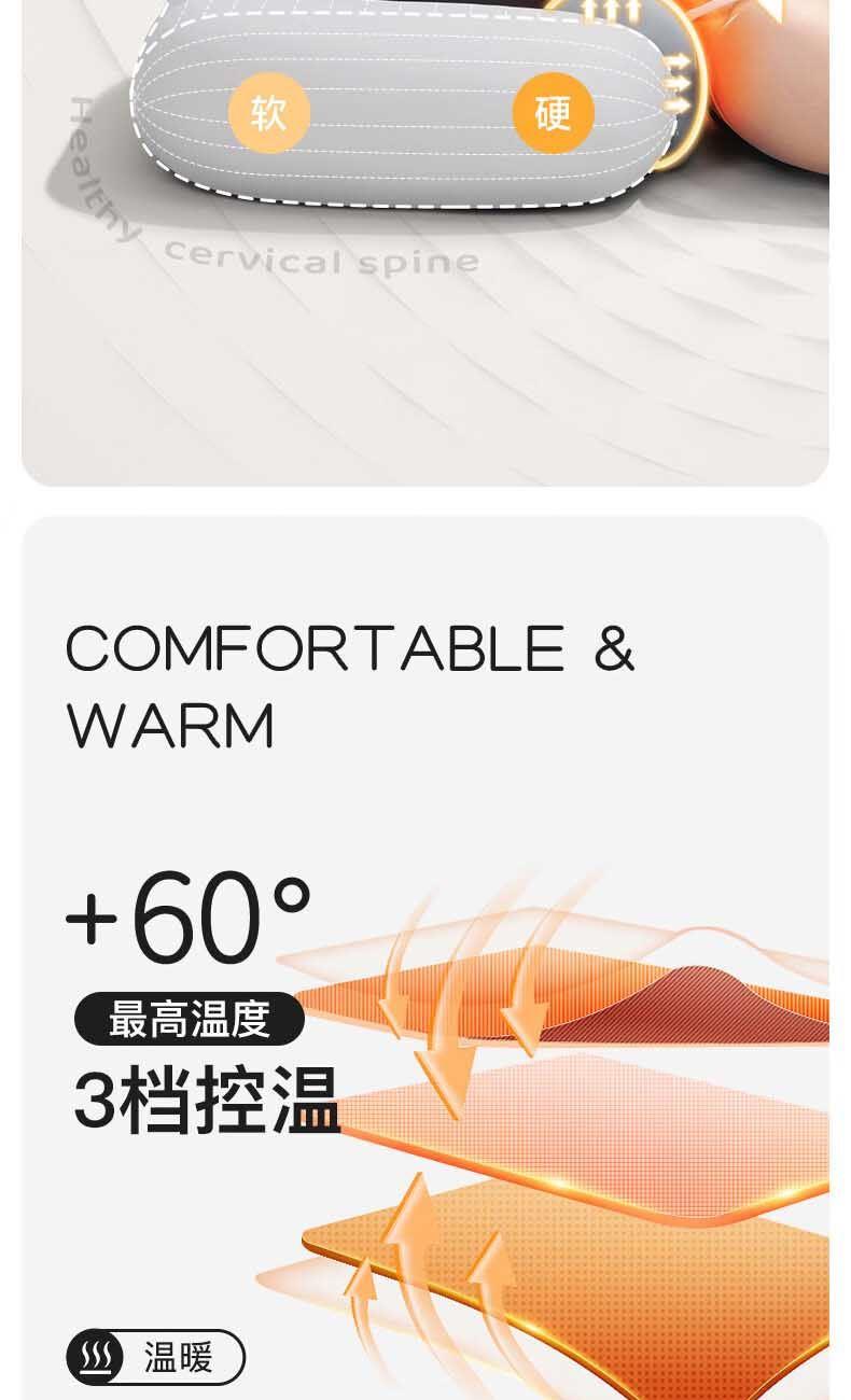 【科学分区】满足多种睡姿及感受。 【面料柔弹】面料升级,柔弹舒适。 【双向可用】一侧可加热拉伸,一侧熟睡。 【3档控温】高温65°像热毛巾一样舒服。 【人体工学设计】有效减缓压力, 自然深睡。