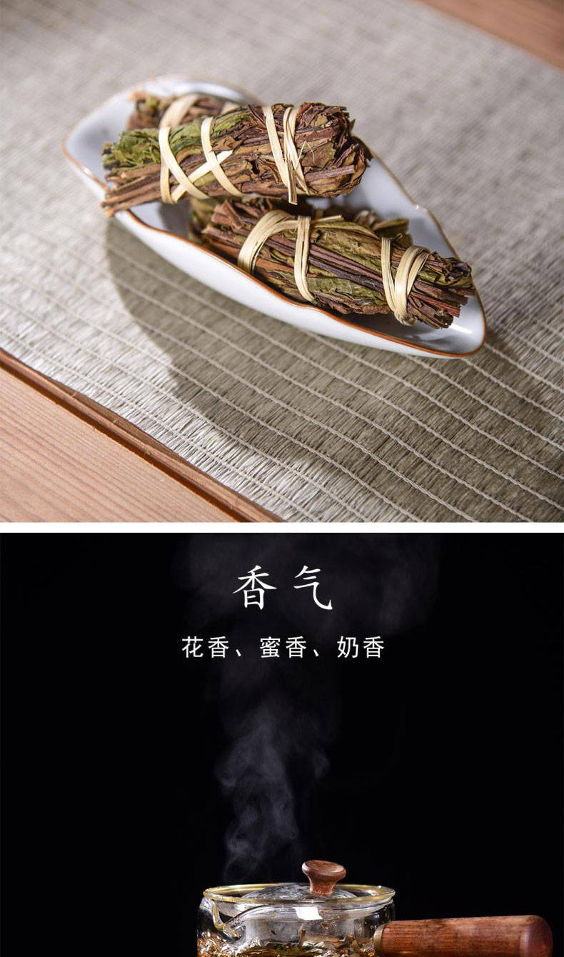 3.采用竹条人工捆扎;浓郁花蜜香与清淡奶香;滋味清甜、鲜爽、香落水、回甘显;叶底枝叶相连,肥厚柔软。