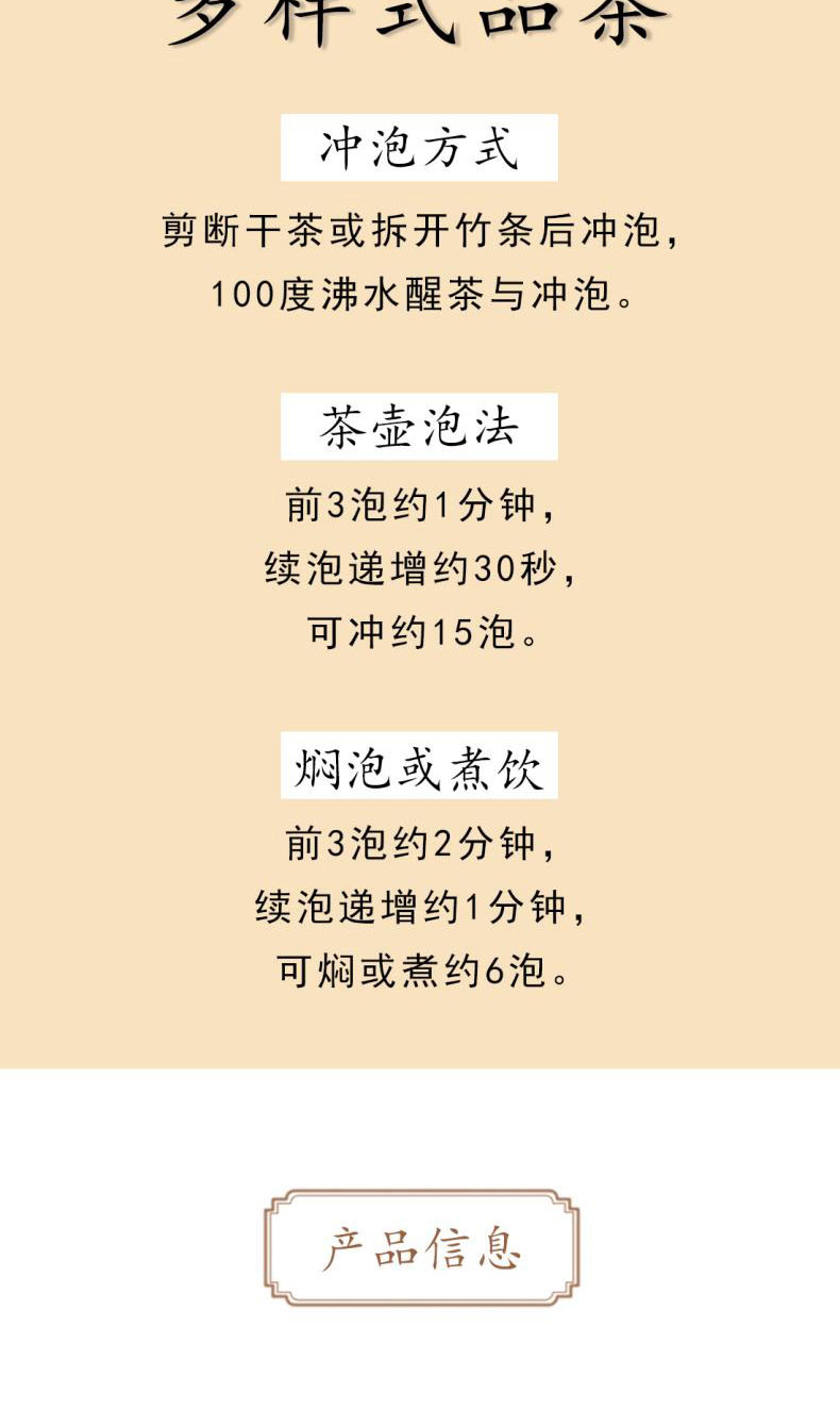 4.剪断竹条后冲泡,100度水,前3泡约1分钟,续泡递增约30秒。久泡不苦涩,也适合焖、蒸或煮等品饮方式。