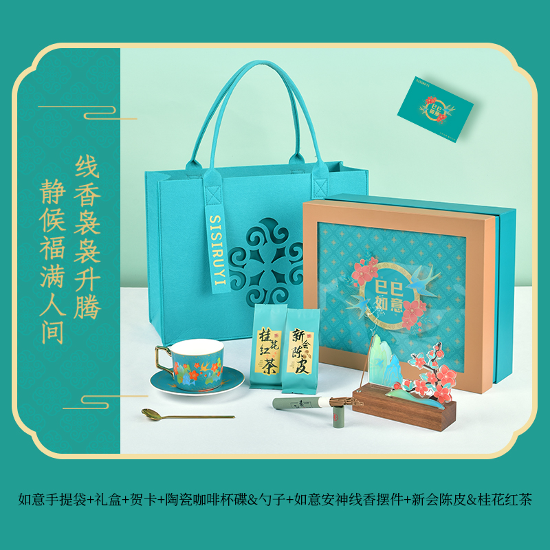如意毛毡包*1 相框型主题礼盒*扉页*1 精致陶瓷咖啡杯碟&勺子* 新会5年陈皮*1 桂花红茶*1 乌沉香安神线香*1 主题贺卡*1