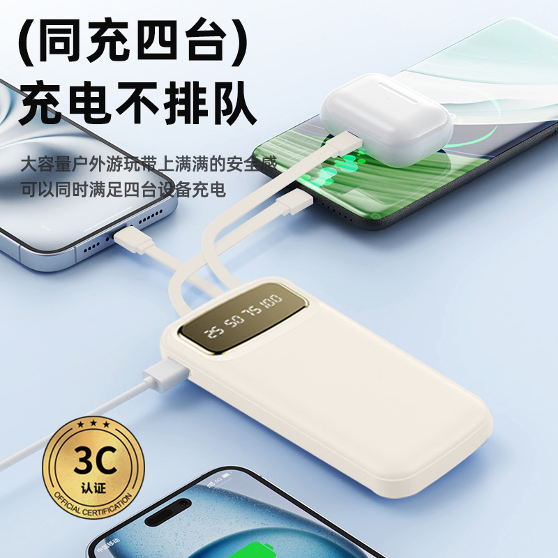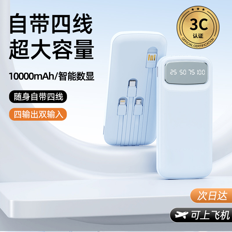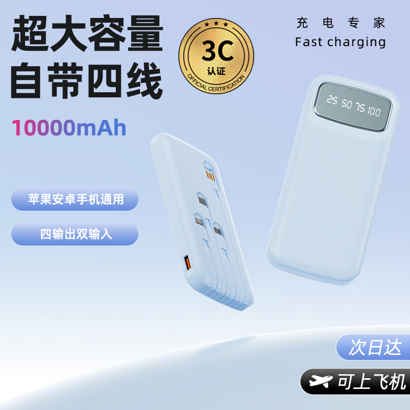 10000毫安内置线移动电源R107K 颜色:米色 紫色 黑色 蓝色 材质:ABS 容量:10000毫安 包装:彩盒包装 【推荐理由】: 数字电量显示 内置四线满足各种手机充电 10000毫安实际容量,3C认证 符合民航局标准,可随身携带