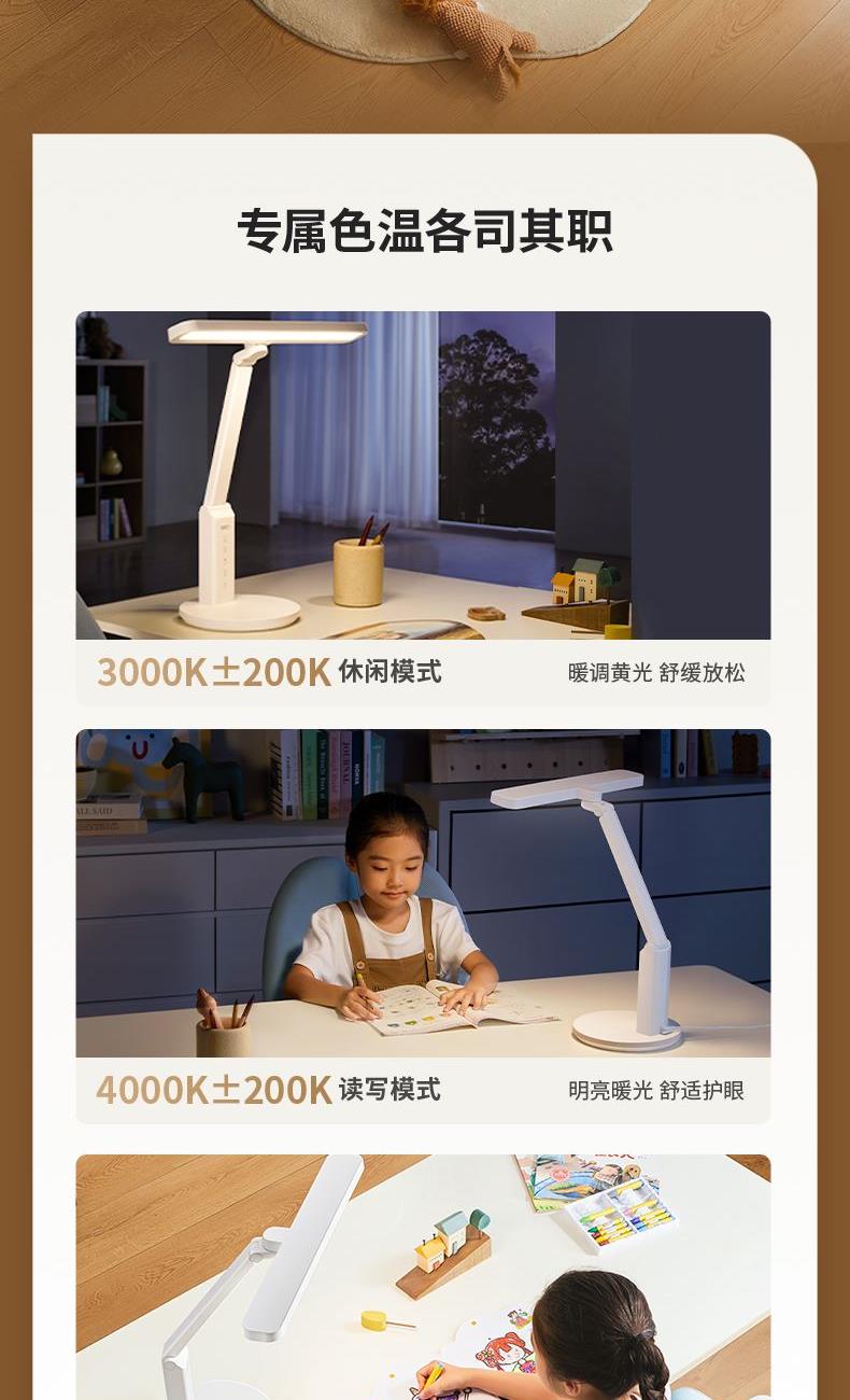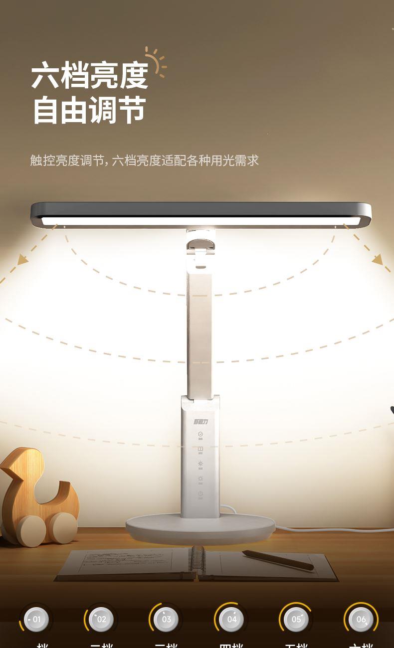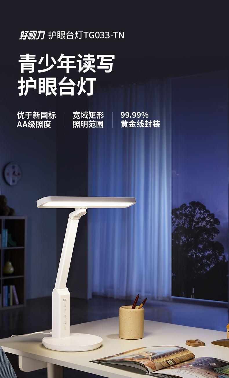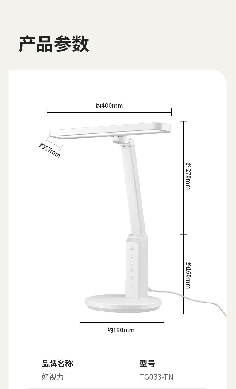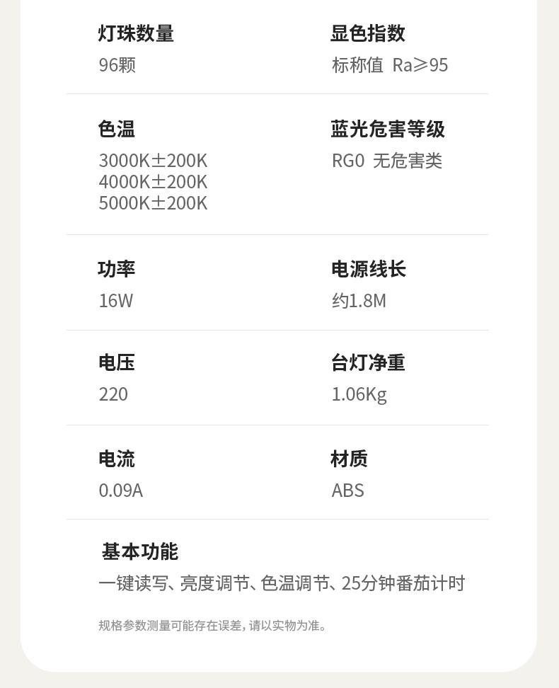 灯珠数量:96颗 色温: 3000K士200K 4000K士200K 5000K士200K 功率:16W 电压:220 电流:0.09A 型号:TG033-TN 显色指数:标称值 Ra≥95 蓝光危害等级:RG0 无危害类 电源线长:约1.8M 台灯净重:1.06Kg 材质:ABS