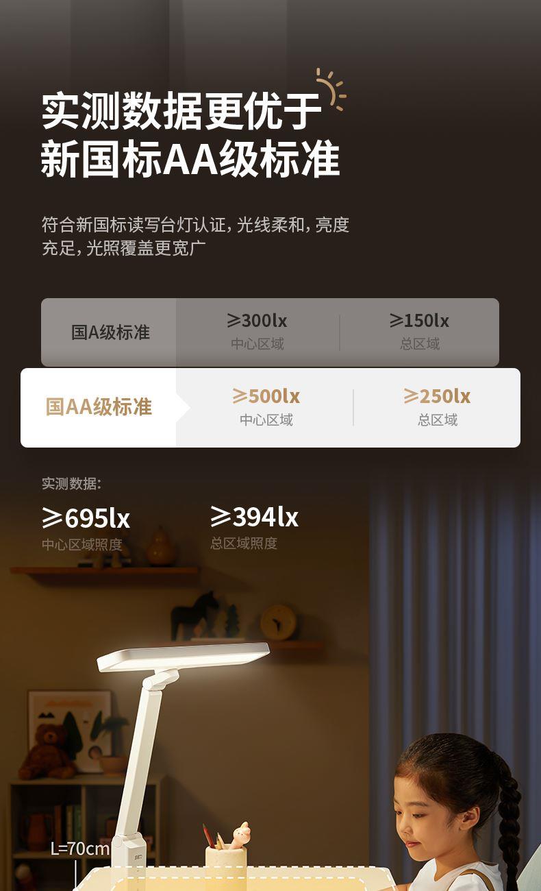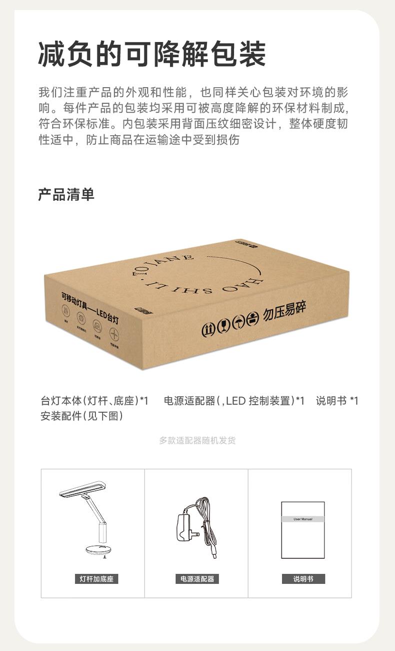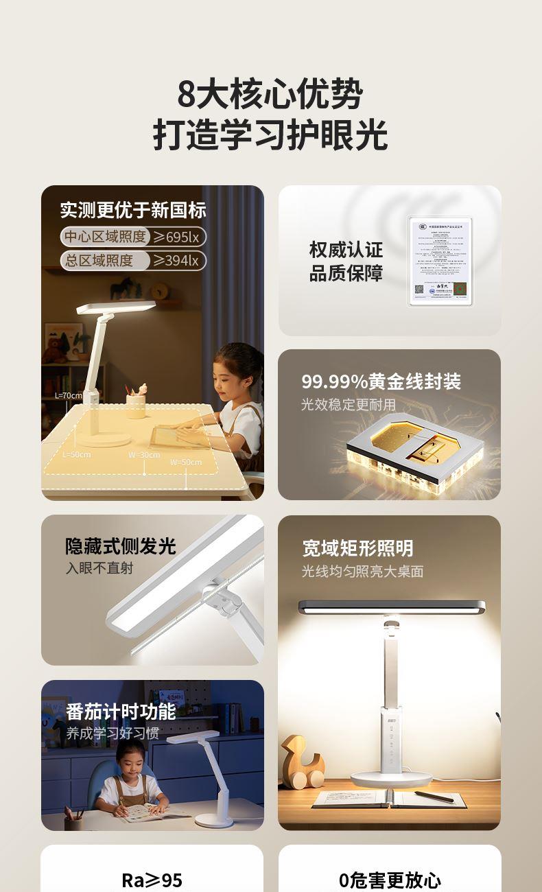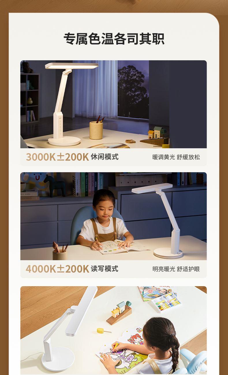 灯珠数量:96颗 色温: 3000K士200K 4000K士200K 5000K士200K 功率:16W 电压:220 电流:0.09A 型号:TG033-TN 显色指数:标称值 Ra≥95 蓝光危害等级:RG0 无危害类 电源线长:约1.8M 台灯净重:1.06Kg 材质:ABS
