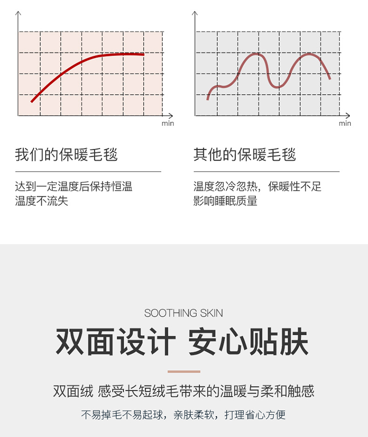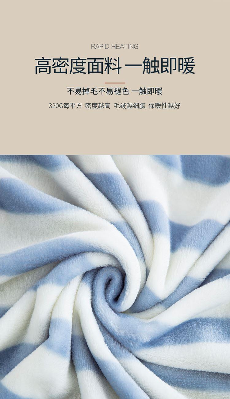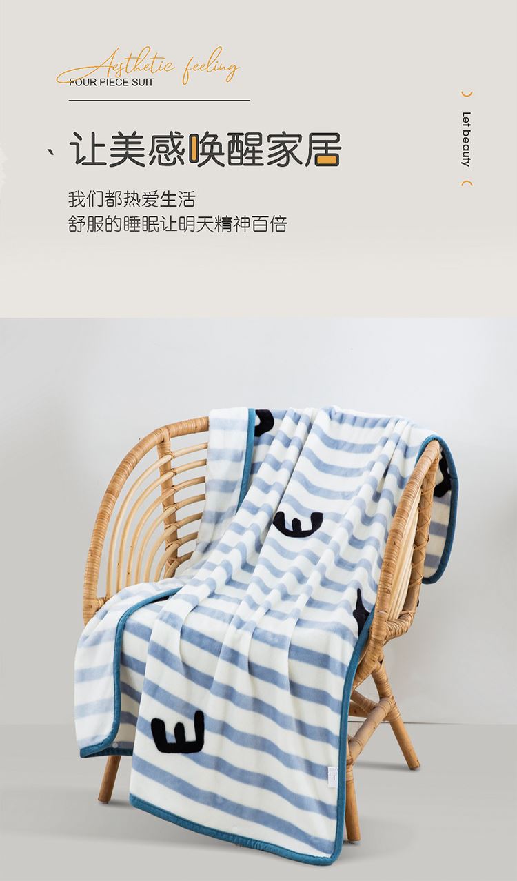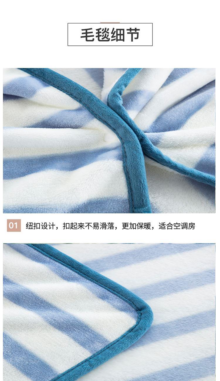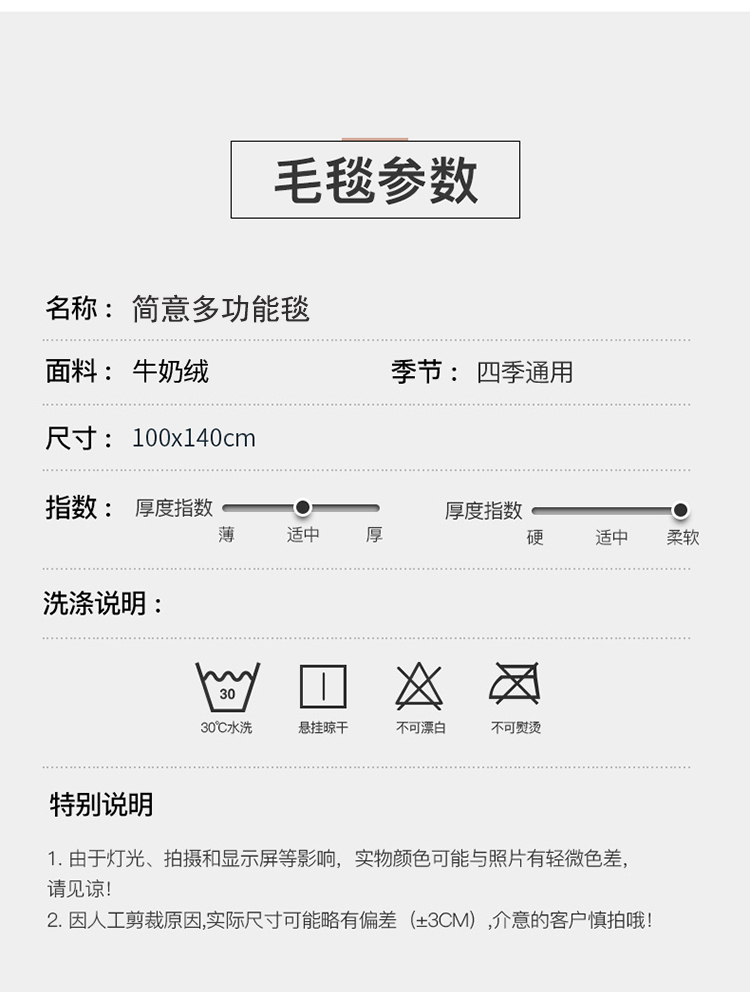 规格:100*140cm 面料:宝宝绒 克重:450g 产品包装:精美礼盒 包装尺寸:30*29*13cm 1.宝宝绒面料手感好,光滑柔软,易于清楚。 2.宝宝绒是一种独特的面料,非常适用在贴近皮肤。