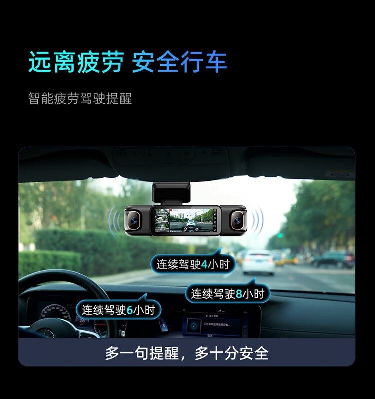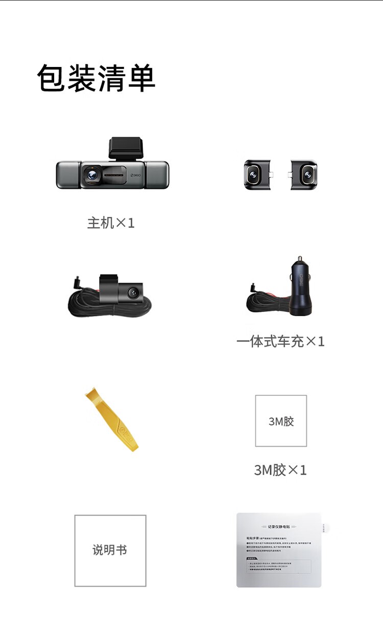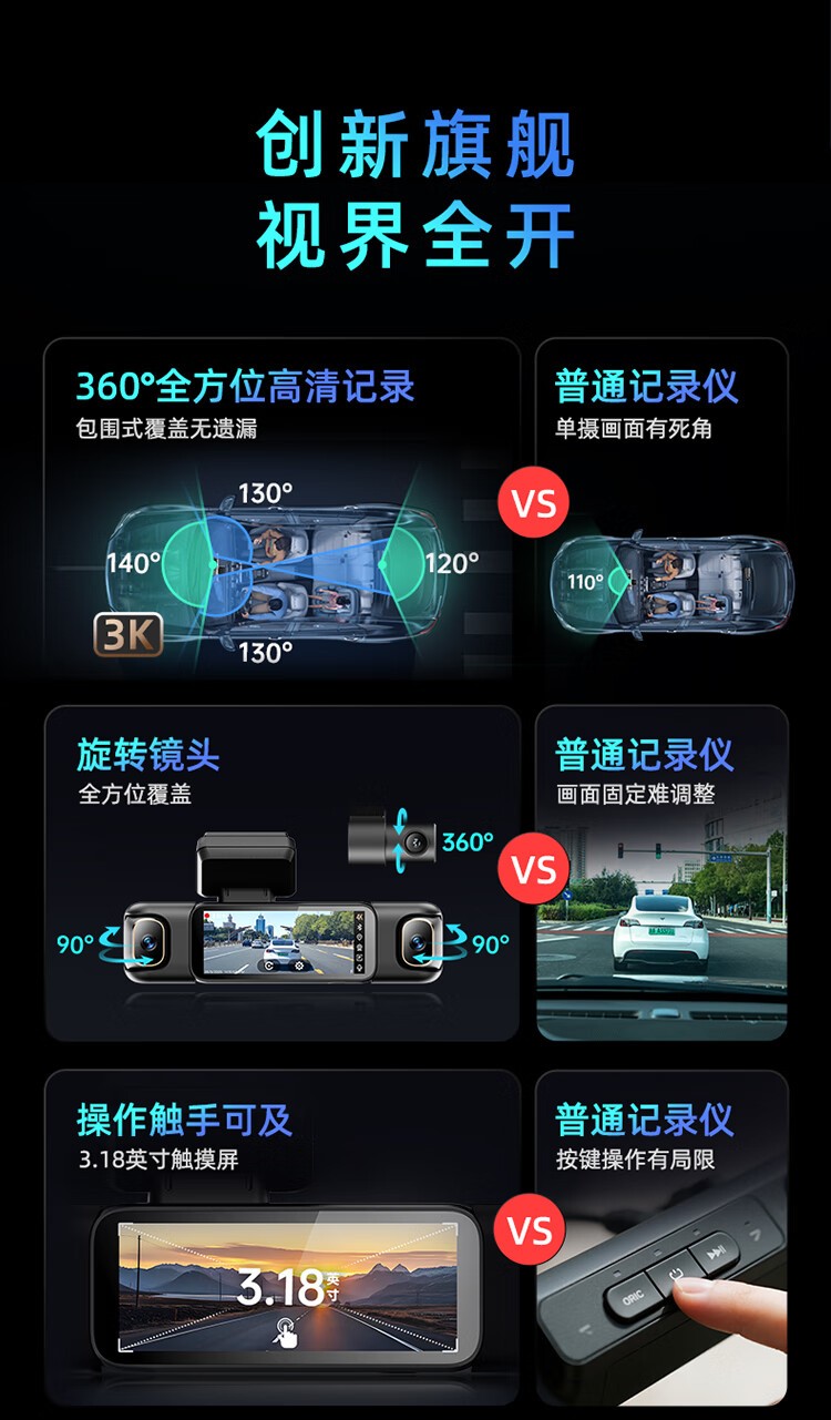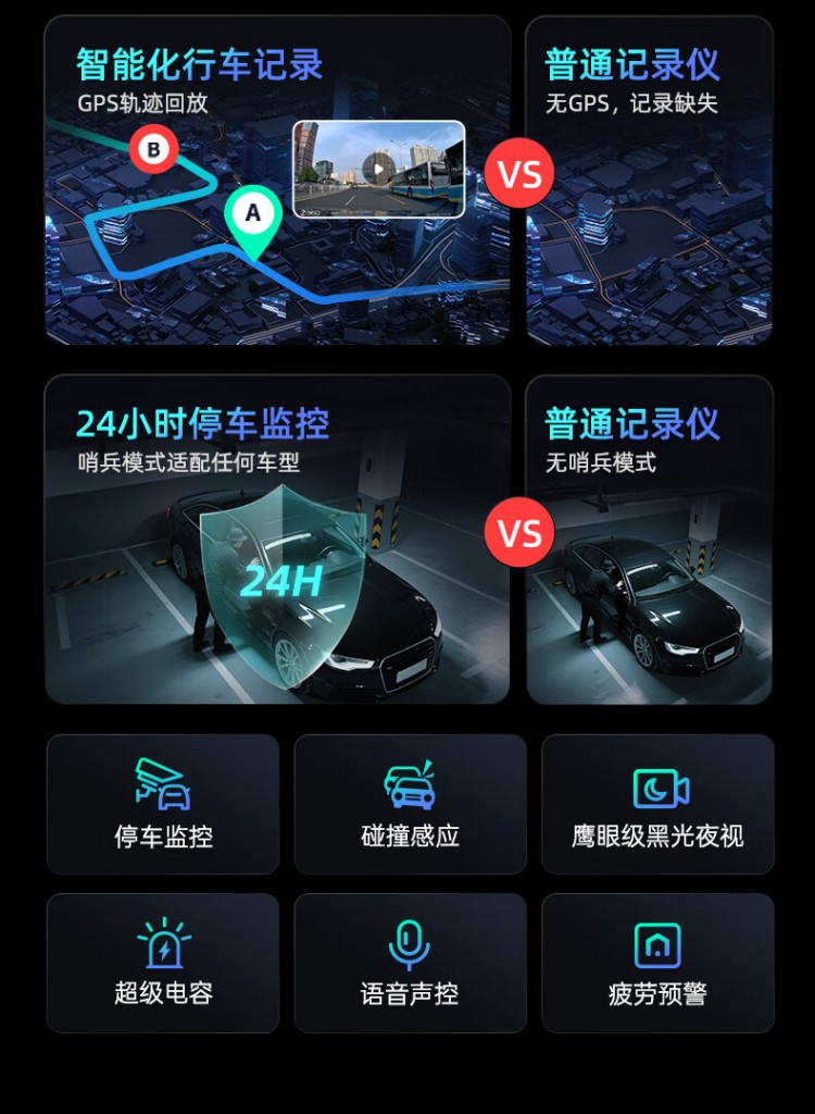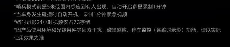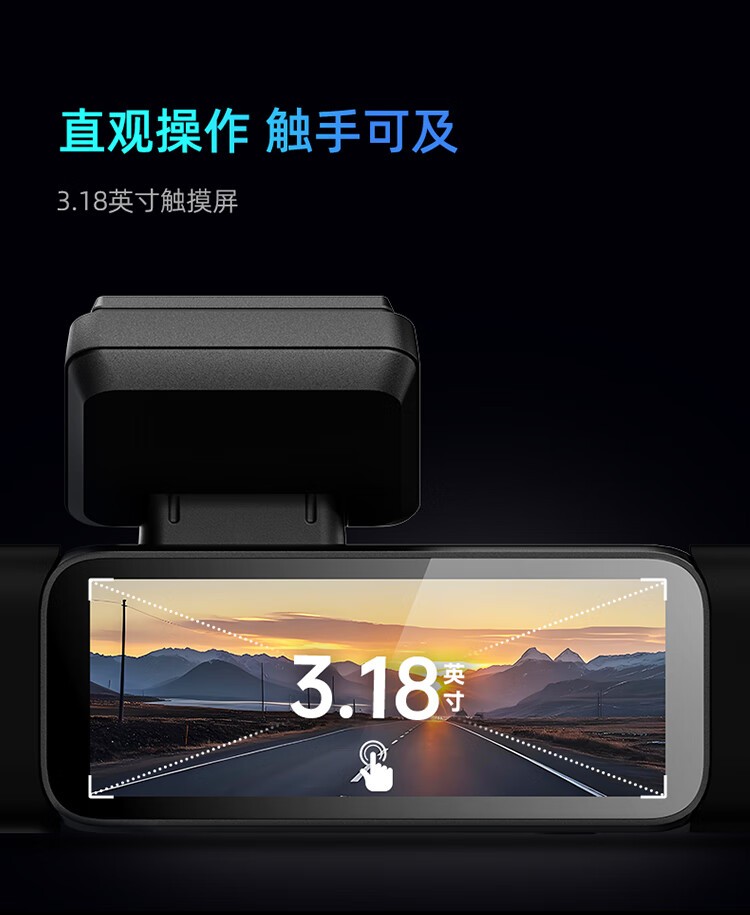 产品参数: 1、500W像素、1620Pp 分辨率、140°广角、F1.8光圈、3.18英寸屏幕 2、重量:0.81kg、产品尺寸:175*110*135mm、 产品功能: 1、3.18英寸高清显示触控大屏,驾驶环境全局展现,前后双录。 2、3K+超清画质,星光夜视,F1.8大光圈夜晚自动提升光感度 3、鹰眼车牌追踪,清晰捕捉车牌,锁定关键证据。 4、24小时停车监控+震动感应系统,守护不分昼夜(需配降压线Type-C接口) 5、GPS行车轨迹回放,0流量查看/下载行车视频,一键分享行车生活。 6、AI智能语音操控,可通过语音指令实现录像、拍照等操作,无需动手 7、手机APP连接,可实时手机观看、回看、分享、社交
