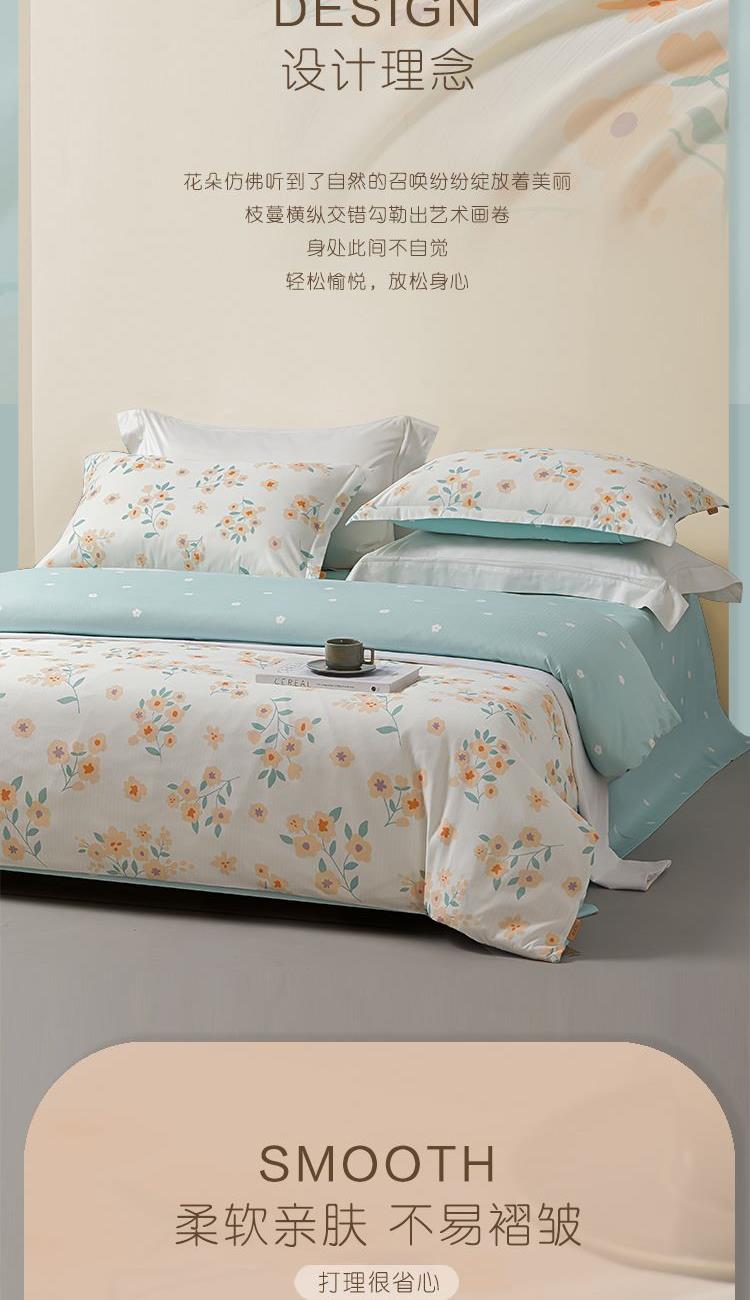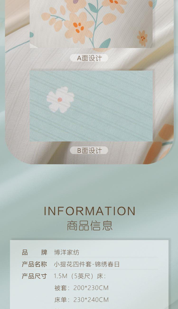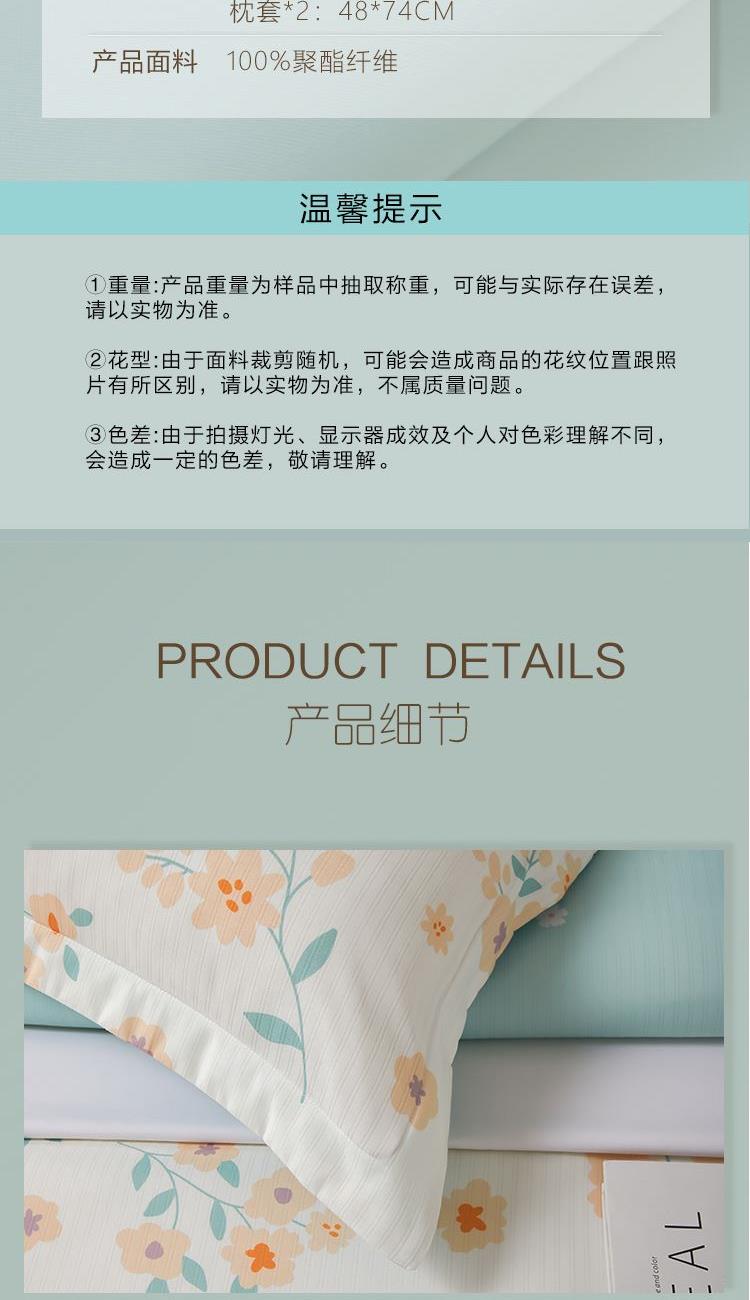 产品规格:1.5m(5英尺)床: 被套:200*230cm 床单:230*240cm 枕套*2:48*74cm 产品材质:聚酯纤维 1、面料经过特殊后处理,表面有类似棉麻制品的天然纹理,强韧度比普通棉制品更强,手感比常规的棉麻织物更柔软。面料厚薄适中,适合四季使用。 2、温柔的奶黄色,配上简约的花朵,满床的清新碎花,浪漫而温柔,为空间增添春日生机。 3、产品不起球,不褪色,久用如新,呵护健康睡眠。 AB双面设计,一个产品两种体验。