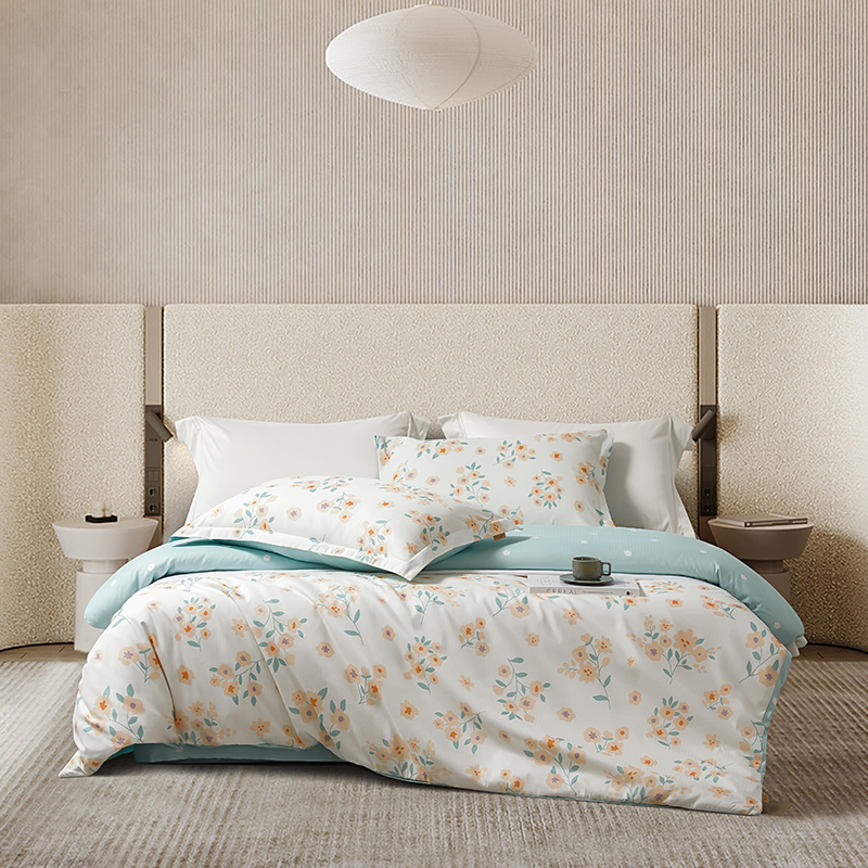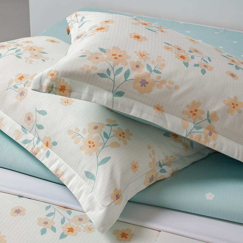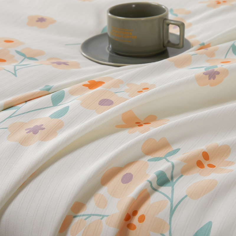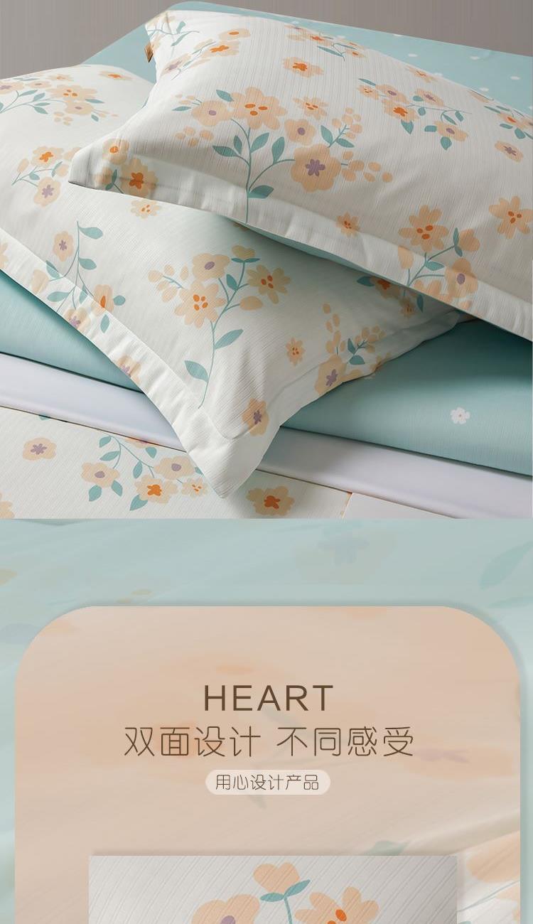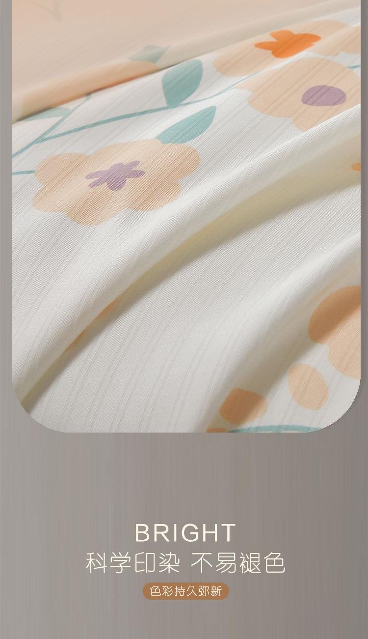产品规格:1.5m(5英尺)床: 被套:200*230cm 床单:230*240cm 枕套*2:48*74cm 产品材质:聚酯纤维 1、面料经过特殊后处理,表面有类似棉麻制品的天然纹理,强韧度比普通棉制品更强,手感比常规的棉麻织物更柔软。面料厚薄适中,适合四季使用。 2、温柔的奶黄色,配上简约的花朵,满床的清新碎花,浪漫而温柔,为空间增添春日生机。 3、产品不起球,不褪色,久用如新,呵护健康睡眠。 AB双面设计,一个产品两种体验。