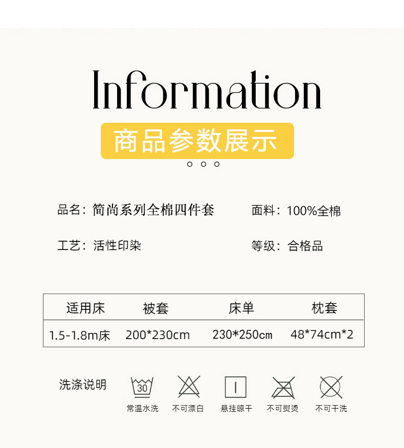 被套:200*230cm 床单:230*250cm 枕套:48*74cm*2 面料:全棉 产品包装:精美礼盒 包装尺寸:42*33*11cm 特点:全棉面料,棉纤维具有较好的吸湿性,纤维可向周围的大气中吸收水分,它接触人的皮肤,使人感到柔软而不僵硬;且耐热能良好,不会损伤纤维。