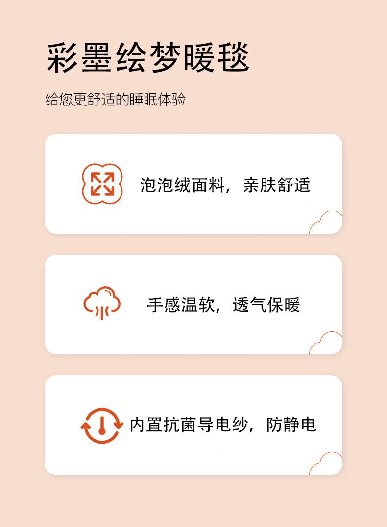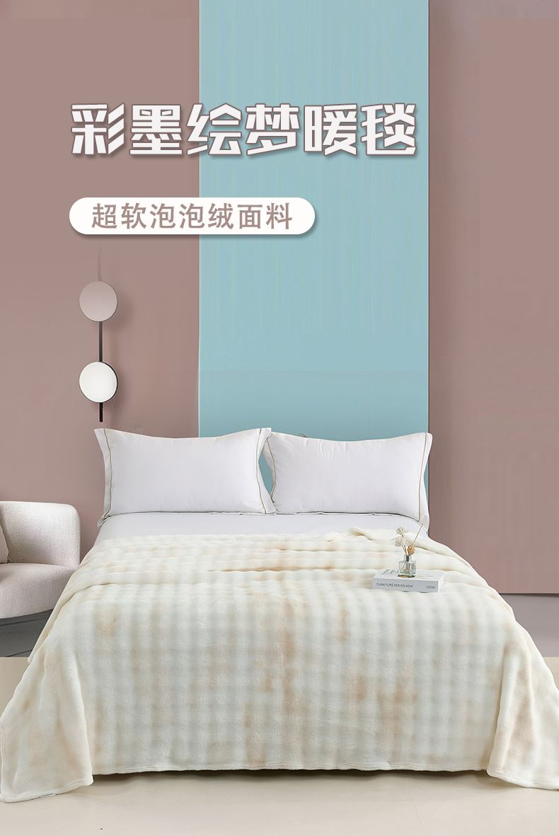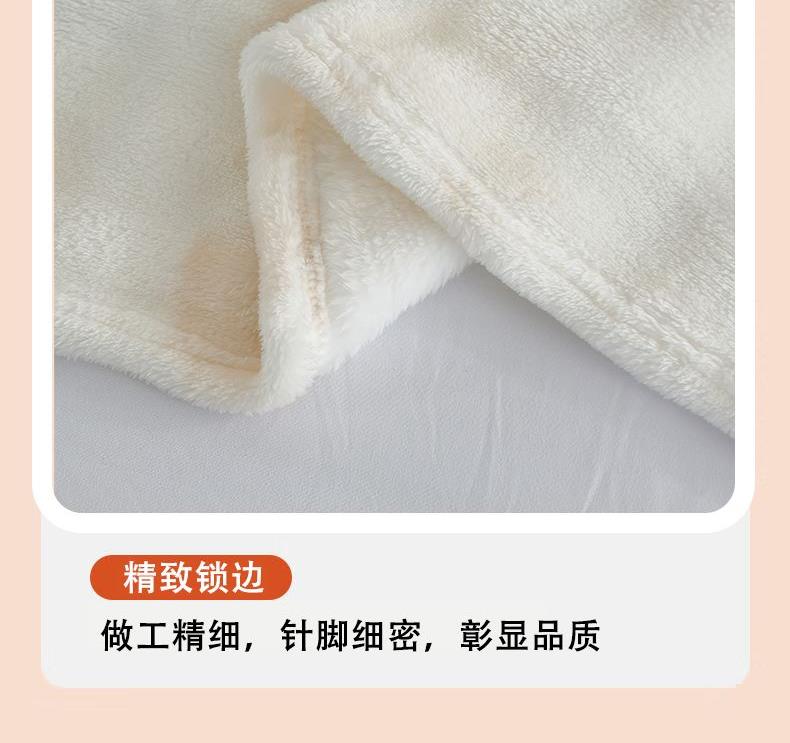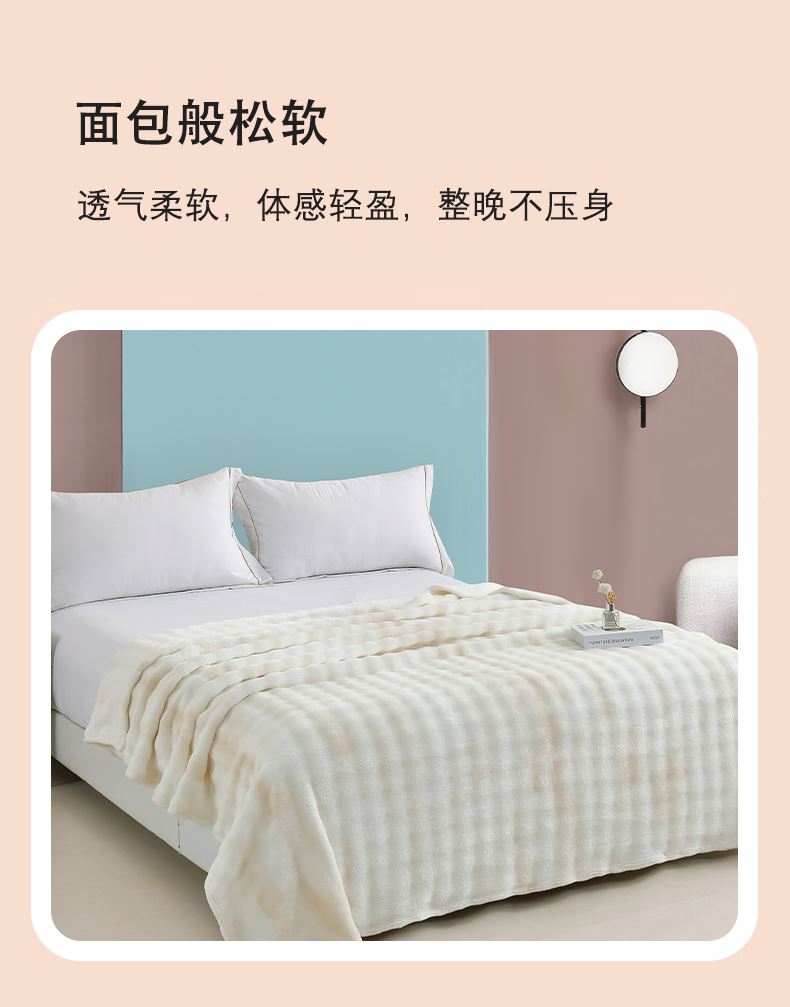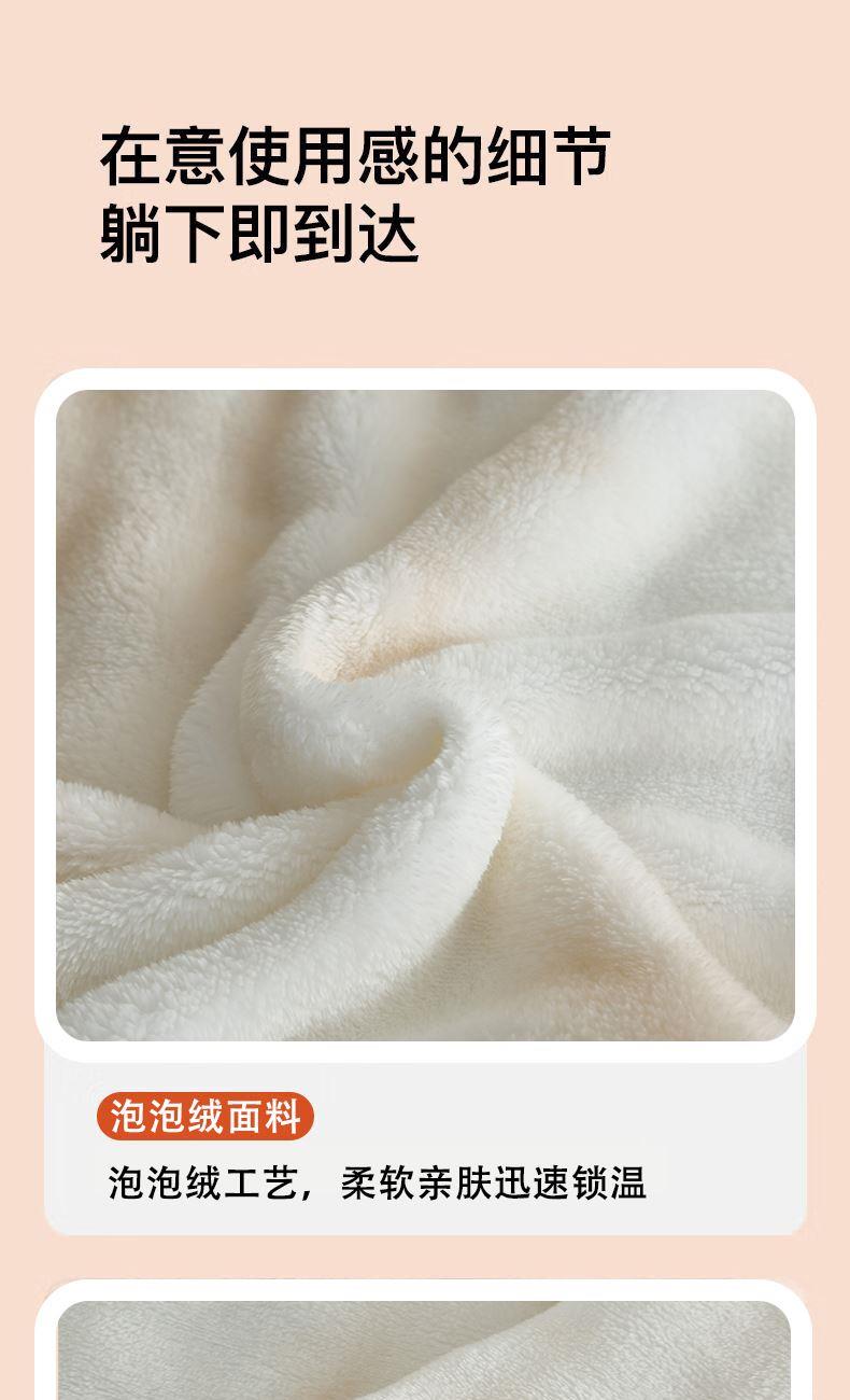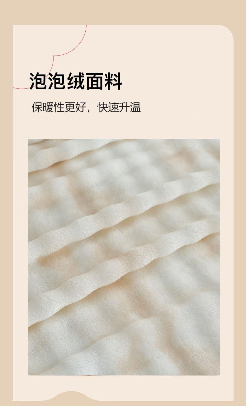 规格:200*230cm 面料:泡泡绒 克重:1400g 执行标准:FZ/T61002-2019 安全类别:GB18401-2010 B类 1.严选泡泡绒面料,手感细腻,亲肤舒适,速热保暖;高克重塔芙绒,透气吸湿,保暖性更好,快速升温;2.内置导电纱,防静电处理,使用更安心;精致的卷工艺,做工精细,针脚细密,不易脱线,牢固耐用。