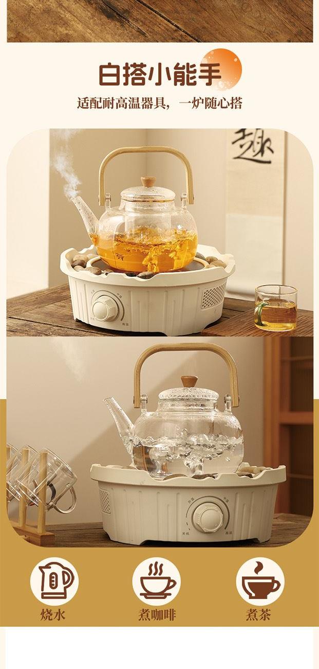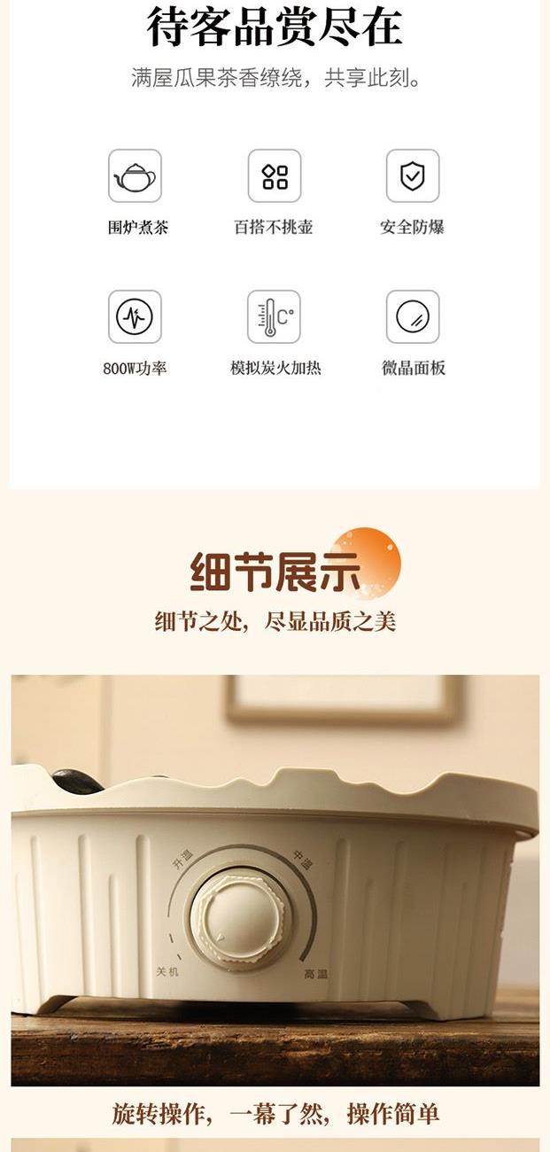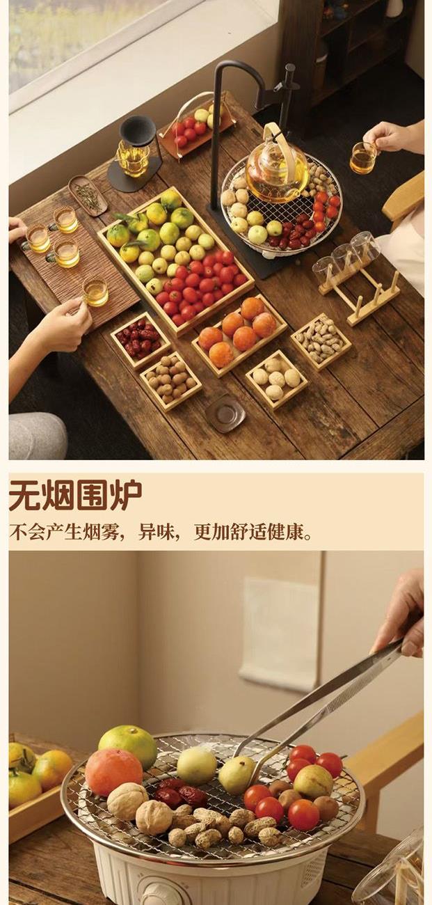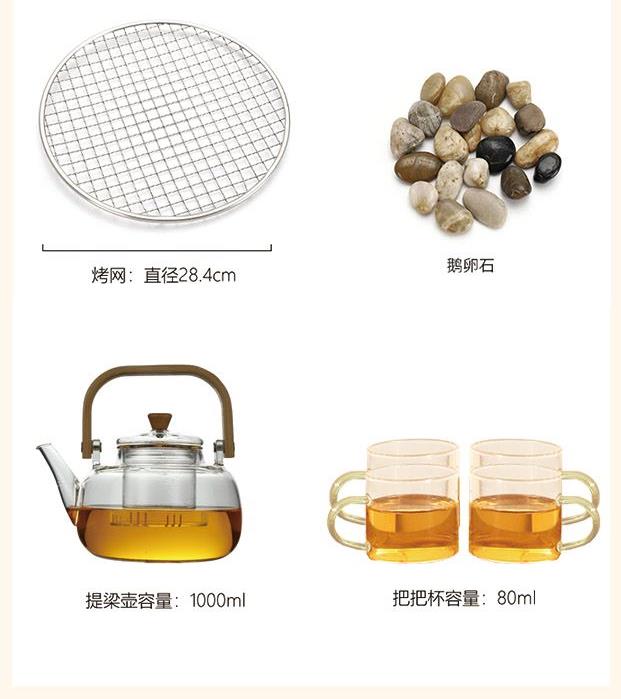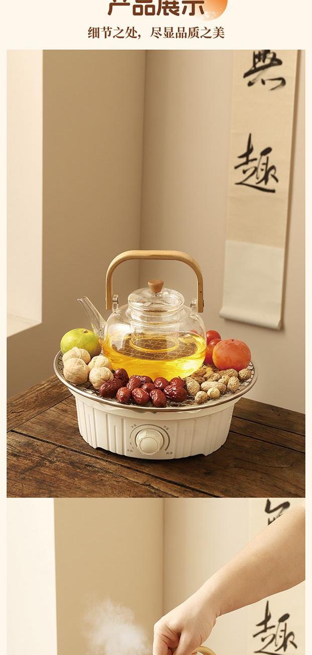 产品规格: 1、额定电压:220V 2、额定功率:800W 3、烤炉尺寸:直径25cm*高9cm 4、烤网:直径28.4cm 5、提梁壶容量:1000ml 6、提梁壶尺寸:口径7cm,高度17cm, 直径14.2cm 7、把把杯容量:80ml 8、把把杯尺寸:口径5.5cm,高度4.5cm 产品特点: 1、无烟围炉,远红外聚能发热,无烟火,更安全; 2、3档旋钮精控,烘烤/快煮随心选; 3、耐高温微晶面板,防刮防爆,一抹即净; 4、搭配高硼硅玻璃茶壶,高硼硅玻璃材质,冷热兼 具,同时适配其他耐高温茶器,一炉随心搭; 5、木质提梁把手,隔热防烫持握舒适; 6、搭配把把杯,围炉一坐,烹茶烤果,其乐融融; 7、不锈钢烤网,健康安全,高温不变形; 8、鹅卵石铺边,让煮茶更温柔。