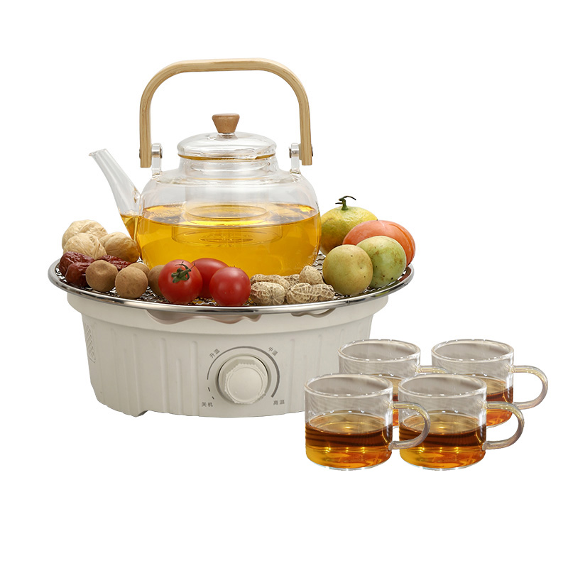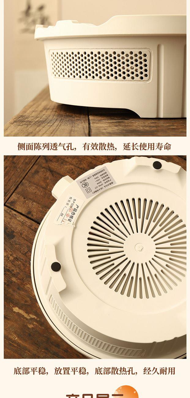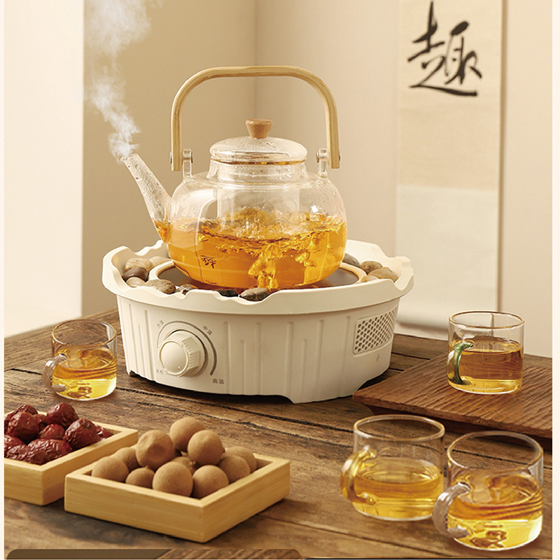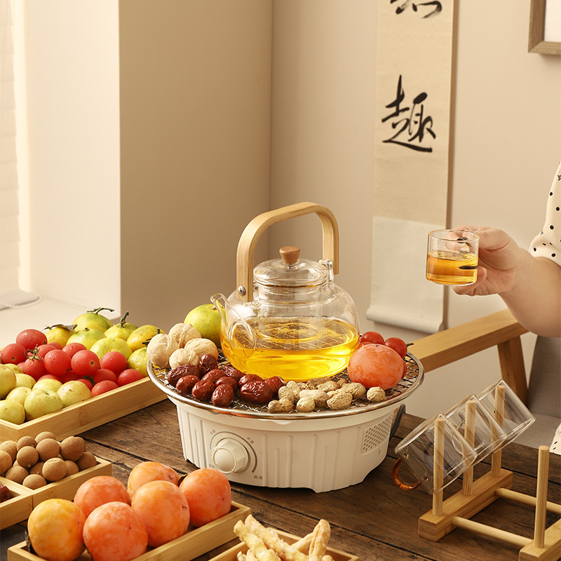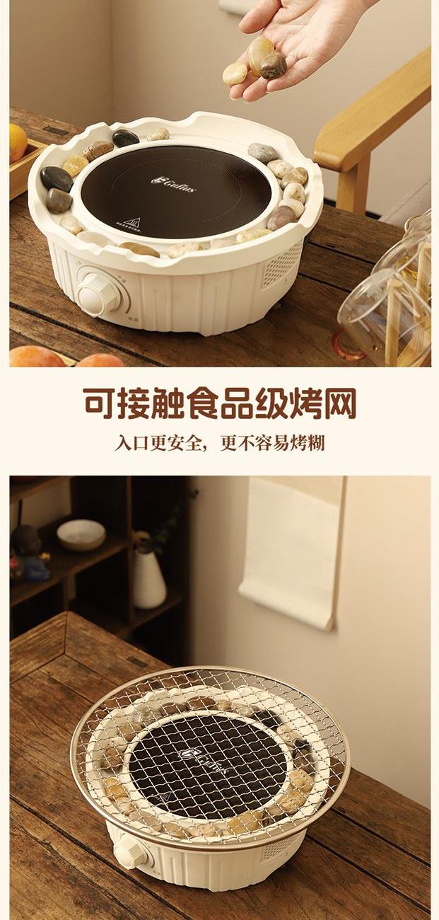 产品规格: 1、额定电压:220V 2、额定功率:800W 3、烤炉尺寸:直径25cm*高9cm 4、烤网:直径28.4cm 5、提梁壶容量:1000ml 6、提梁壶尺寸:口径7cm,高度17cm, 直径14.2cm 7、把把杯容量:80ml 8、把把杯尺寸:口径5.5cm,高度4.5cm 产品特点: 1、无烟围炉,远红外聚能发热,无烟火,更安全; 2、3档旋钮精控,烘烤/快煮随心选; 3、耐高温微晶面板,防刮防爆,一抹即净; 4、搭配高硼硅玻璃茶壶,高硼硅玻璃材质,冷热兼 具,同时适配其他耐高温茶器,一炉随心搭; 5、木质提梁把手,隔热防烫持握舒适; 6、搭配把把杯,围炉一坐,烹茶烤果,其乐融融; 7、不锈钢烤网,健康安全,高温不变形; 8、鹅卵石铺边,让煮茶更温柔。