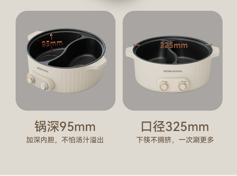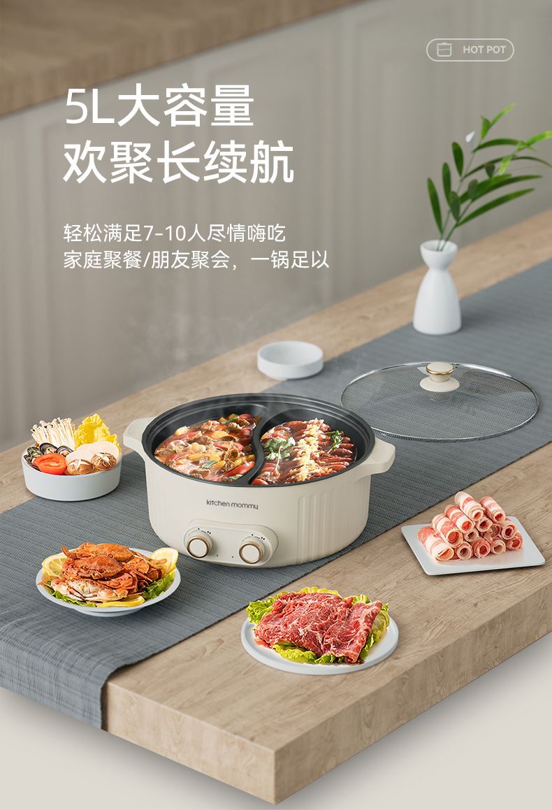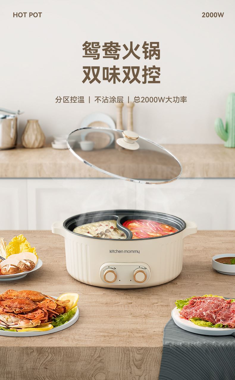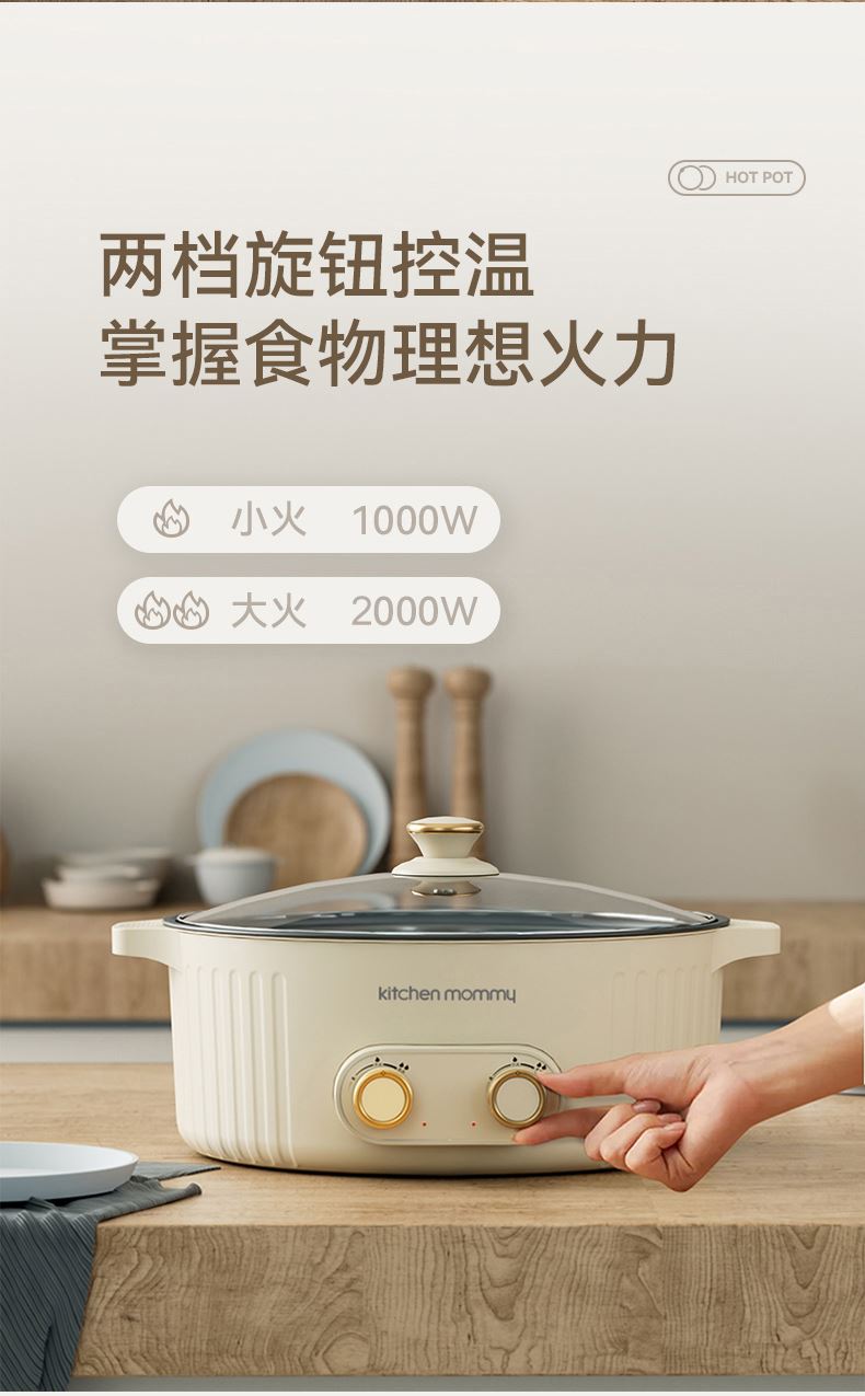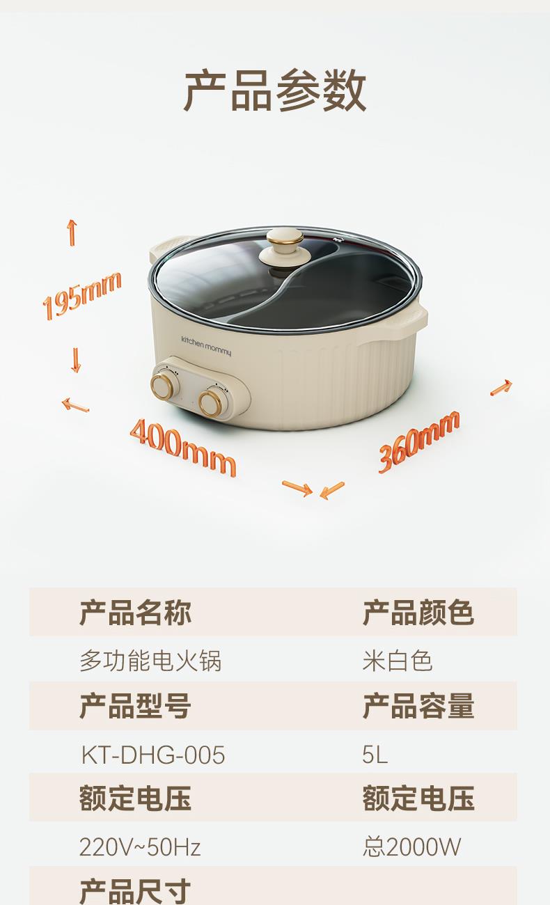 功率:2000W 电压:220V 容量:5L 毛重:2.5Kg 材质:外壳PP+食品级不粘水性涂层 彩盒包装尺寸:351*200*352mm 外箱包装尺寸:712*410*365mm 推荐理由: 1、5升大容量,满足全家所需 2、双开关分区独立控温,单独运作互不干扰 3、不粘锅内胆,清洗好方便 4、2000W大火力,更快沸腾更方便 5、全新升级,独立发热盘 6、自动控温检测,防干烧保护
