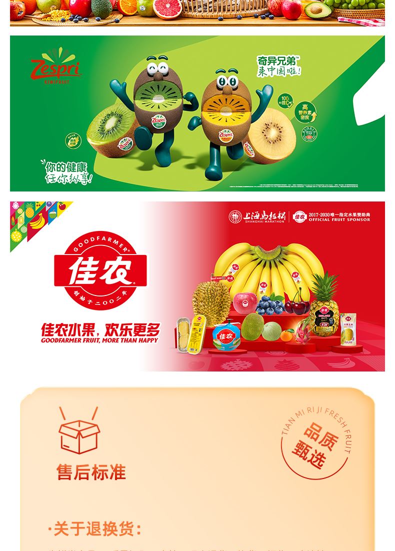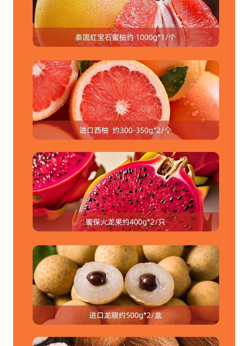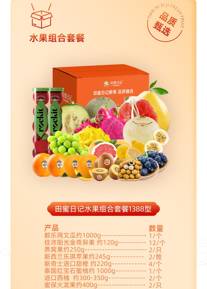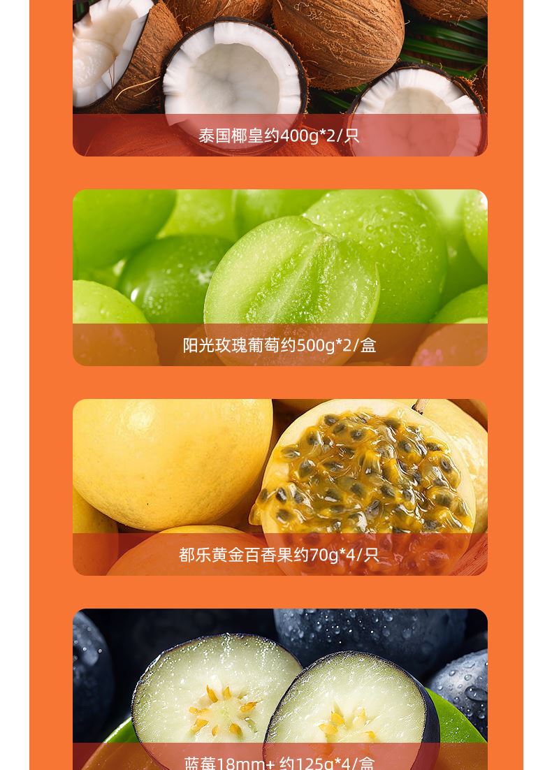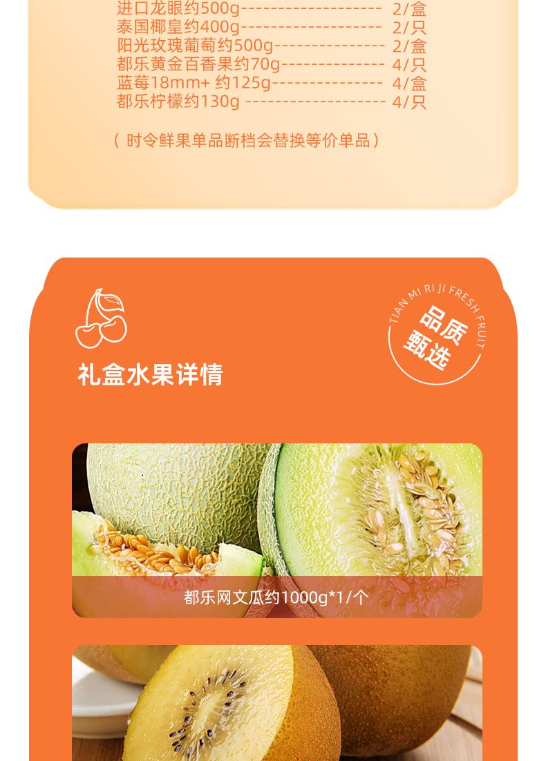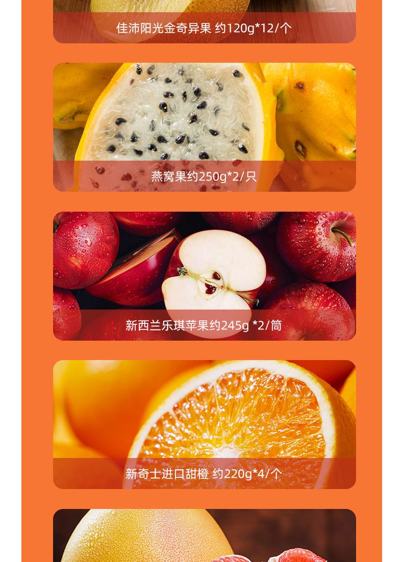 都乐网文瓜约1000g*1/个 佳沛阳光金奇异果 约120g*12/个 燕窝果约250g*2/只 新西兰乐琪苹果约245g *2/筒 新奇士进口甜橙 约220g*4/个 泰国红宝石蜜柚约 1000g*1/个 进口西柚 约300-350g*2/个 蜜保火龙果约400g*2/只 进口龙眼约500g*2/盒 泰国椰皇约400g*2/只 阳光玫瑰葡萄约500g*2/盒 都乐黄金百香果约70g*4/只 蓝莓18mm+ 约125g*4/盒 都乐柠檬约130g*4/只 (时令鲜果单品断档会替换等价单品)"