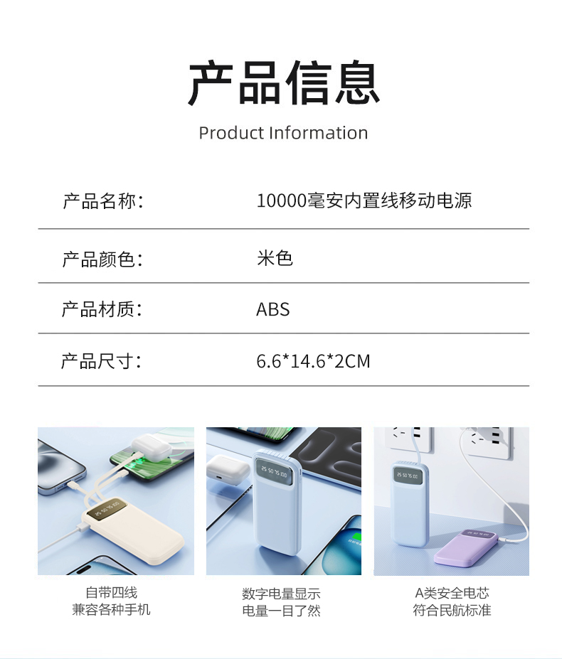 1、一万毫安自带四线移动电源 数字电量显示 内置四线 满足不同手机 3C符合民航局标准,可随身携带 2、66W铝合金超级快充一拖三伸缩数据线 兼容苹果15系列 五档伸缩调节 1.2米长度设计 铝合金面盖 三种充电接口满足各种手机