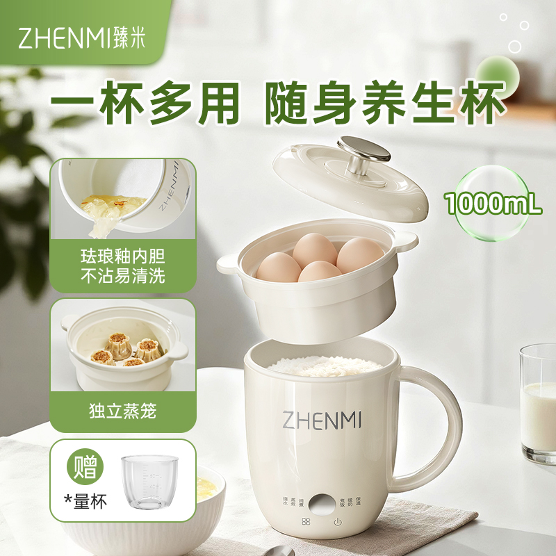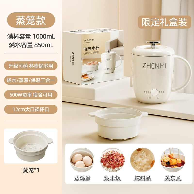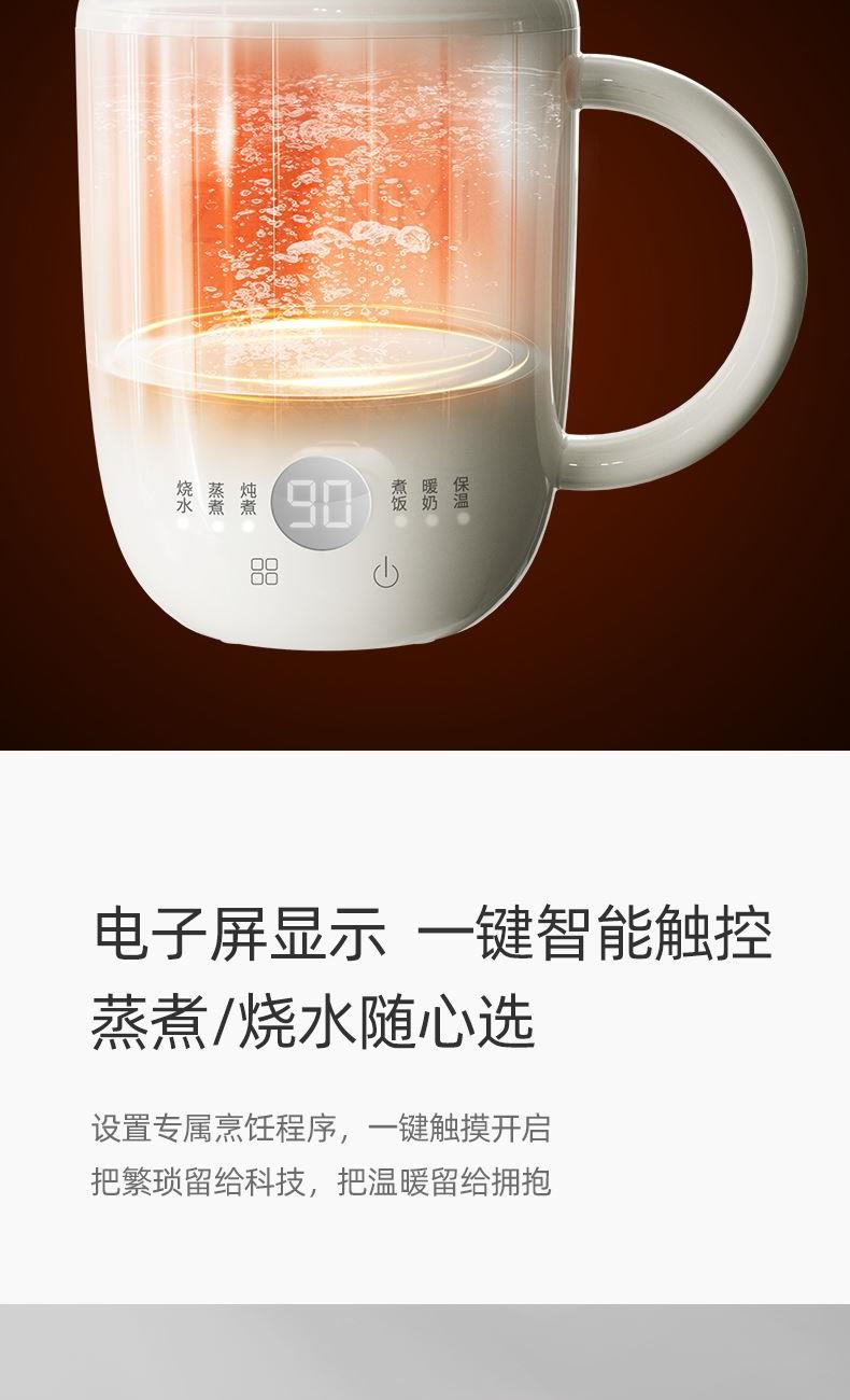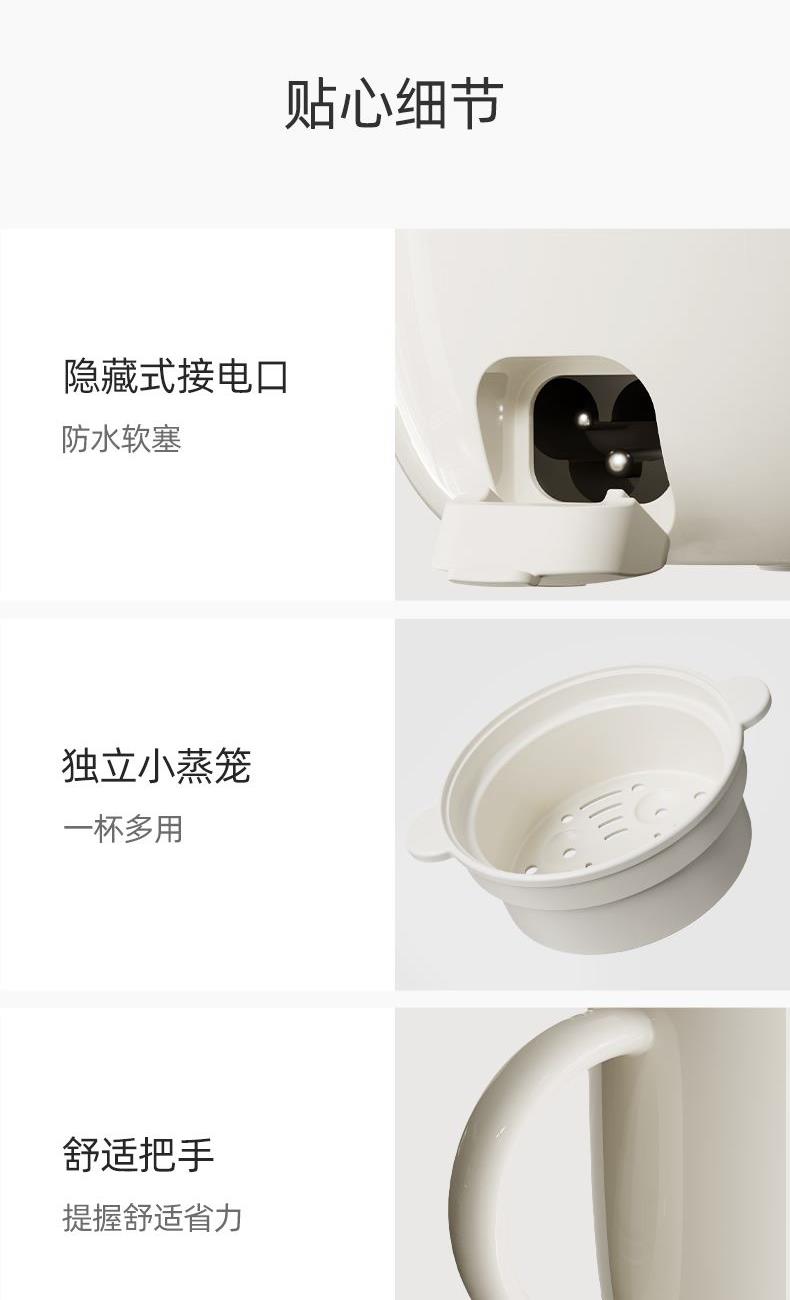 1、850ML烧水容量,1L满容量,办公室摆放不占地、家里也适用、旅游携带方便 2、功能多样化,烧水、炖煮、蒸煮、煮饭、暖奶、保温6大功能,一台顶6台,个人专属烧水杯,炖银耳、蒸鸡蛋、蒸包子、煮米饭、早晨还可以暖一杯55°奶,暖奶不做烧开,只做加热保温,保留原有营养 3、 杯内珐琅涂层,通过500-600度的高温固化而成,抗磨耐刮20000次不易脱落。表面光滑,不粘杯,不糊底,易清洁,符合食品级安全认证 4、500W功率烧水快,宿舍、办公室也可以使用 5、默认保温55°C, 手动/自动保温24小时,40-80°C之间可调节 6、0.5L容量蒸笼,可蒸5个鸡蛋,3个小笼包,1个大包子,玉米、红薯分断蒸