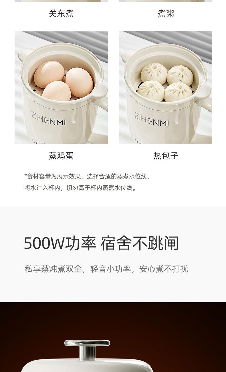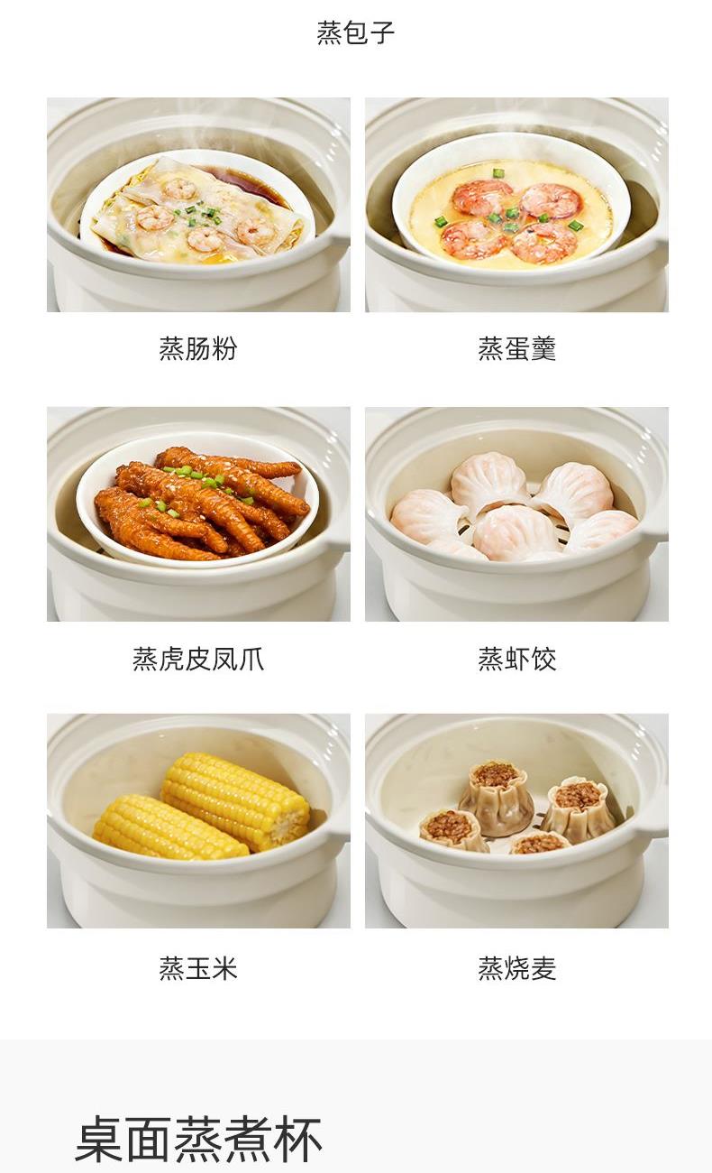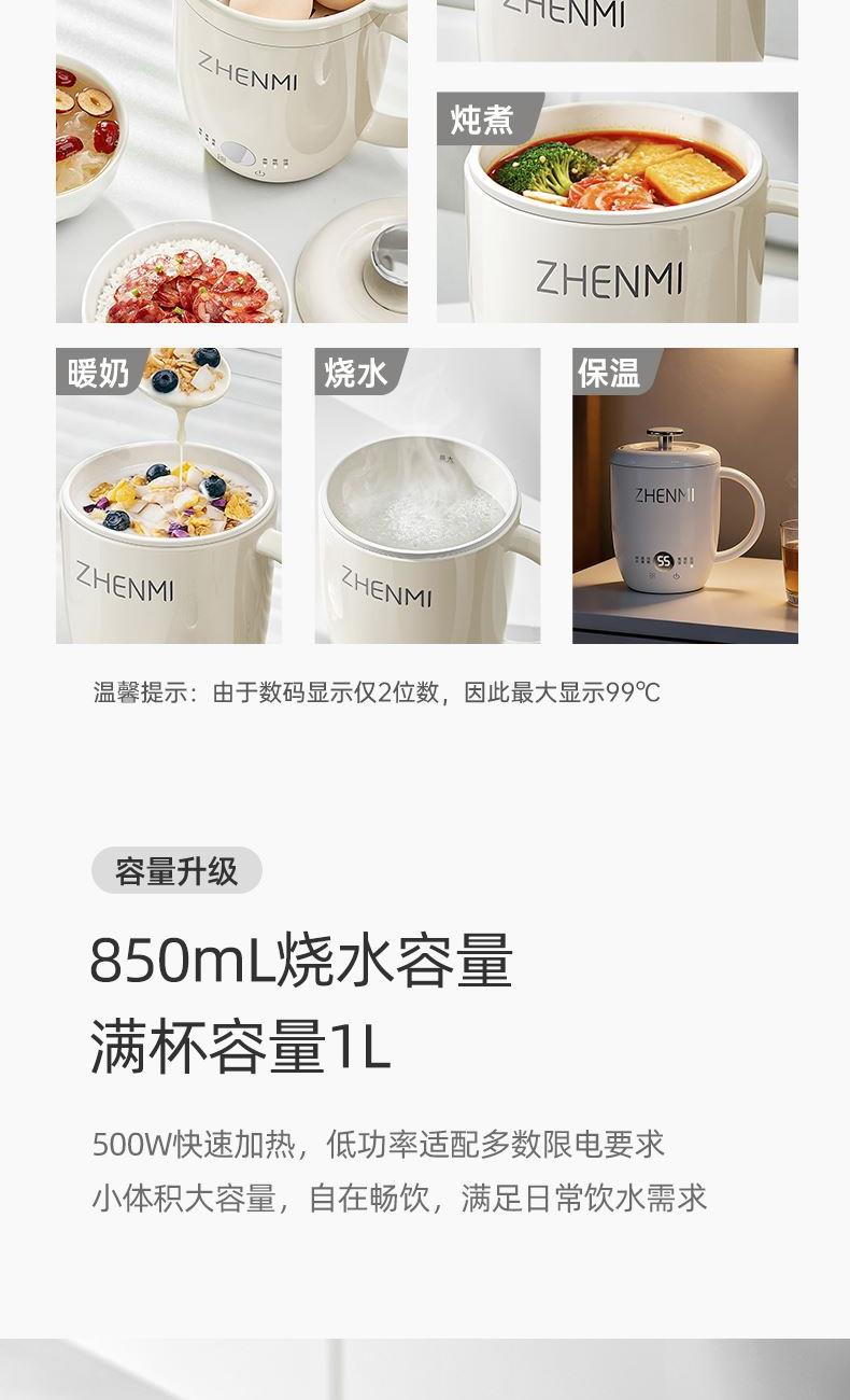 1、850ML烧水容量,1L满容量,办公室摆放不占地、家里也适用、旅游携带方便 2、功能多样化,烧水、炖煮、蒸煮、煮饭、暖奶、保温6大功能,一台顶6台,个人专属烧水杯,炖银耳、蒸鸡蛋、蒸包子、煮米饭、早晨还可以暖一杯55°奶,暖奶不做烧开,只做加热保温,保留原有营养 3、 杯内珐琅涂层,通过500-600度的高温固化而成,抗磨耐刮20000次不易脱落。表面光滑,不粘杯,不糊底,易清洁,符合食品级安全认证 4、500W功率烧水快,宿舍、办公室也可以使用 5、默认保温55°C, 手动/自动保温24小时,40-80°C之间可调节 6、0.5L容量蒸笼,可蒸5个鸡蛋,3个小笼包,1个大包子,玉米、红薯分断蒸
