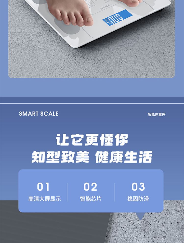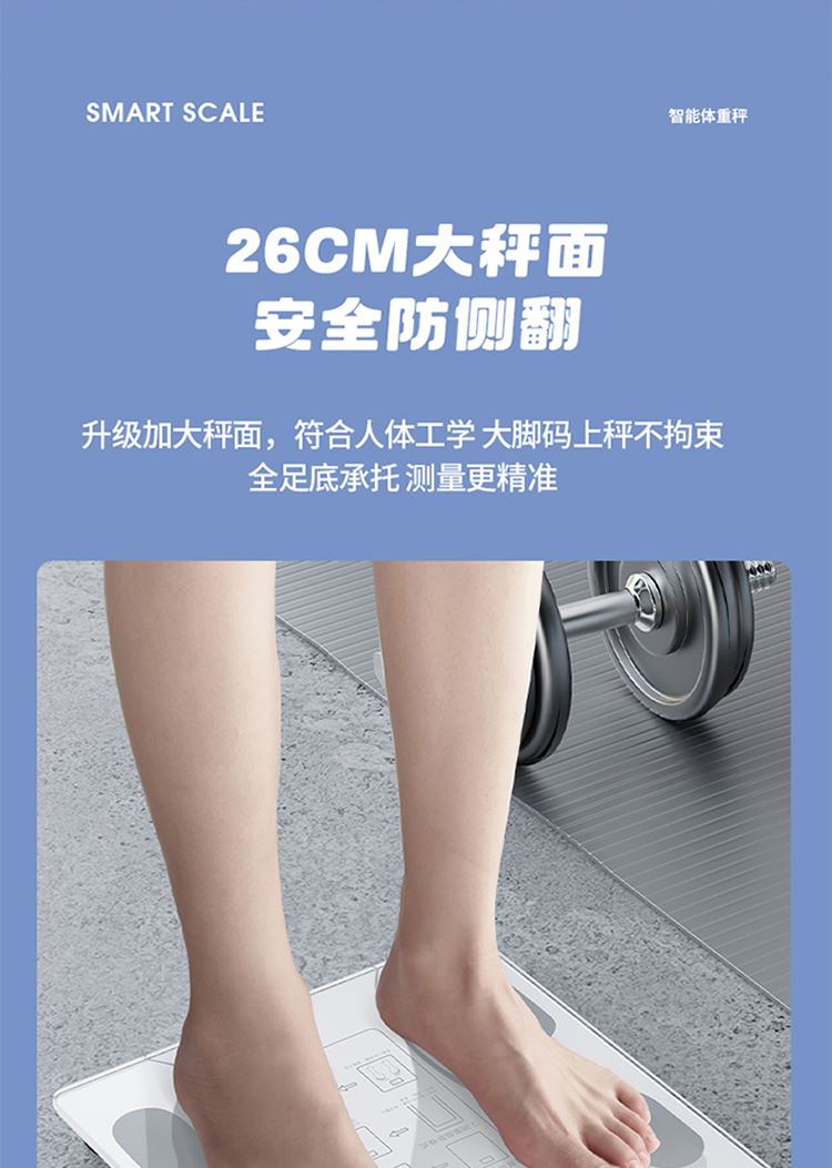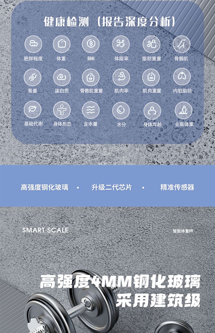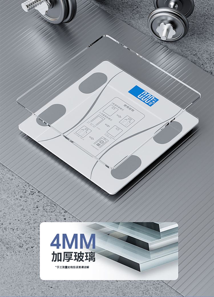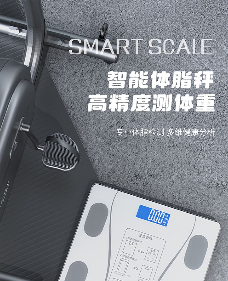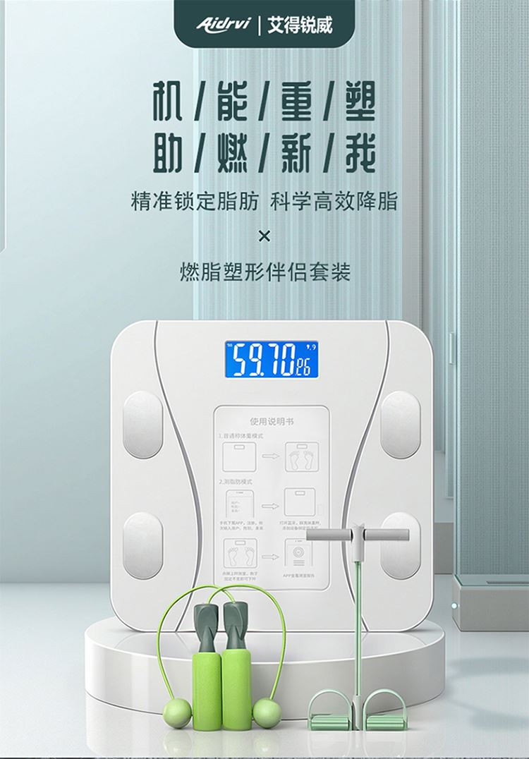 产品尺寸:智能体脂秤:26×26cm/圆球跳绳:3cm/脚蹬拉力器:42*26cm 产品材质:钢化玻璃+PP泡棉+TPE 套装组合:智能体脂秤+圆球跳绳+脚蹬拉力器 彩盒尺寸:30x12.5x30.5cm 外箱尺寸:65.5*31.5*64 智能体脂秤:高强度钢化玻璃,坚固耐用;TPU弹性防滑支撑,杜绝侧翻隐患,LCD大屏蓝膜显示,昼夜皆清晰,体脂率实时在线检测,管理好身材; 圆球跳绳:不限场地室内也能跳,优质轴承丝滑耐用,高密度泡棉吸汗又防滑; 拉力器:天然乳胶强韧回弹更耐用,高密度泡棉防滑又吸汗,不限场地开拉塑造好身材
