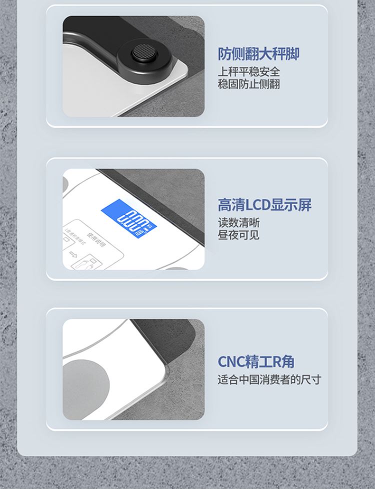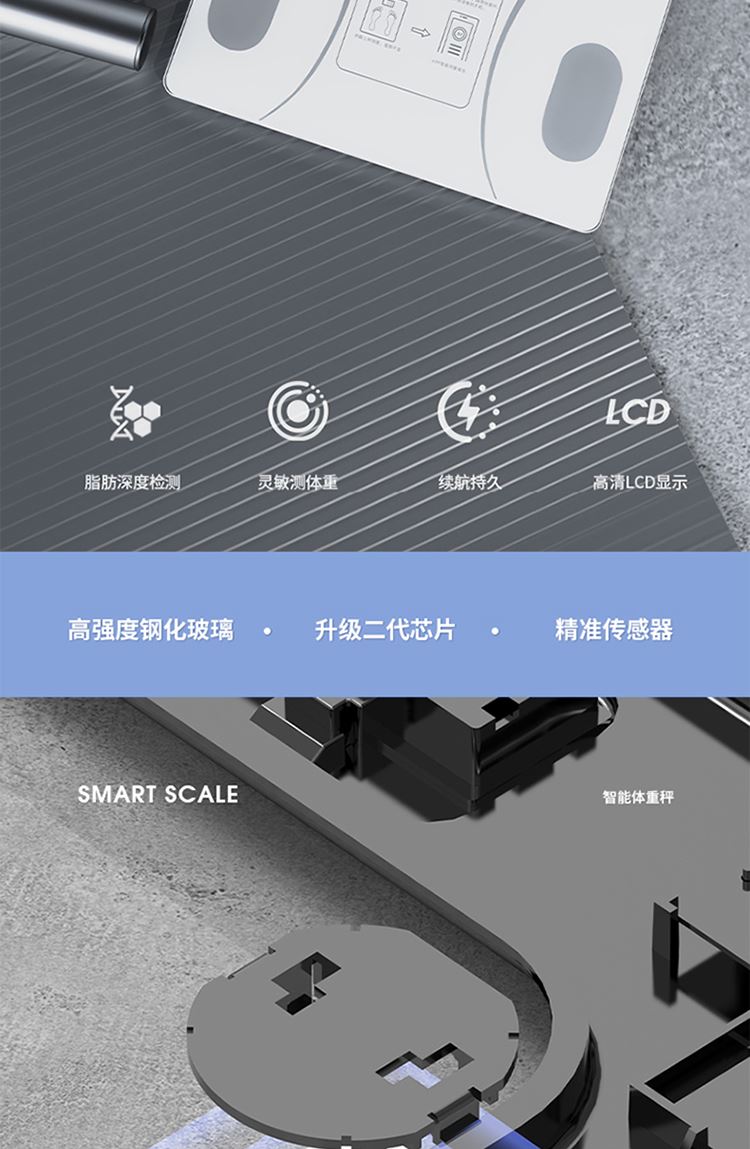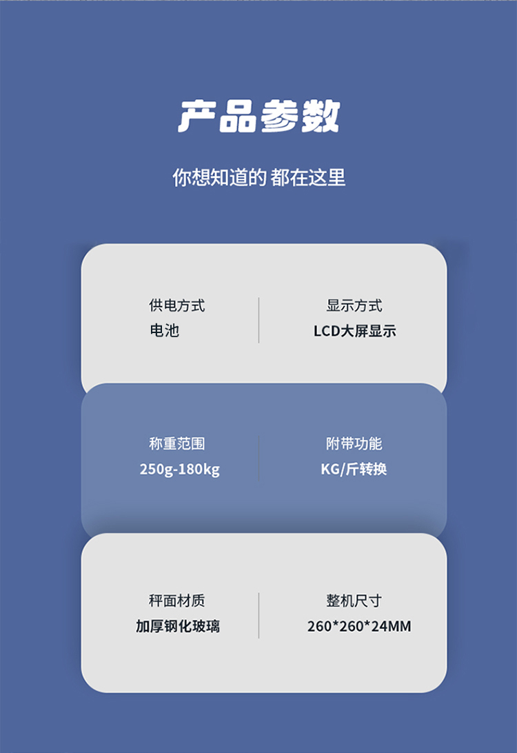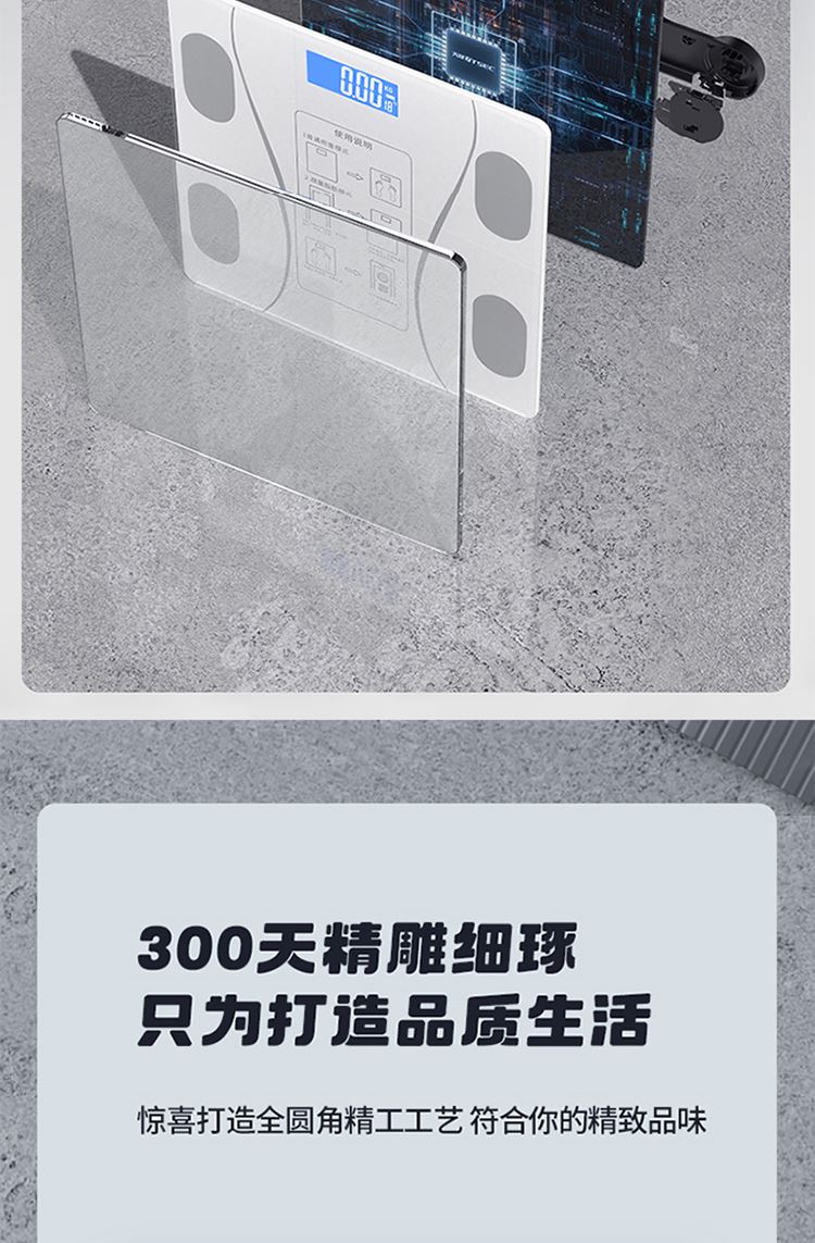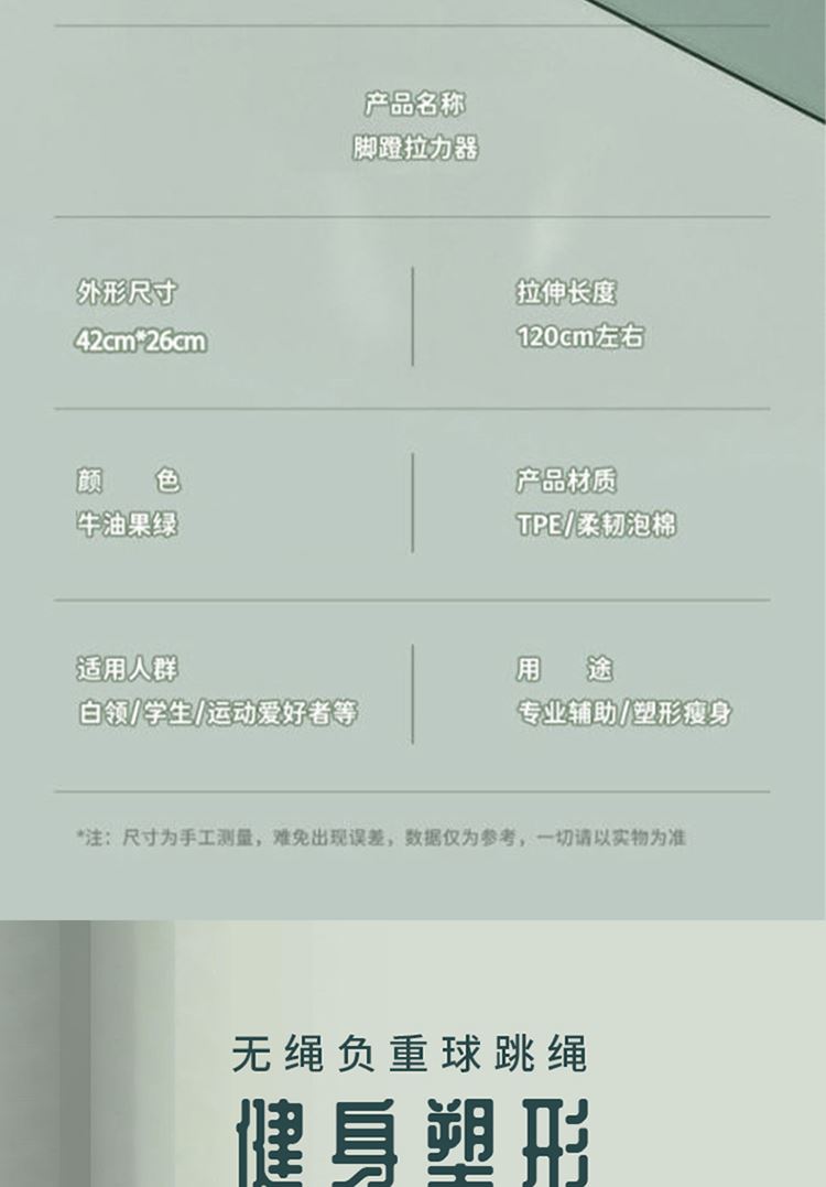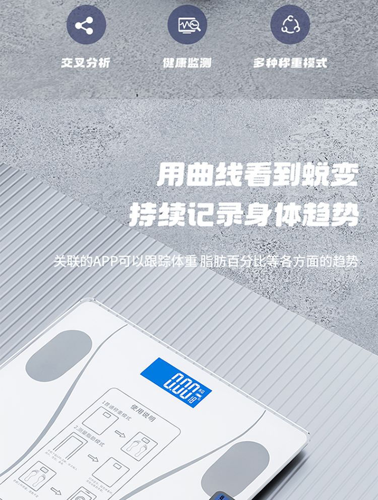 产品尺寸:智能体脂秤:26×26cm/圆球跳绳:3cm/脚蹬拉力器:42*26cm 产品材质:钢化玻璃+PP泡棉+TPE 套装组合:智能体脂秤+圆球跳绳+脚蹬拉力器 彩盒尺寸:30x12.5x30.5cm 外箱尺寸:65.5*31.5*64 智能体脂秤:高强度钢化玻璃,坚固耐用;TPU弹性防滑支撑,杜绝侧翻隐患,LCD大屏蓝膜显示,昼夜皆清晰,体脂率实时在线检测,管理好身材; 圆球跳绳:不限场地室内也能跳,优质轴承丝滑耐用,高密度泡棉吸汗又防滑; 拉力器:天然乳胶强韧回弹更耐用,高密度泡棉防滑又吸汗,不限场地开拉塑造好身材