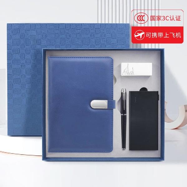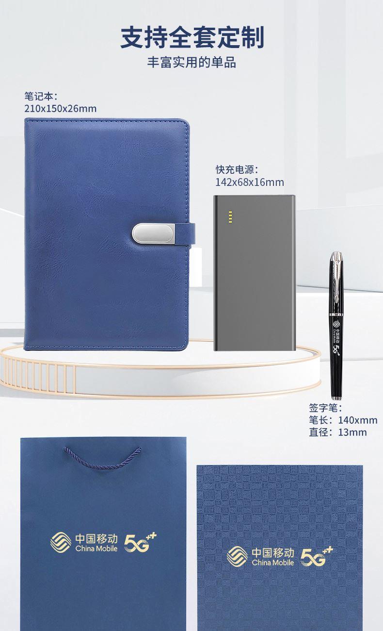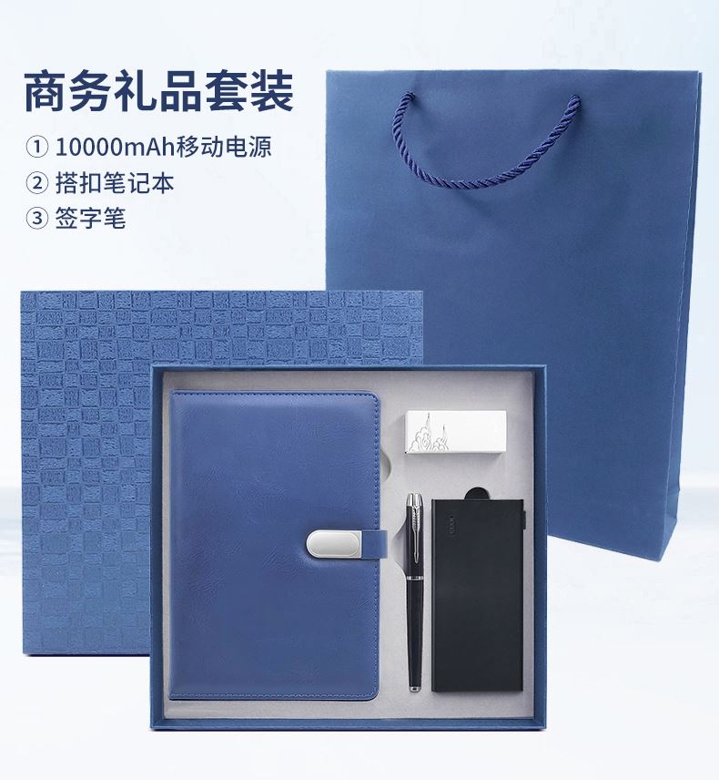 礼盒配置 : 1、A5搭扣硬皮PU皮笔记本 2、金属烤漆签字笔 3、10000mAh移动电源 4、蓝色包装盒尺寸:278x256x45mm 5、蓝色手提袋尺寸:271x307x55mm 6、重量:约32kg/箱