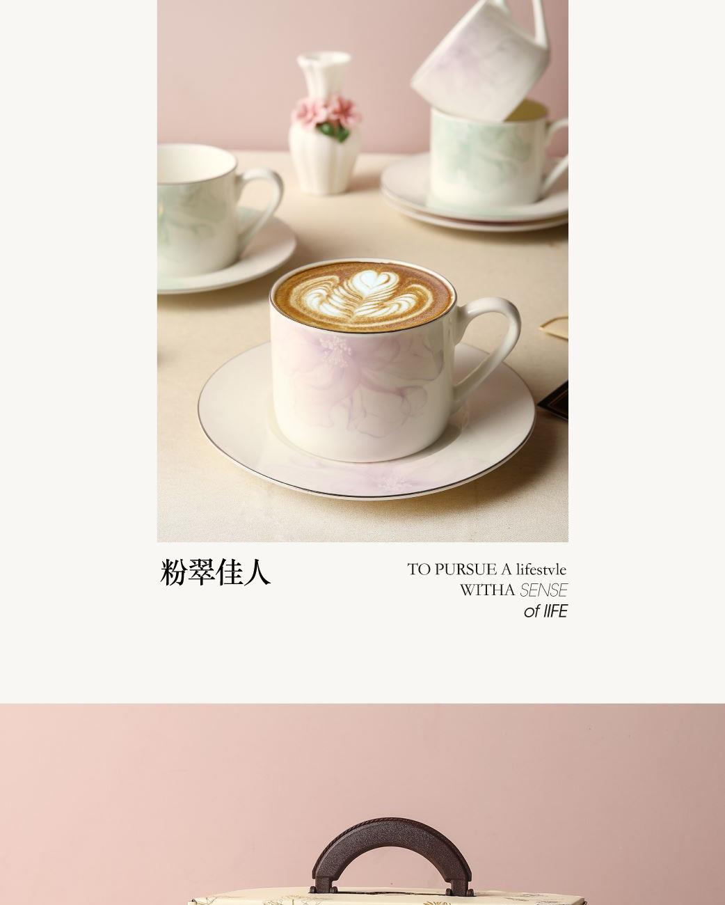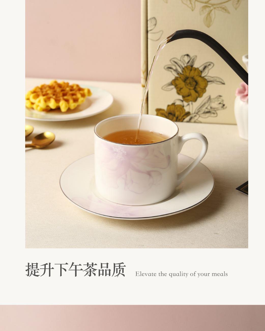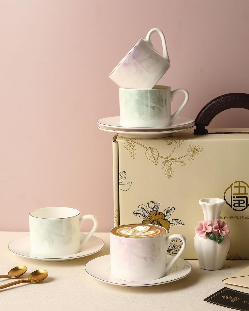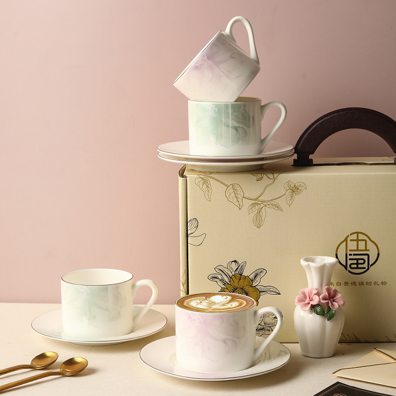 产品组成:茶咖杯4、碟子4、花瓶1、勺子4 产品材质:高骨瓷 产品工艺:贴花+描金 包装尺寸:42*12*25cm 外箱尺寸:43*37*27.5cm