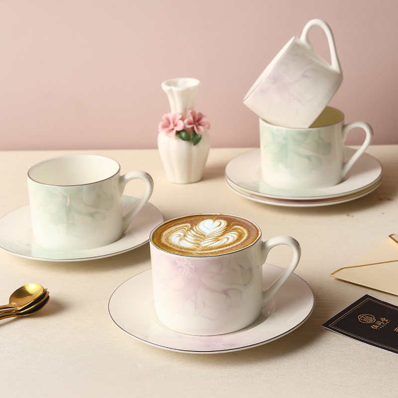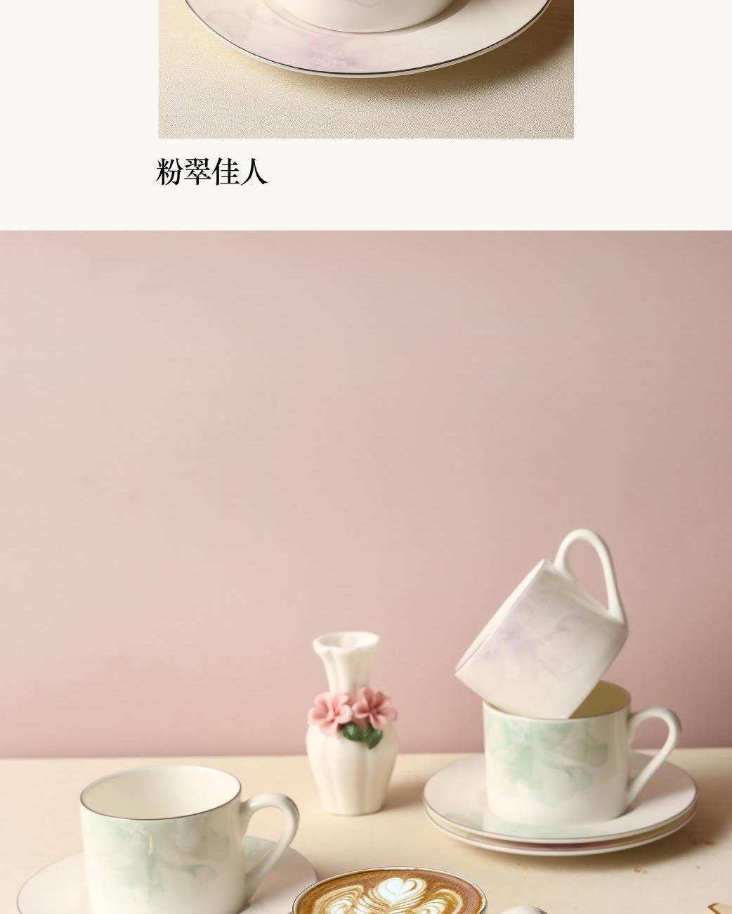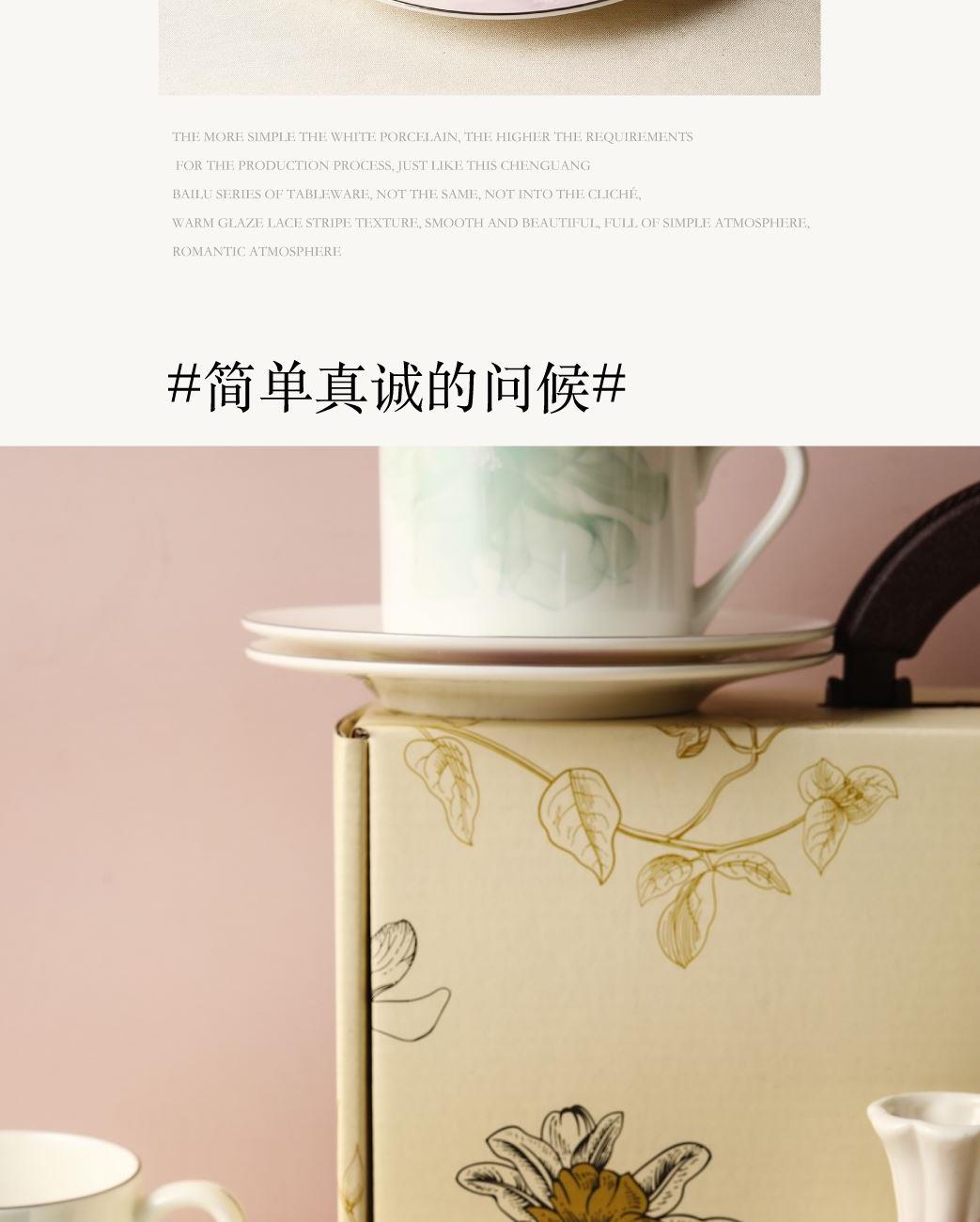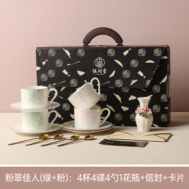 产品组成:茶咖杯4、碟子4、花瓶1、勺子4 产品材质:高骨瓷 产品工艺:贴花+描金 包装尺寸:42*12*25cm 外箱尺寸:43*37*27.5cm