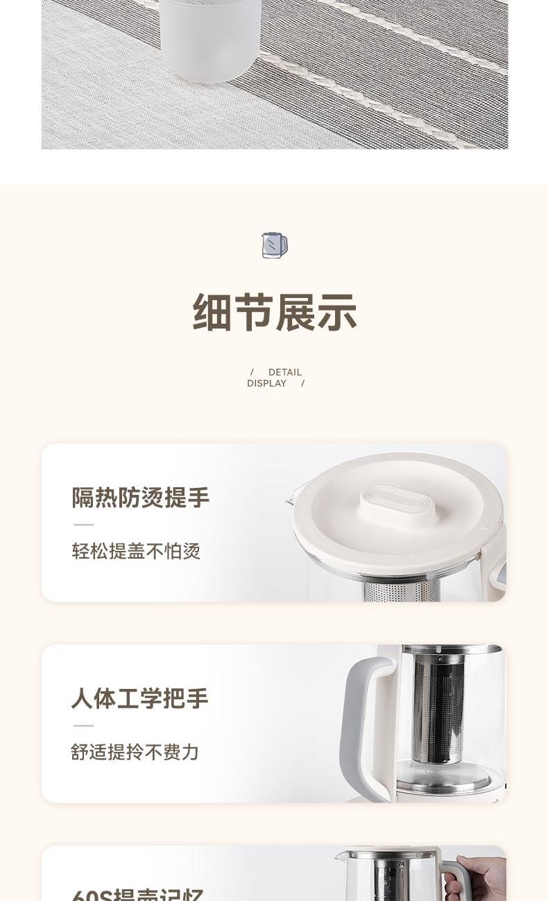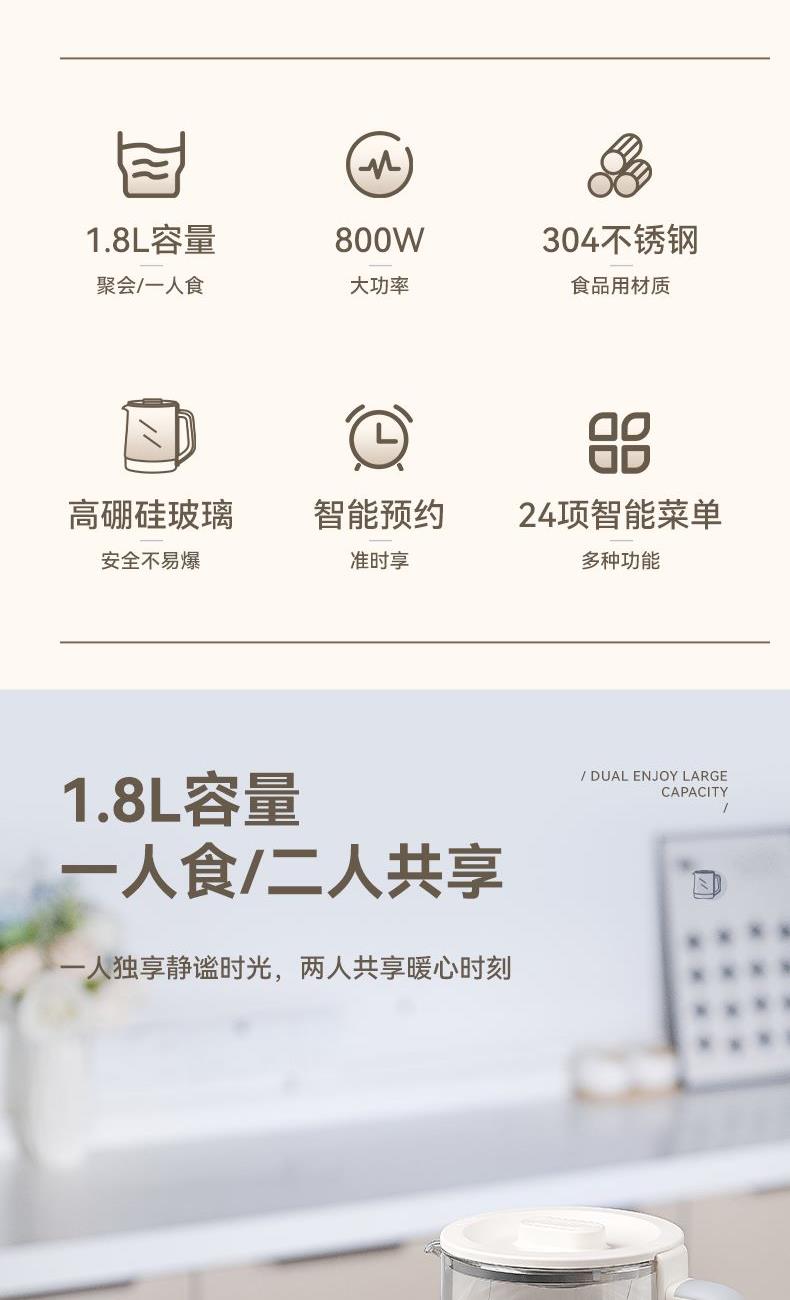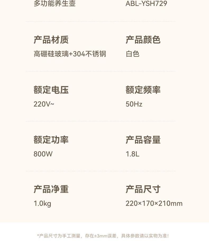 产品颜色:白色 产品材质:高硼硅玻璃+304不锈钢 额定电压:220V~ 额定频率:50Hz 额定功率:800W 额定容量:1.8L 产品净重:1.0KG 产品毛重:1.2KG 产品尺寸:220*170*210mm 包装尺寸:245*210*257mm 外箱尺寸:755*435*530mm 单台为彩盒包装;12台/箱
