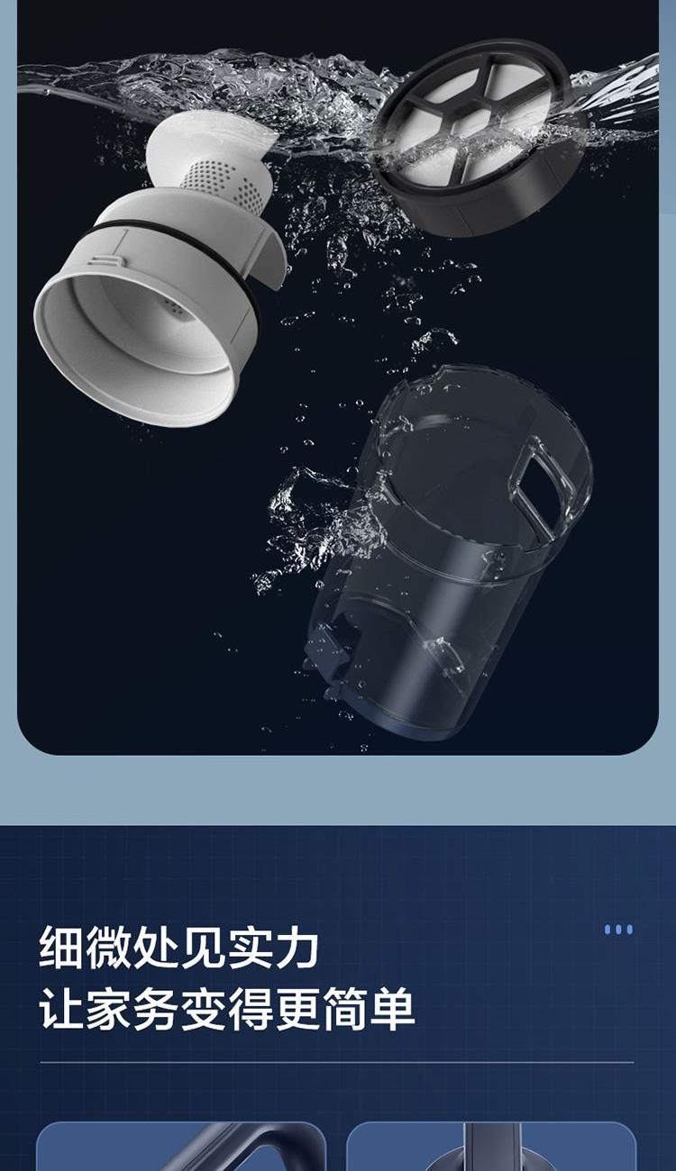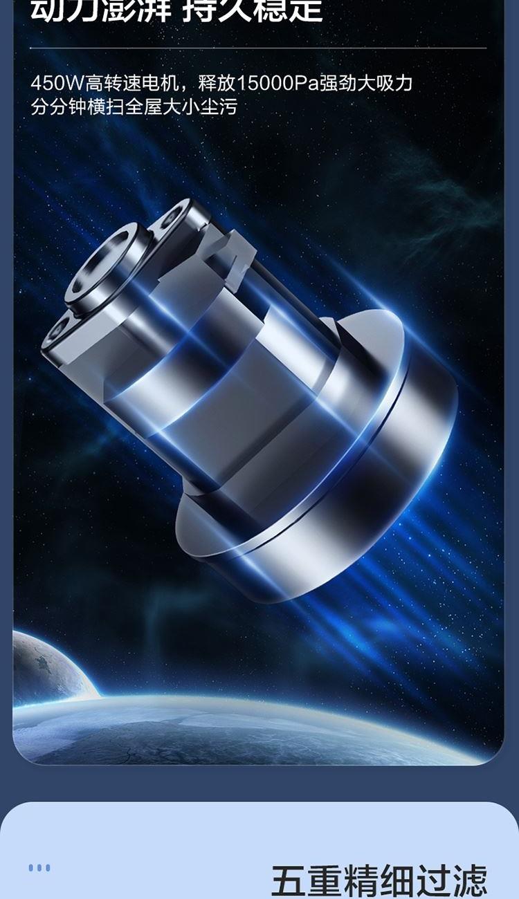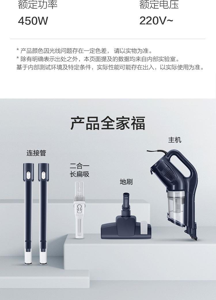 功率:450W 真空度:15kpa 重量(含包装):2.8 包装尺寸(长/深):365*140*518mm 配件:1.主机2.墙挂3.毛刷4.长扁吸5.地刷6.延长管 1.、360° 旋风大吸力,450W高速电机,15kPa真空度强劲吸尘 2、 5重强效过滤,锁定灰尘,轻松洗净 推杆&手持二合一 ,配备多刷头多场景使用(地面、窗帘、沙发、灯罩、汽车座椅、桌面等) 3、 0.5L大容量尘杯,滤网滤芯等可水洗,重复使用