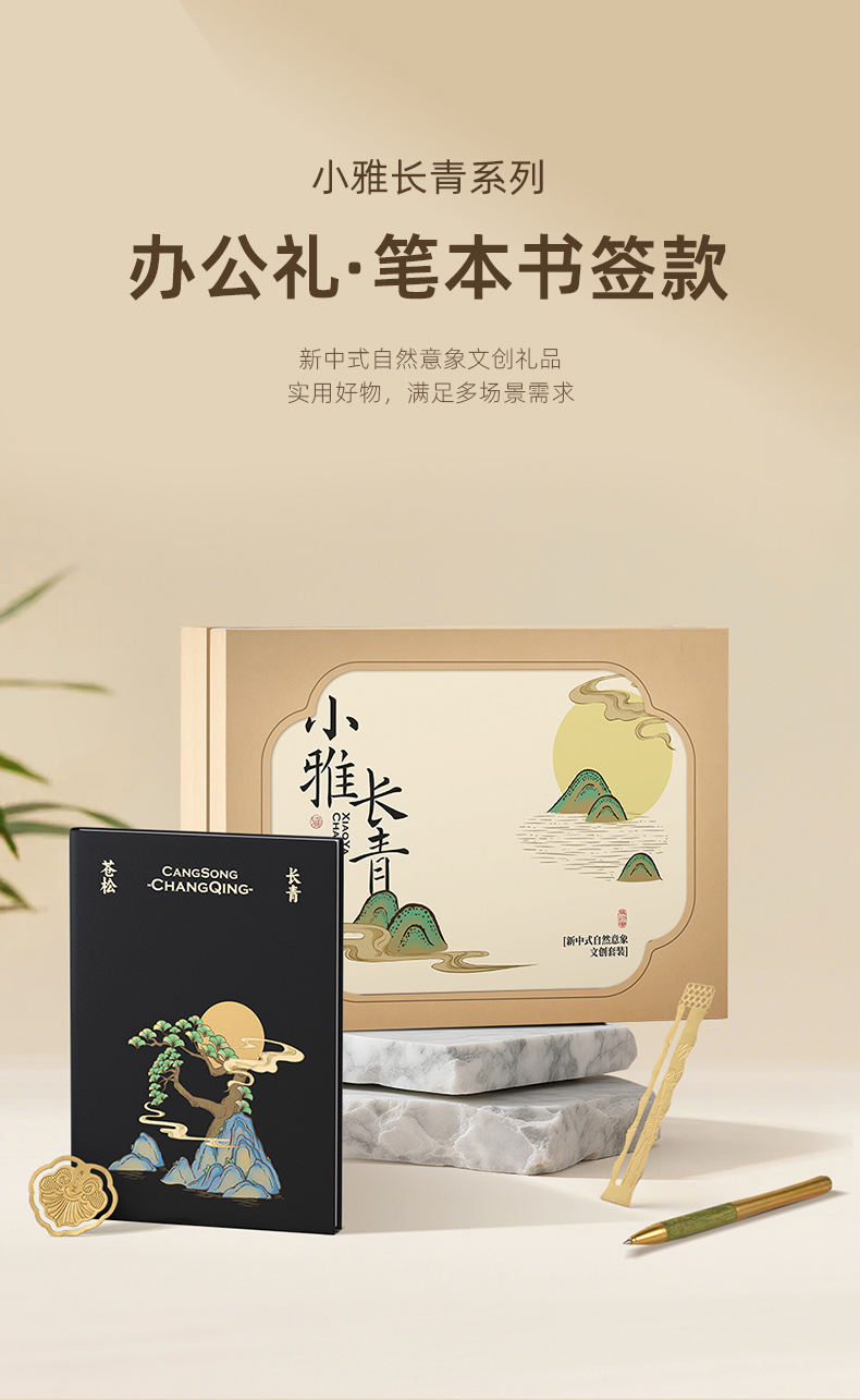 配置 · ① 影木·黄铜笔×1支 ② 小雅·PU本 ×1本 ③ 高升·书签尺 ×1把 ④ 如意·铜书扣 ×1只 ⑥ 小雅·新中式礼盒手袋×1套