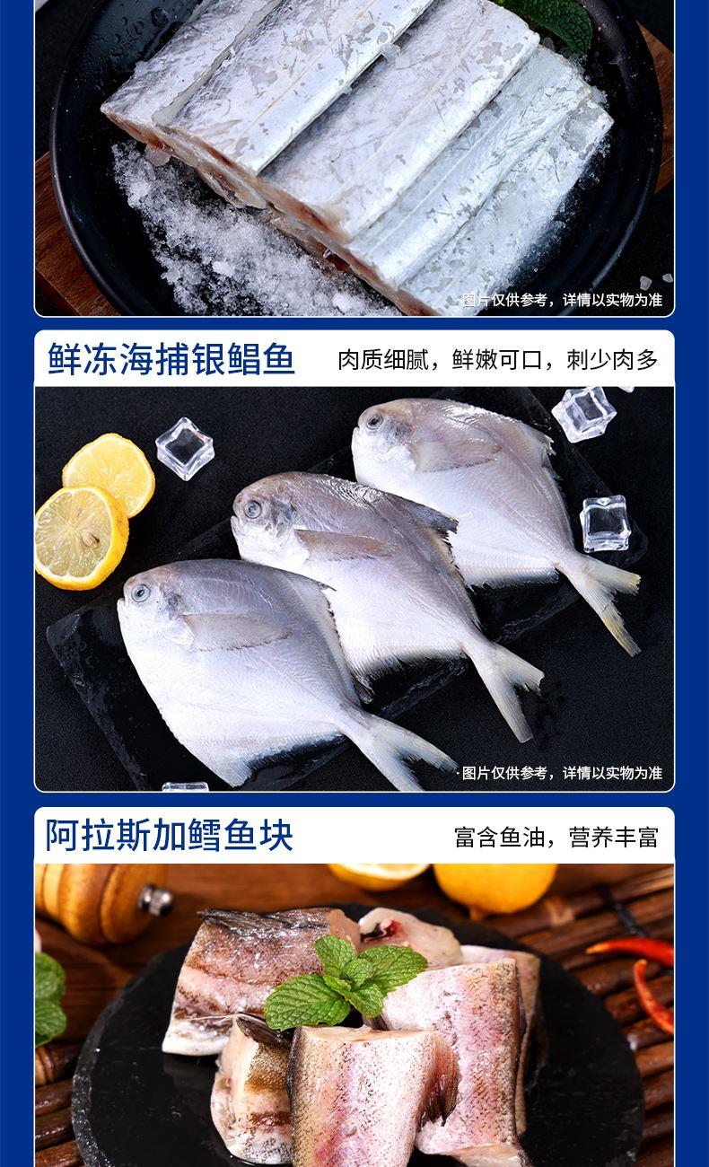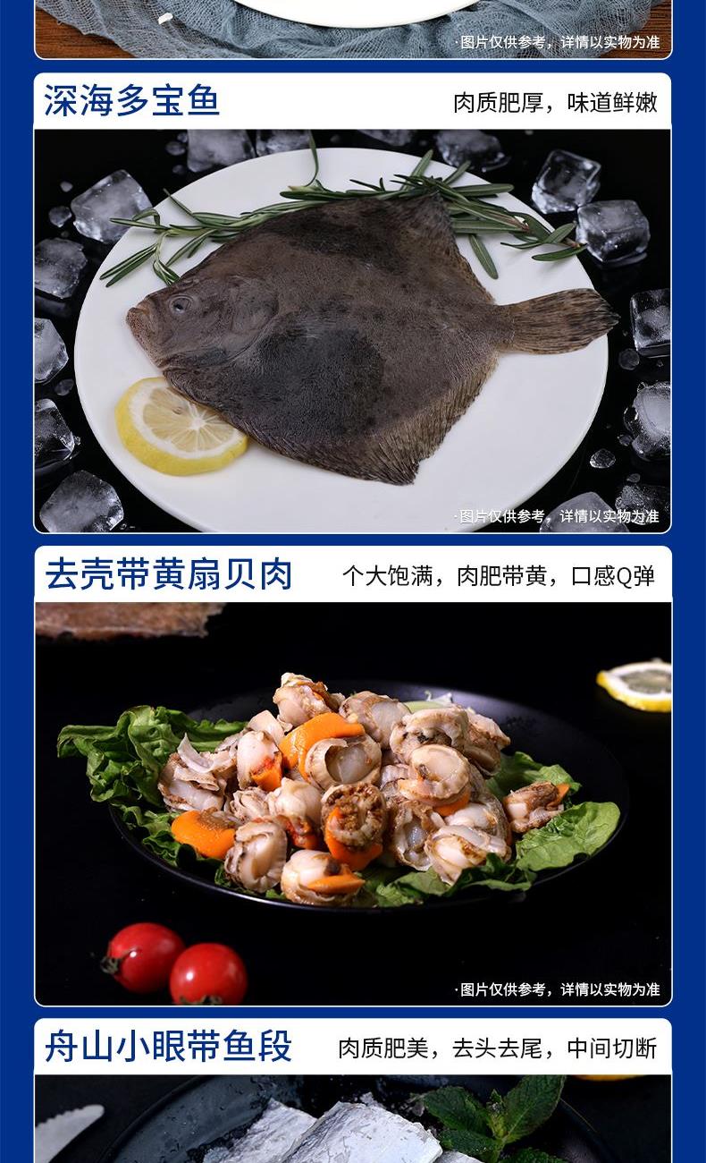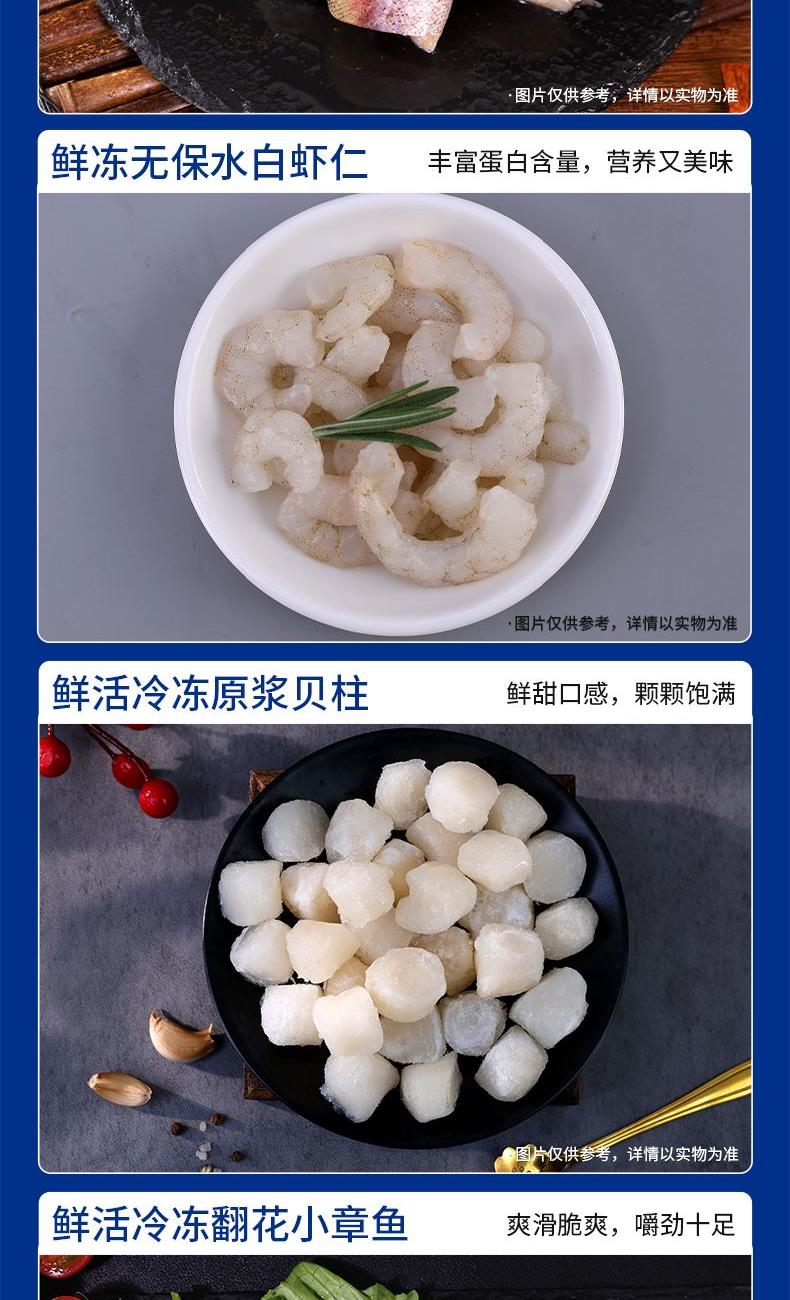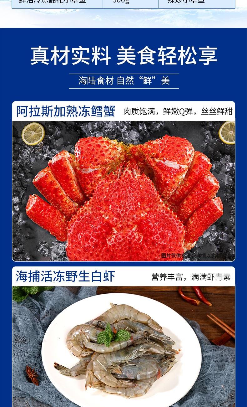 阿拉斯加熟冻鳕蟹300g-400g 海捕活冻野生白虾400g 鲜冻深海多宝鱼250g-300g 冷冻去壳带黄扇贝肉300g 冷冻舟山小眼带鱼段500g 鲜冻海捕银鲳鱼500g 阿拉斯加鳕鱼块300g 鲜冻无保水虾仁200g 鲜活冷冻原浆贝柱300g 鲜活冷冻翻花小章鱼300g