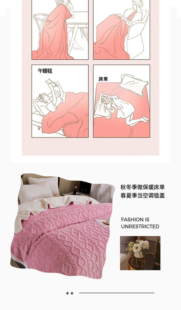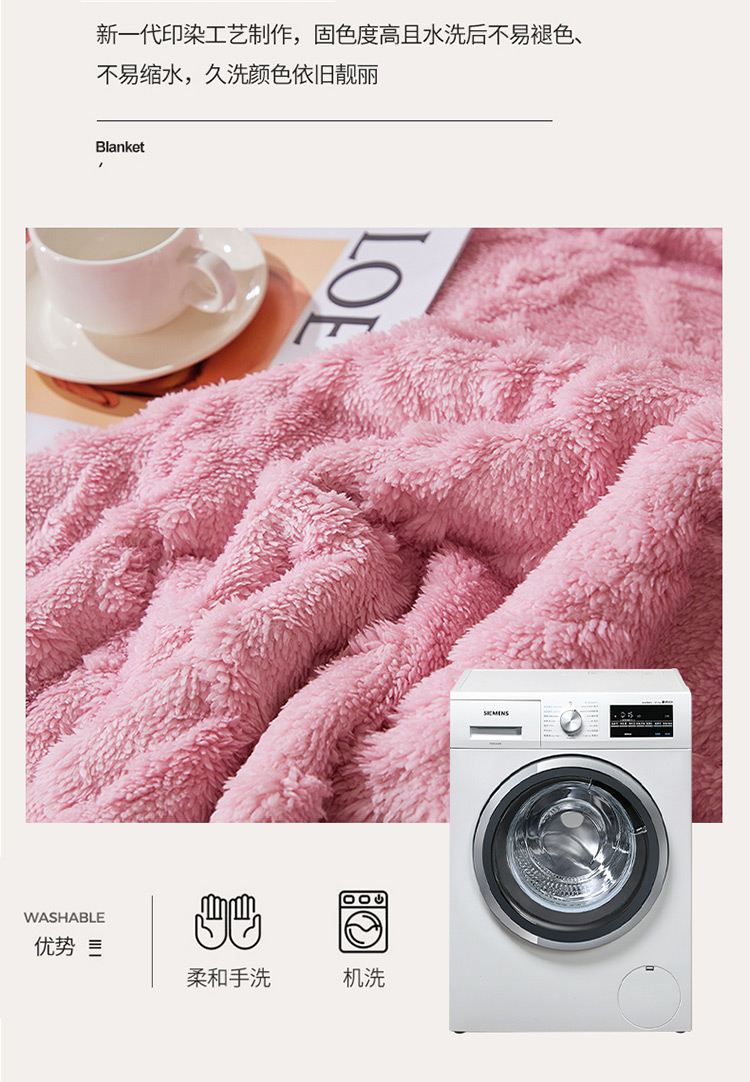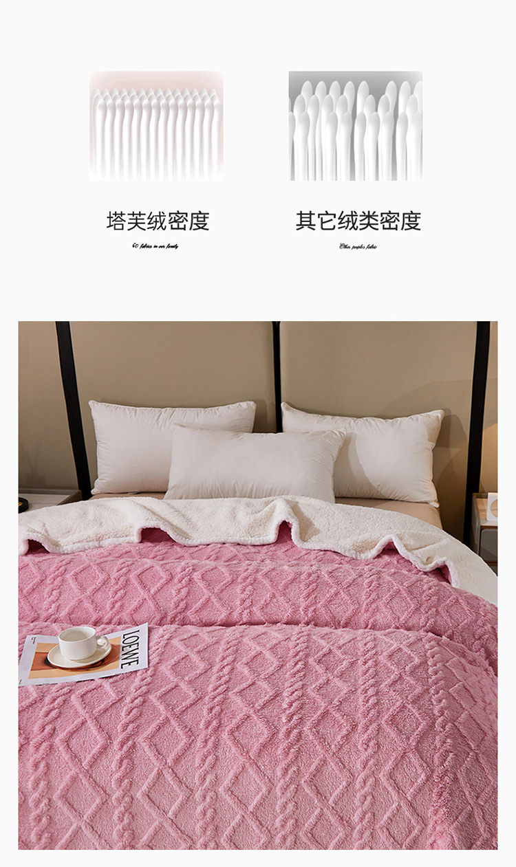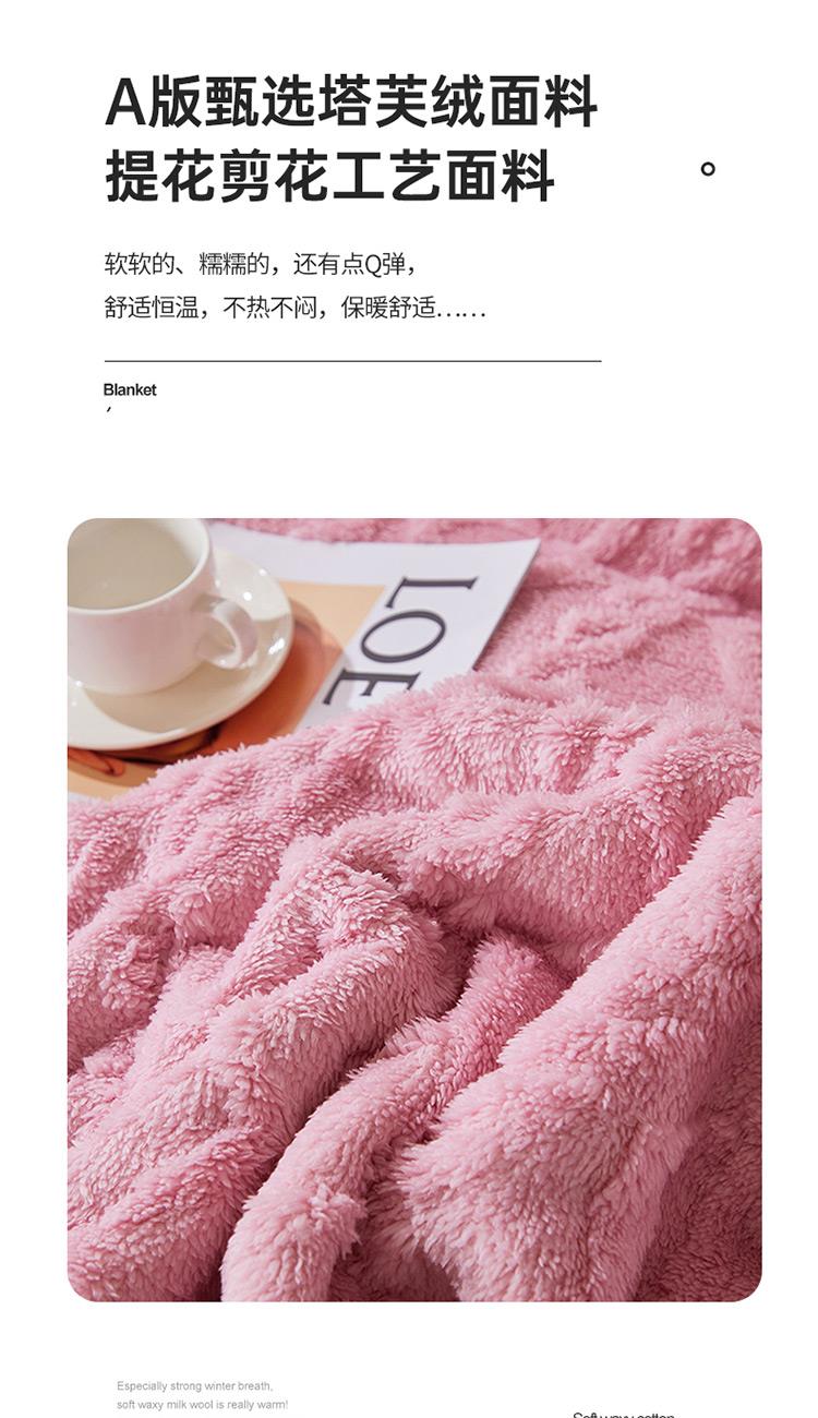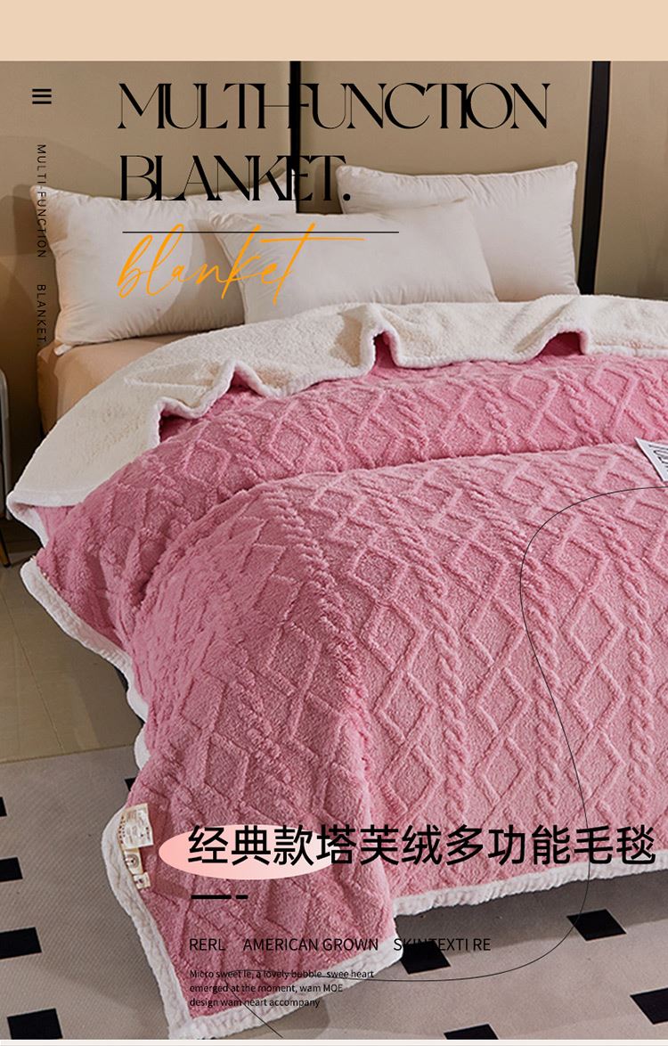 面料:A版:塔芙绒 B版:羊羔绒 规格:150*200cm 一款多用:午睡毯、车用毯、沙发毯、披肩、床用被单等等,时刻感知你的温度,给你加倍温暖。面料中植入导电丝,告别静电烦恼。面料采用活性印染技术,安全不褪色,有颜值更舒适.