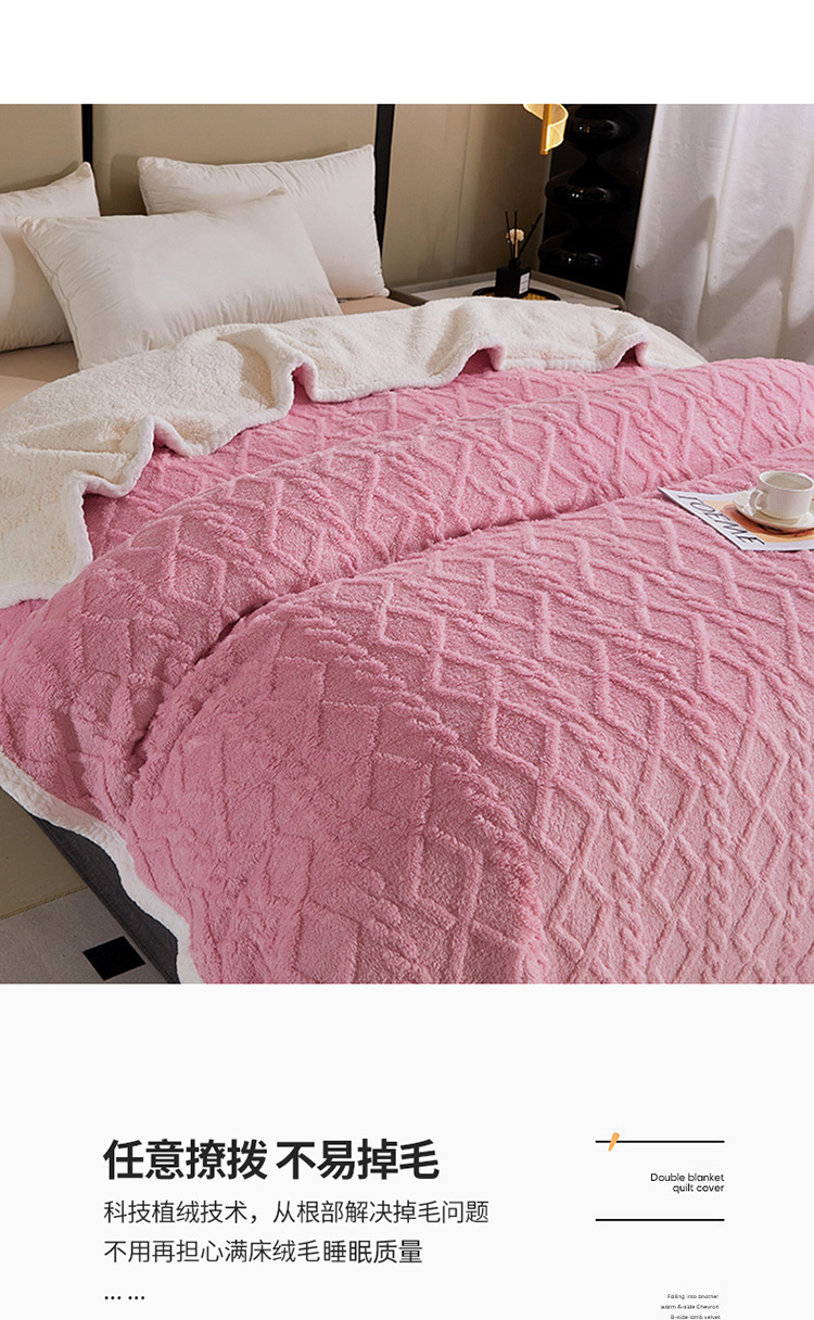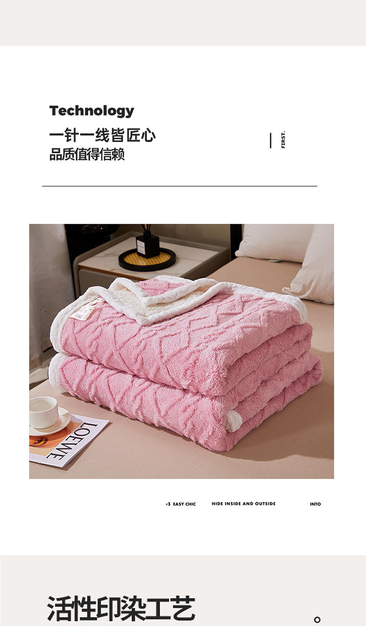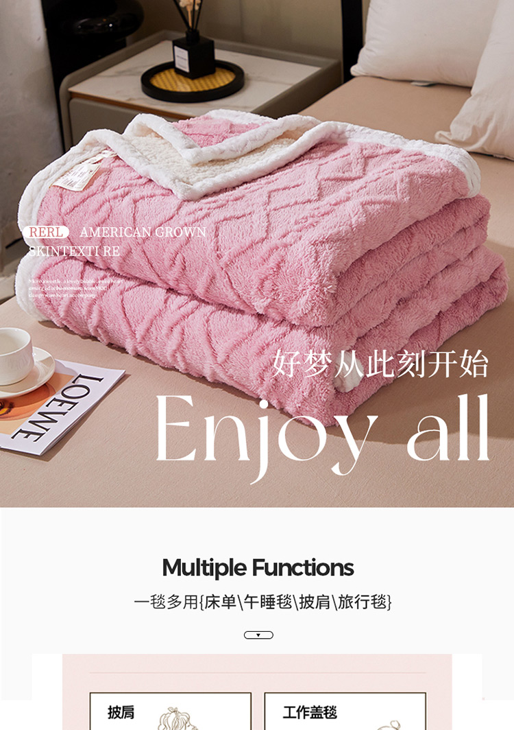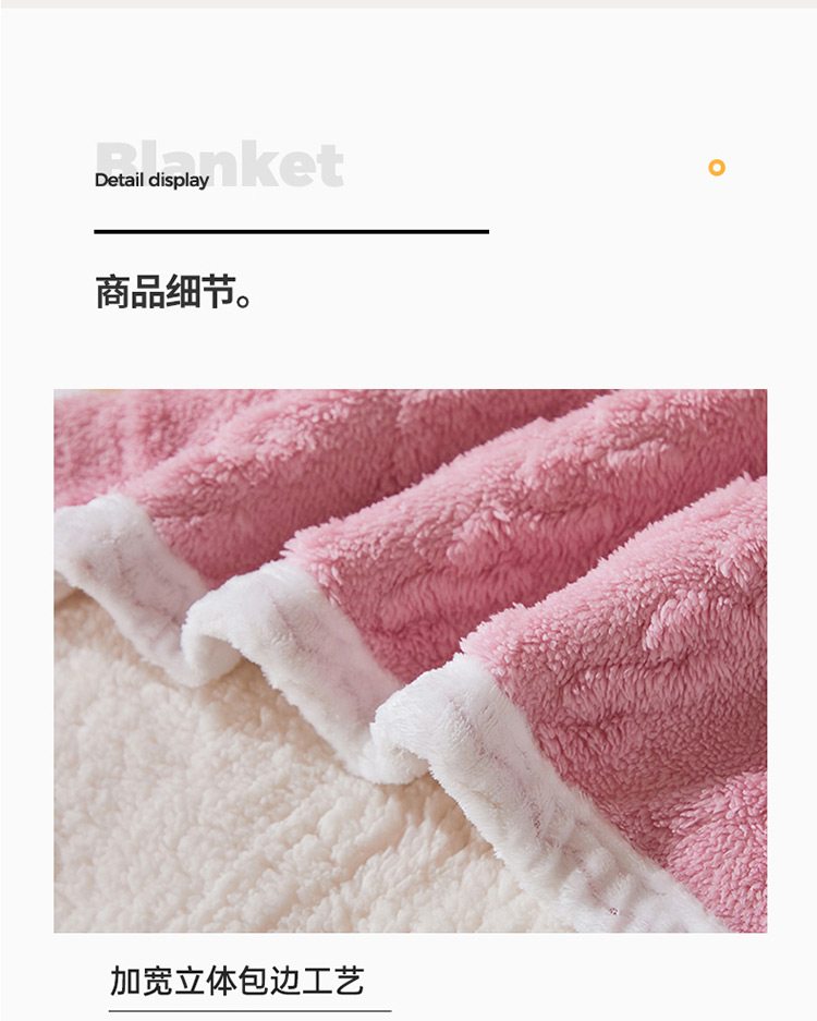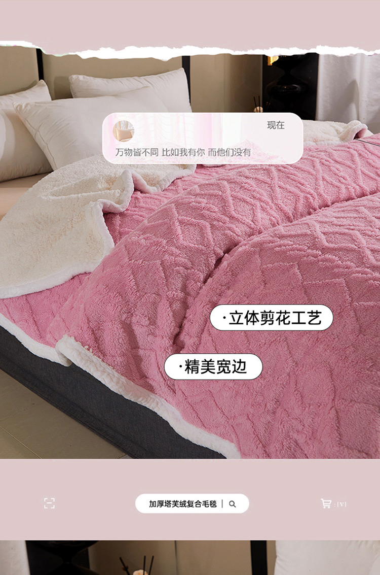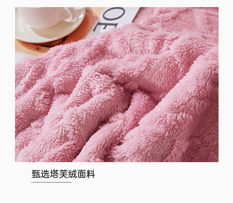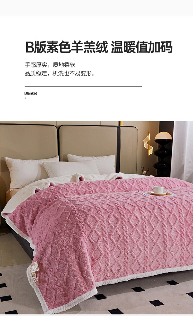面料:A版:塔芙绒 B版:羊羔绒 规格:150*200cm 一款多用:午睡毯、车用毯、沙发毯、披肩、床用被单等等,时刻感知你的温度,给你加倍温暖。面料中植入导电丝,告别静电烦恼。面料采用活性印染技术,安全不褪色,有颜值更舒适.