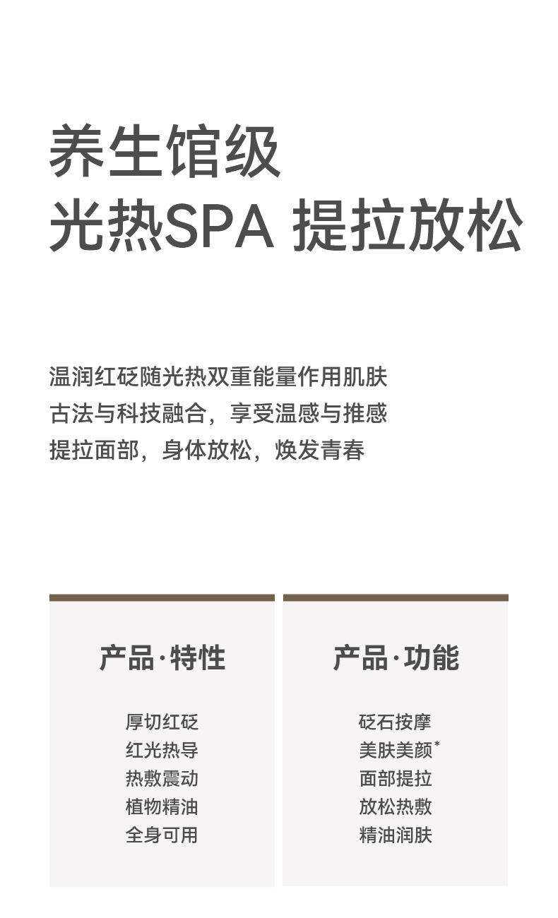来自大地元素的砭石,是抵御时间的智慧。 双能红光协同热敷、按摩、焕活推刮之间,肌肤张弛有度; 我们将自然的脉络、工艺的温度、养护的思路凝结其中, 按摩提拉,重塑精致轮廓。