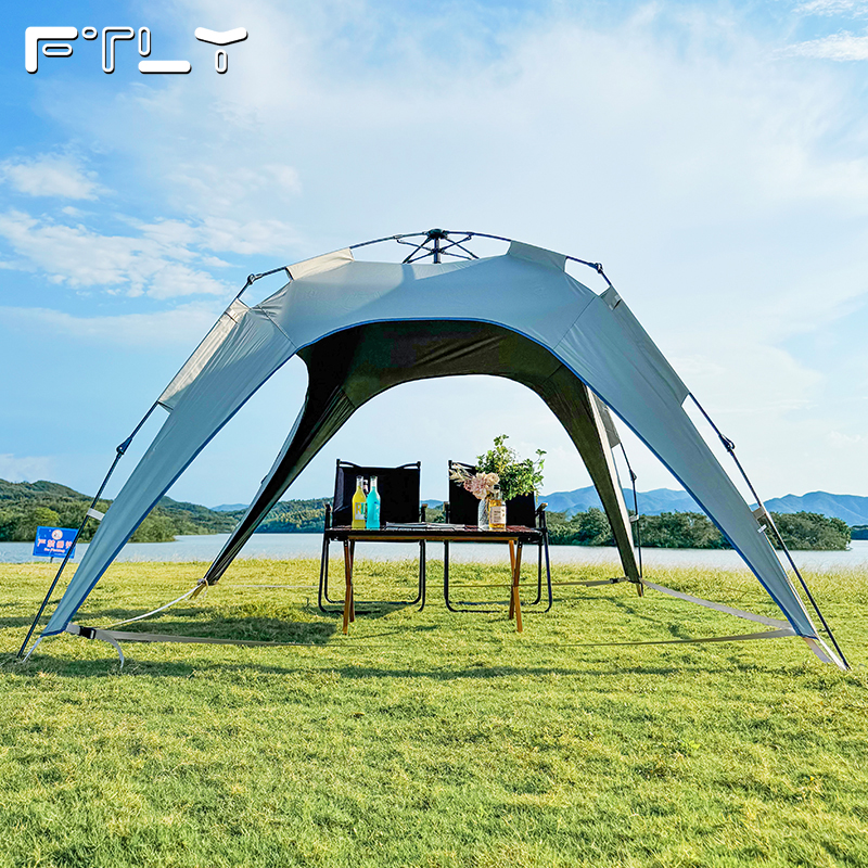 材质:210D钛黑胶牛津布+玻璃纤维杆 展开尺寸:270*270*170cm 收纳尺寸:108*17*17cm 颜色:浅卡其 净重:3.5kg 1、钛黑胶新材料,隔绝紫外线,有效防晒; 2、高颜值,7.3平大空间,可容纳户外6-8人亲友聚餐; 3、自动液压开合,一人也可搭建,轻松自如; 4、210D防水钛黑胶,深度防水防晒; 5、加强地钉,匹配对应风绳,自带收纳袋,轻松携带
