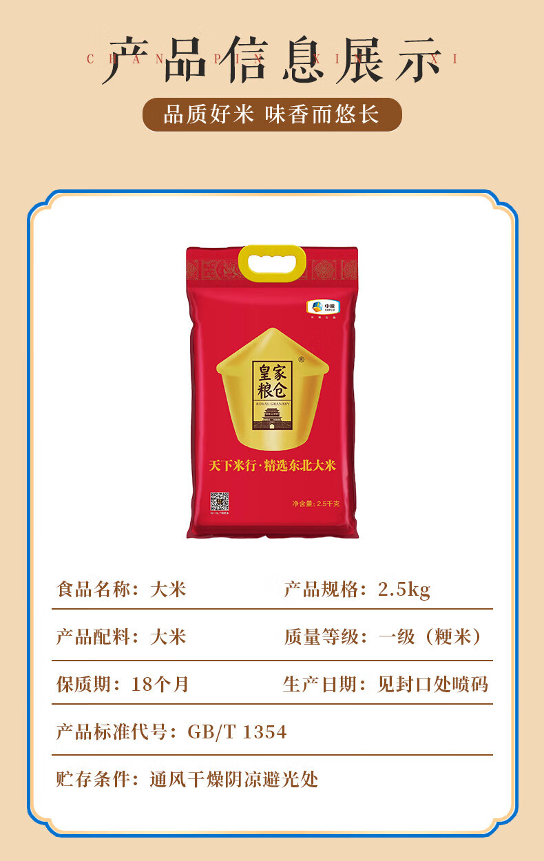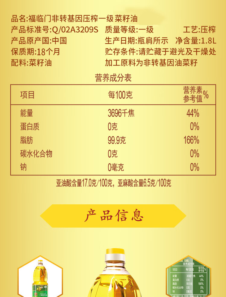 净含量:1.8L+3.55KG 中粮福临门非转基因一级菜籽油1.8L 中粮皇家粮仓天下米行精选东北大米2.5kg 中粮山萃瑞果纳福礼盒1.05kg 推荐理由: 中粮央企出品,米油坚果一站式配齐 主食健康 + 坚果营养,搭配均衡更贴心 礼盒体面实用,送礼、家用、福利皆宜