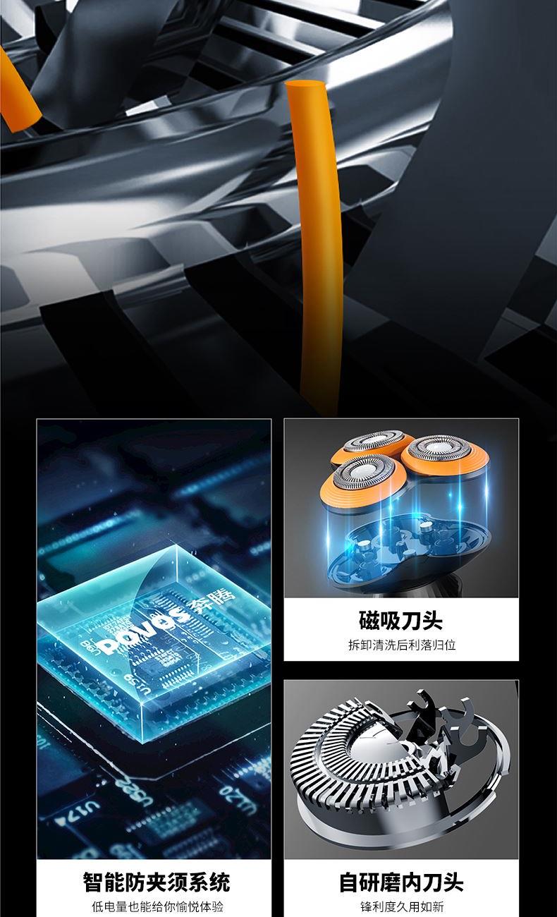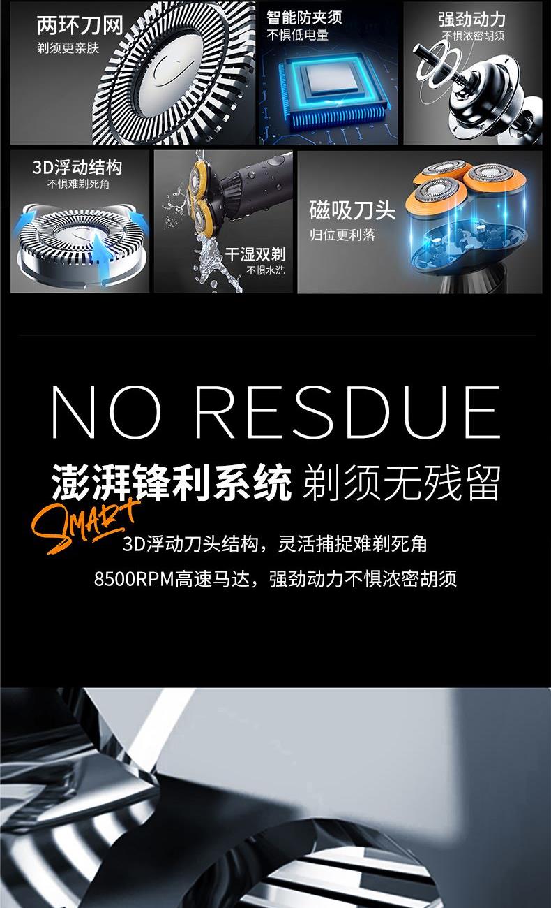 "1、磁吸刀头玩转科技感; 2、自动研磨久用如新; 3、3D浮动弹性贴合难剃部位; 4、TYPE-C 1小时快充续航2个月; 5、约8500高转速马达浓密胡须也能快速剃; 6、干湿双剃,洁净有腔调; 7、澎湃锋利系统,剃须无残留; "