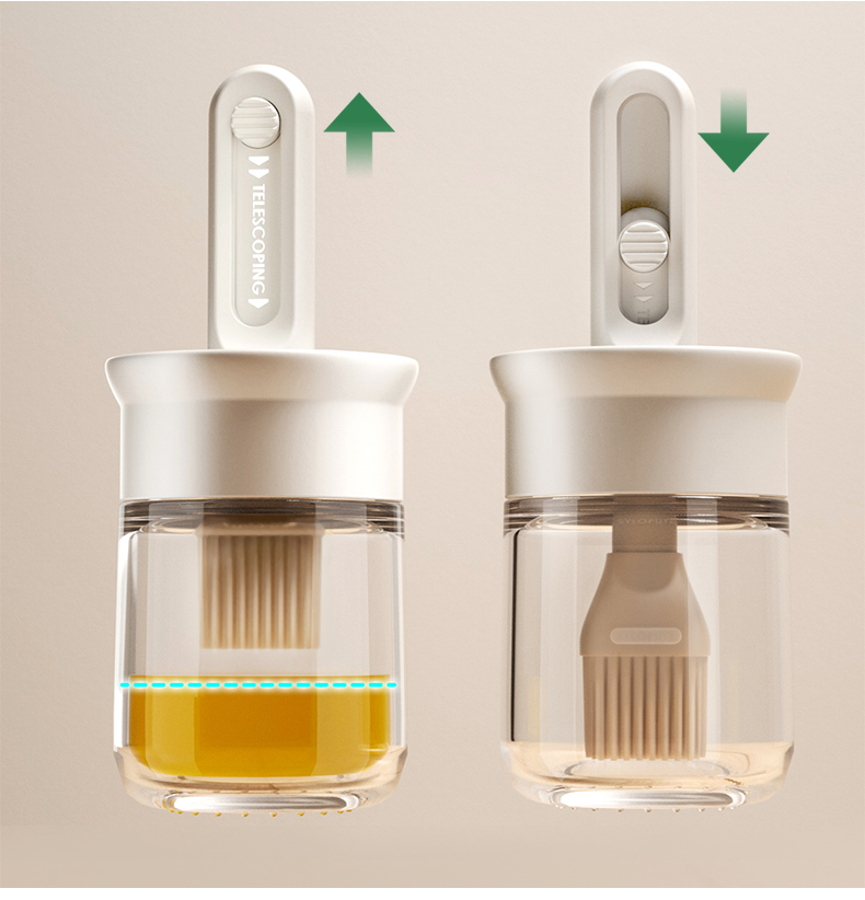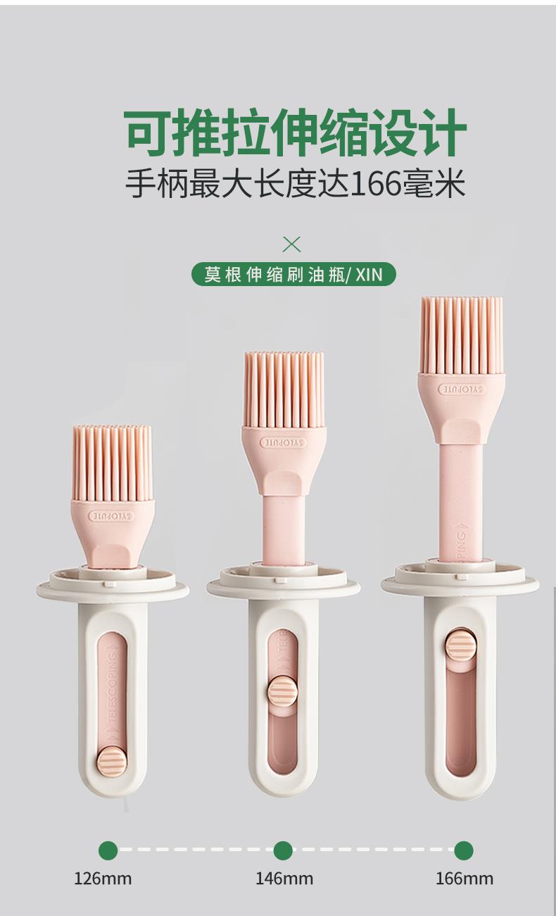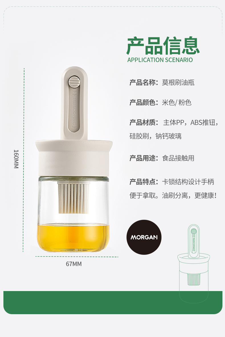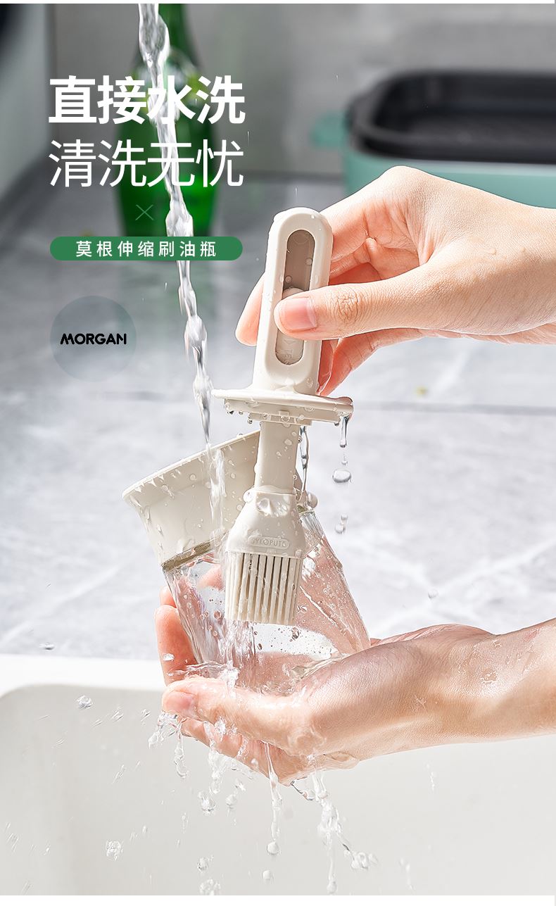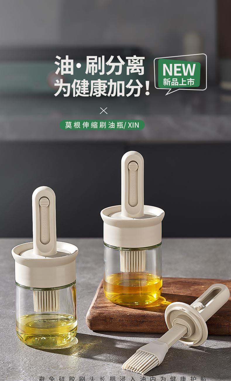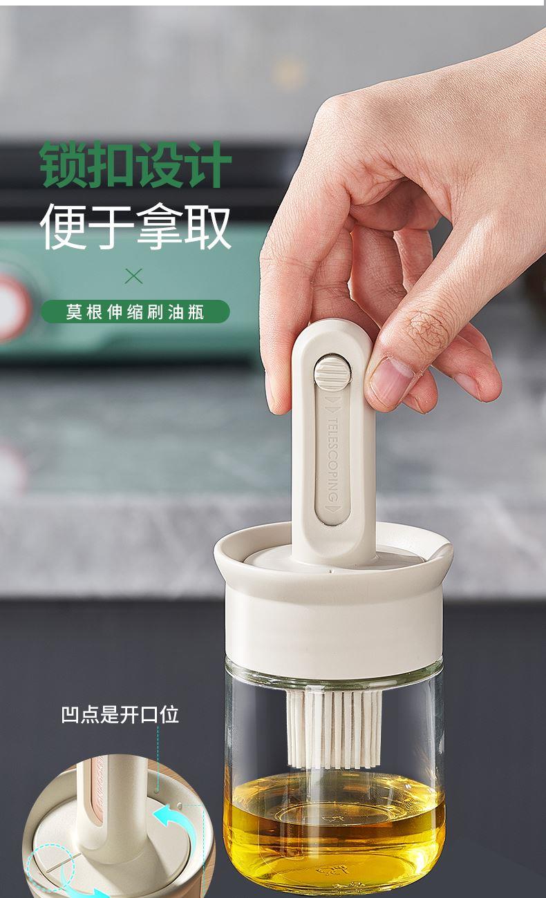 油·刷分离,为健康加分! 莫根伸缩刷油瓶 可推拉伸缩设计,手柄长度达166毫米 锁扣设计,便于拿取 6排刷头刷油有力 普通油刷刷头18根,是普通油刷刷头数量的3倍! 刷盖一体刷油有力 即是油刷也是防尘盖,二合一,更省心,一头两用,盖上盖子能阻挡灰尘和细菌,直接水洗清洗无忧 厨房好物无惧高温烤验 食品级硅胶接触,食材更安全 透明玻璃瓶身通透可视安全无异味,透明瓶身,瓶底防滑波点设计
