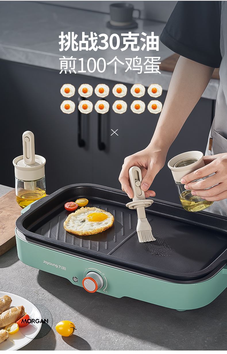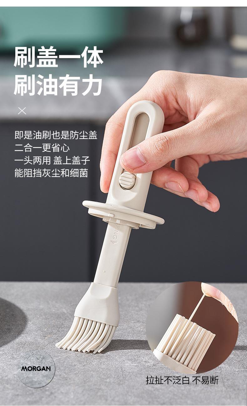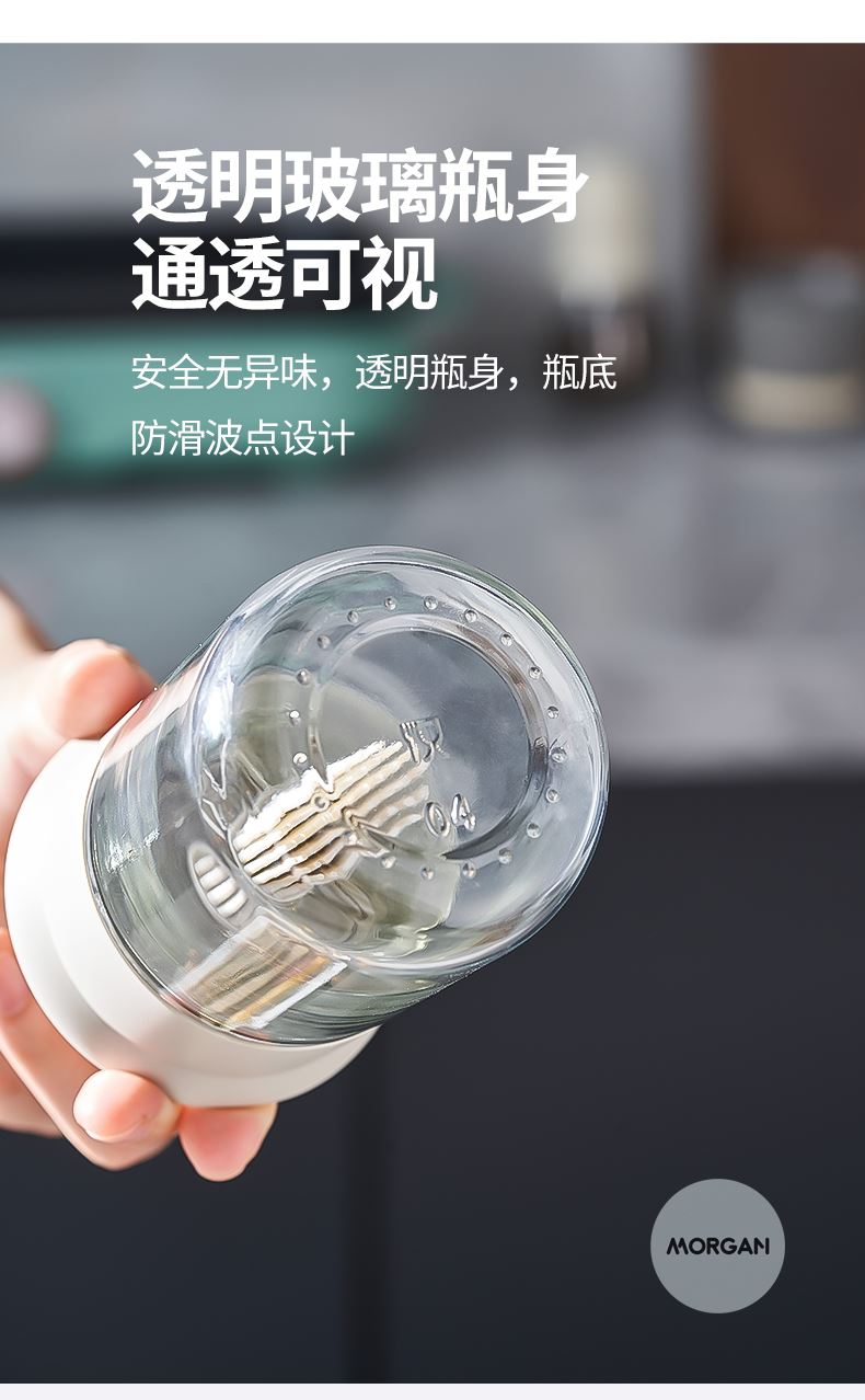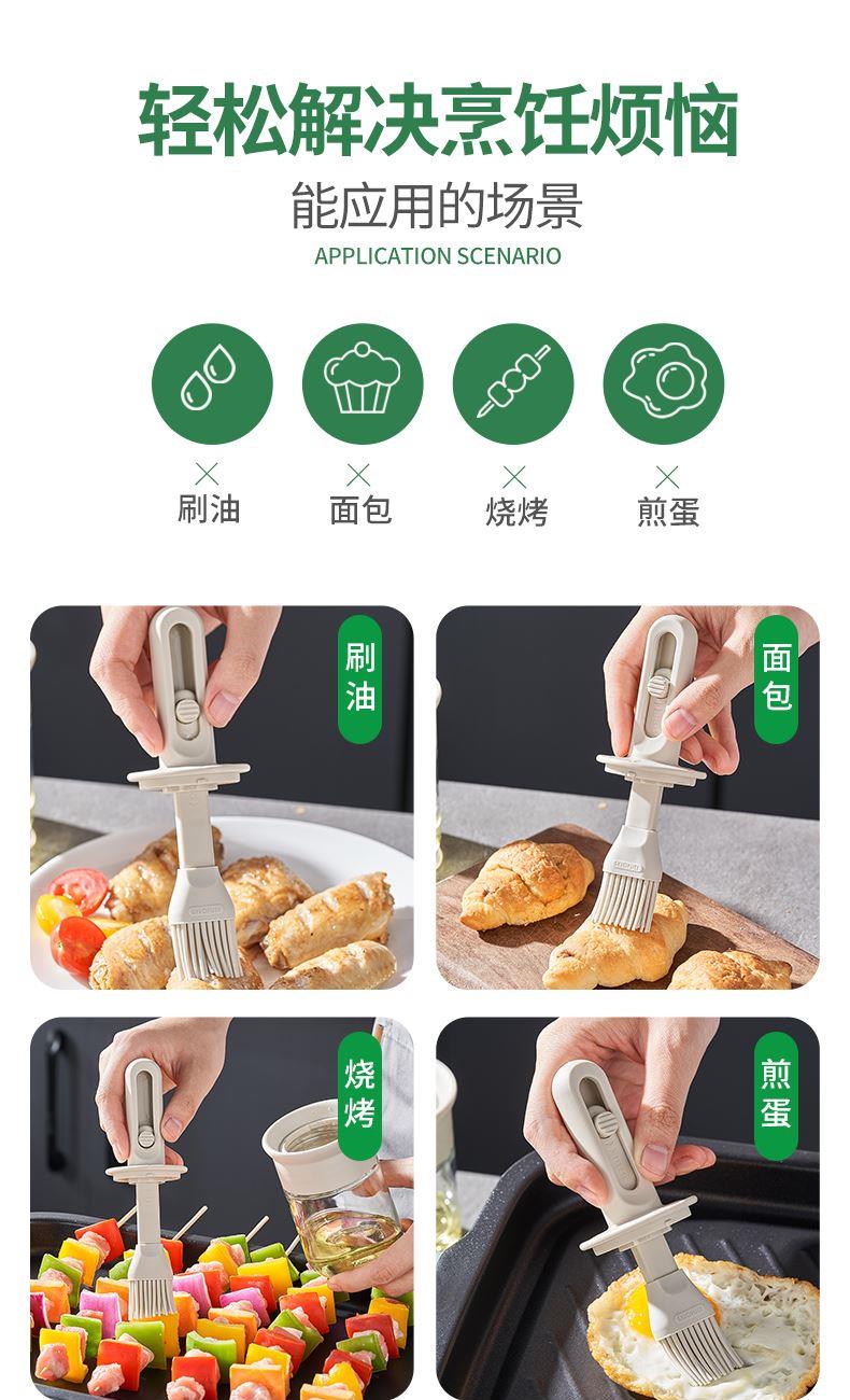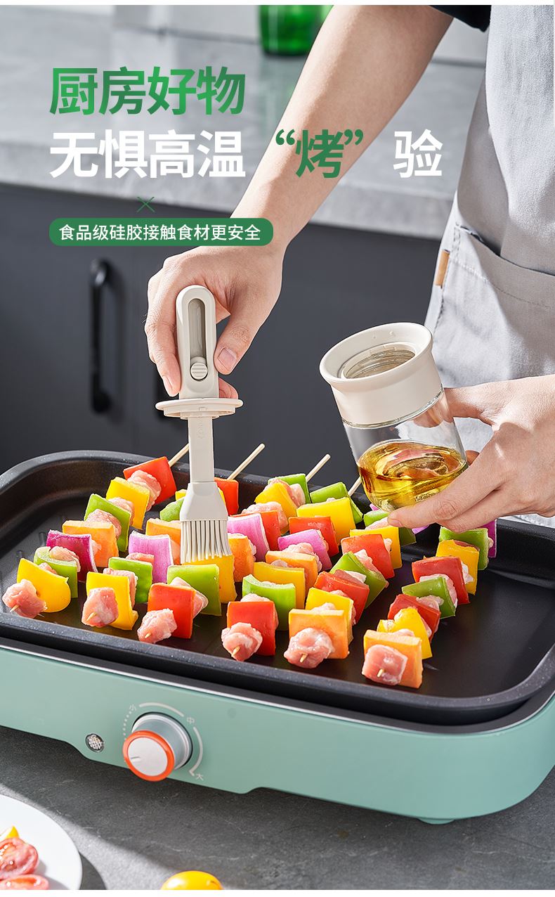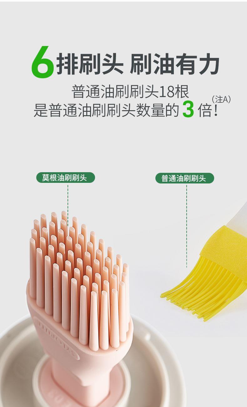 油·刷分离,为健康加分! 莫根伸缩刷油瓶 可推拉伸缩设计,手柄长度达166毫米 锁扣设计,便于拿取 6排刷头刷油有力 普通油刷刷头18根,是普通油刷刷头数量的3倍! 刷盖一体刷油有力 即是油刷也是防尘盖,二合一,更省心,一头两用,盖上盖子能阻挡灰尘和细菌,直接水洗清洗无忧 厨房好物无惧高温烤验 食品级硅胶接触,食材更安全 透明玻璃瓶身通透可视安全无异味,透明瓶身,瓶底防滑波点设计