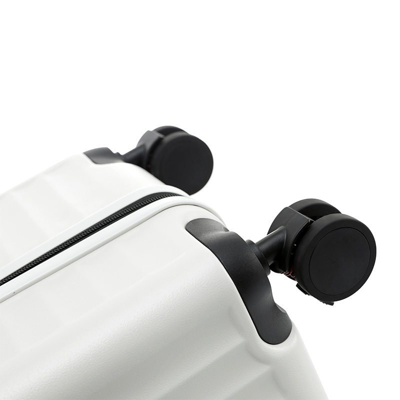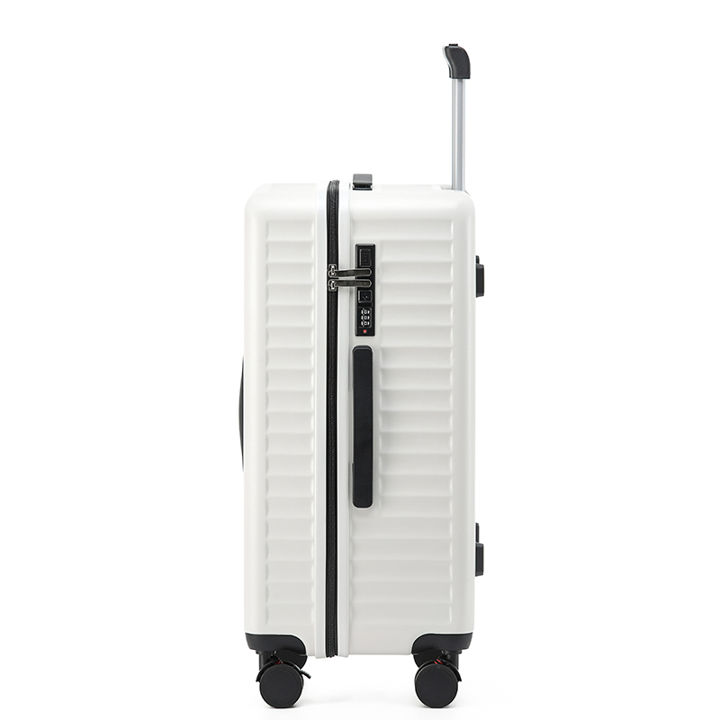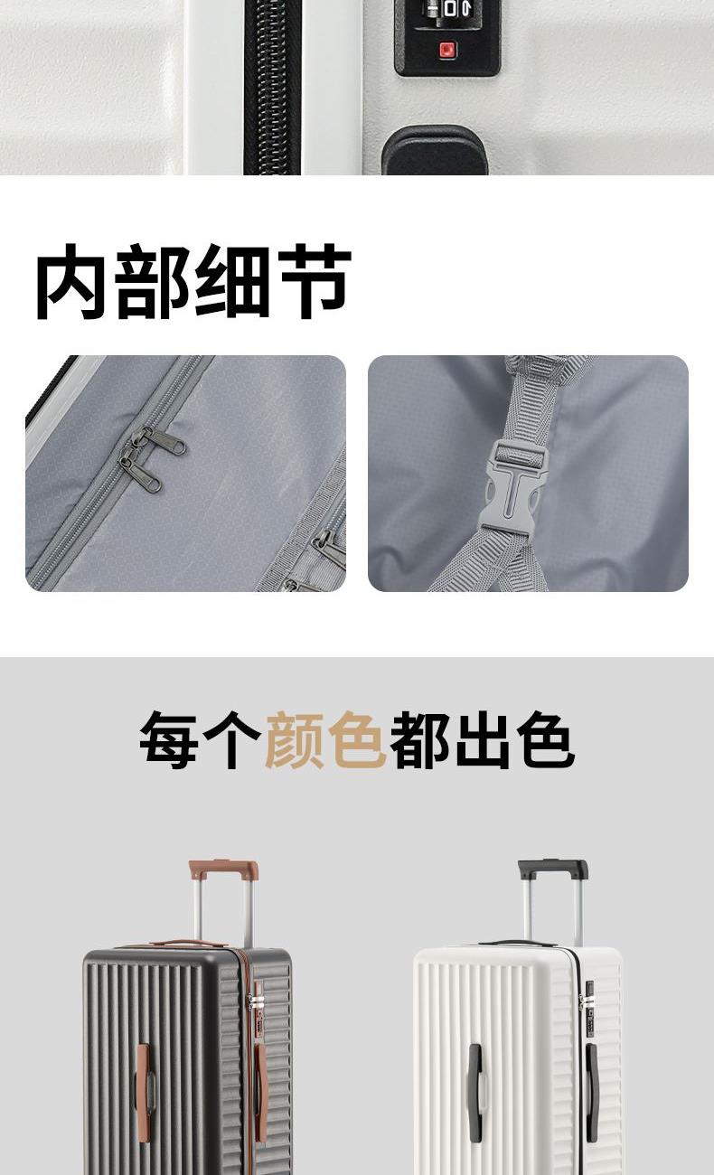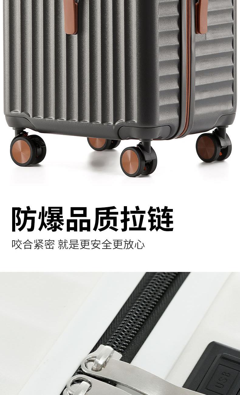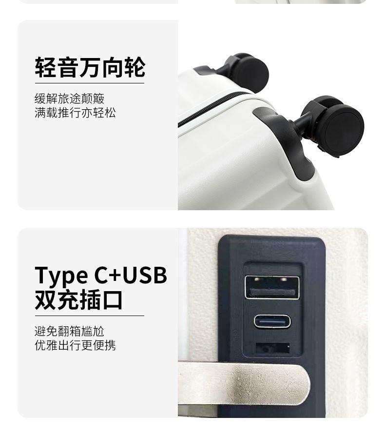1.合金顺滑拉杆,管壁厚实,经久耐用。 2.采用ABS一体成型工艺,具有冲击强度高,耐摩擦的特点,坚固强韧,从容面对各种挑战。 3.灵活飞机八轮,360°旋转,带刹车,稳定顺滑,让旅途更省心。 4.USB充电口+杯架便捷出行设计。 5.内里干湿分离。