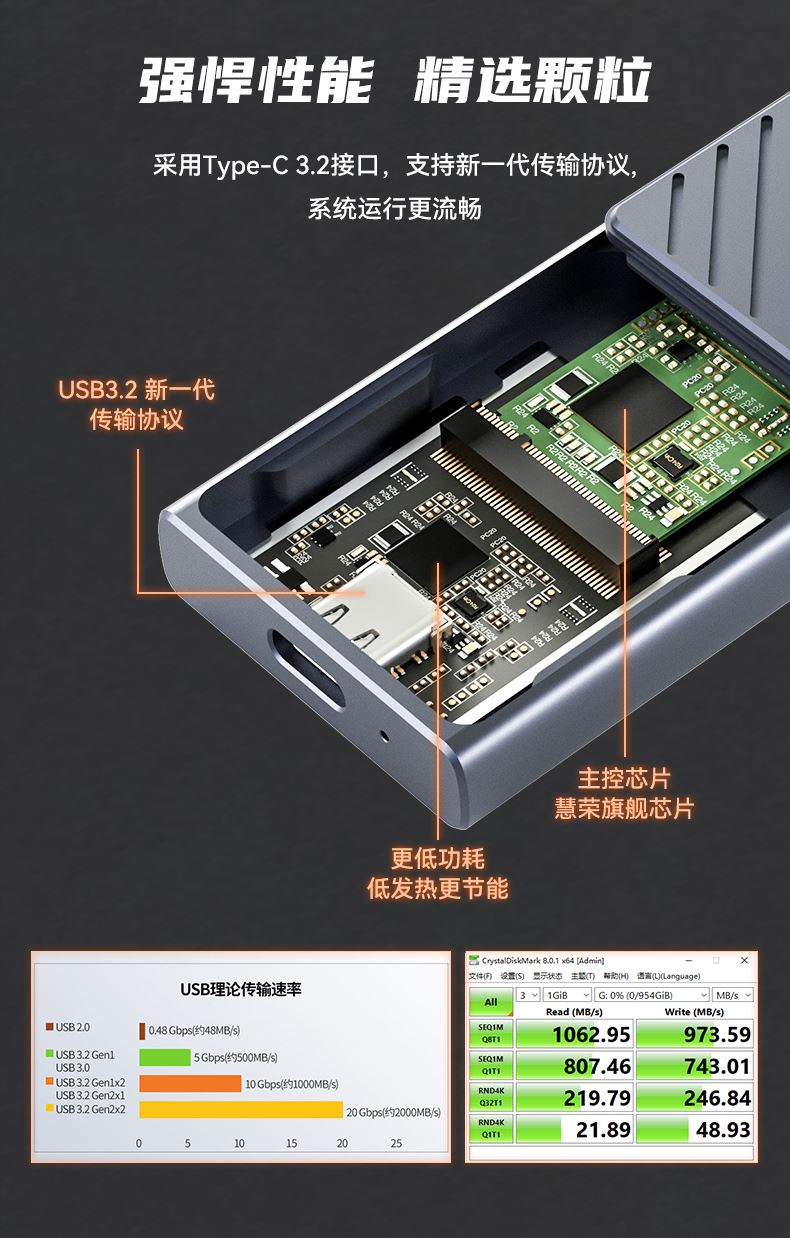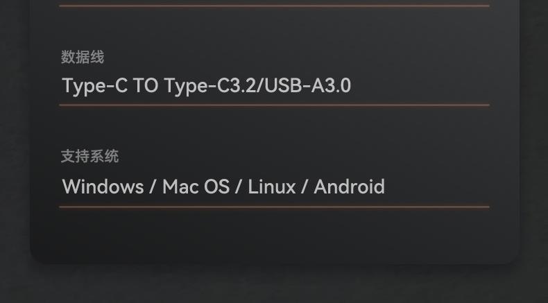 端口支持:Type-C3.2(10Gbps) 传输标准:USB3.2 Gen2 传输速率:NVMe协议10Gbps 速度:900MB/S写入速度 /1000MB/S(读取速度) 数据线:Type-C TO Type-C3.2/USB-A3.0(内附数据线) 支持系统:Windows/Mac OS/Linux/Android 材质:铝制CNC金属外壳 智能休眠 呵护固态硬盘 更低功效 低发热更节能 主控芯片 慧荣旗舰芯片 多端兼容 即插即用 产品尺寸:113.2*36*11mm 单品重量:80g