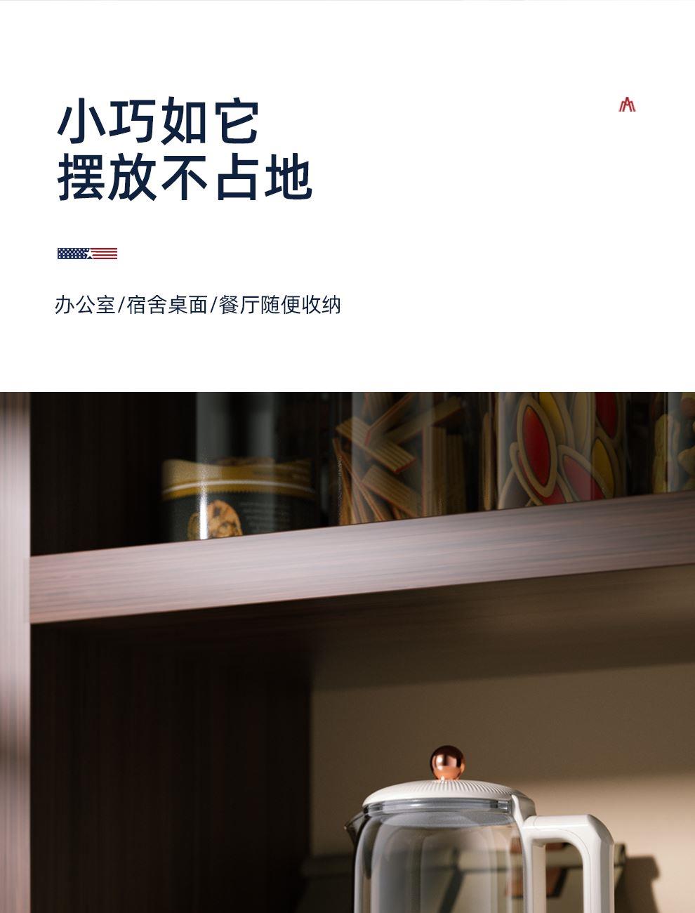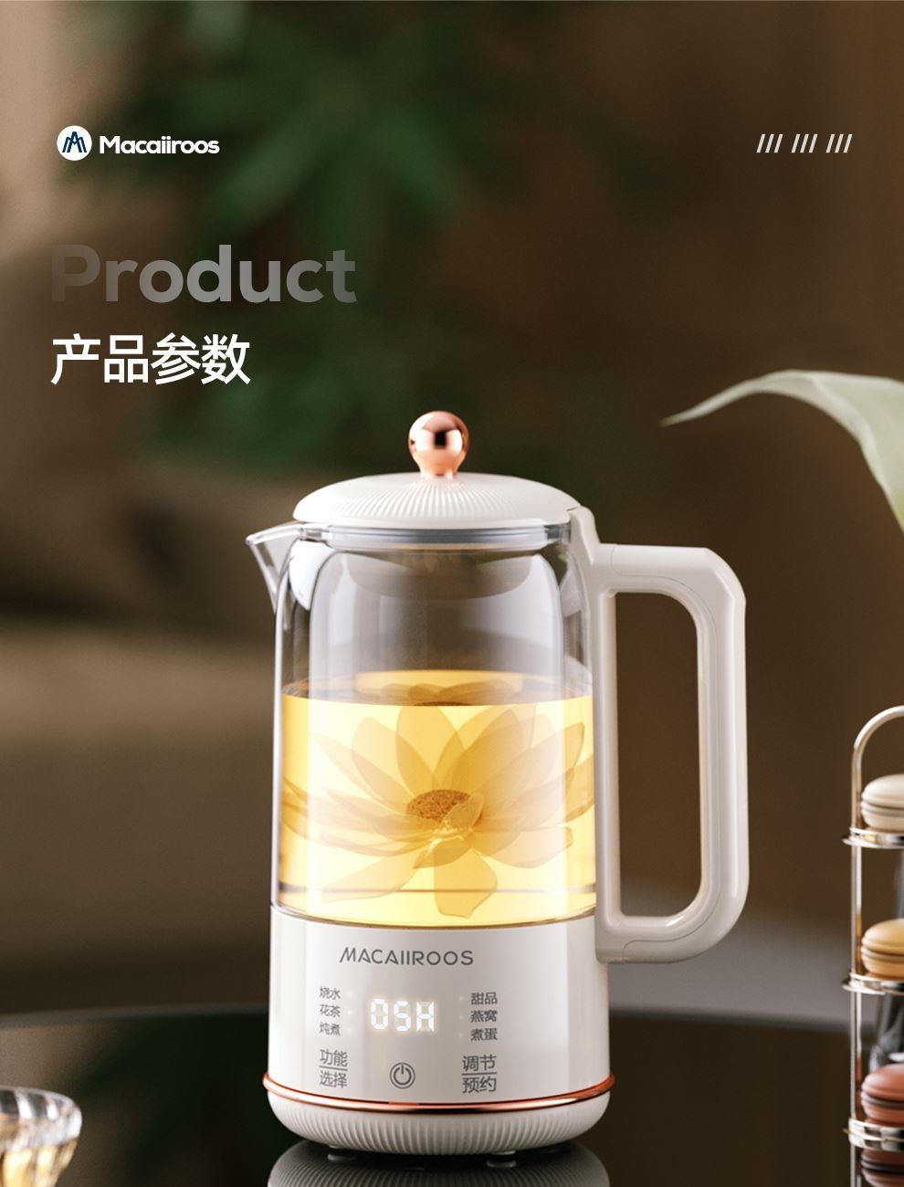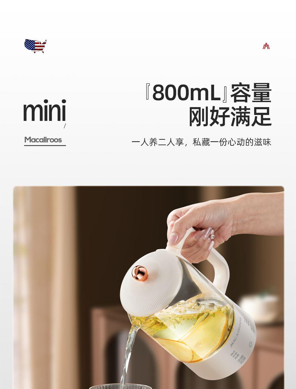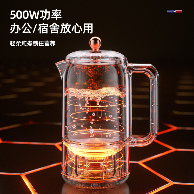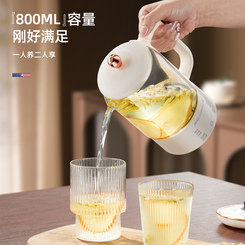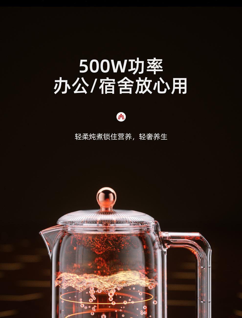额定功率:500W 额定容量:800mL 额定电压:220V~ 额定频率:50Hz 产品净重:0.72kg 产品毛重:0.89kg 整箱重量:12.1kg 一机多能6大核心菜单集烧水、花茶、营养炖煮等,12h预约,2h定时; 小巧机身800ml私享容量,摆放桌面不占位置,慵懒轻养; 高硼硅玻璃壶身&304不锈钢发热盘耐骤冷骤热冲击,材质环保、无异味; 智能程序触摸智能控制,双重防干烧,烹饪更安心。