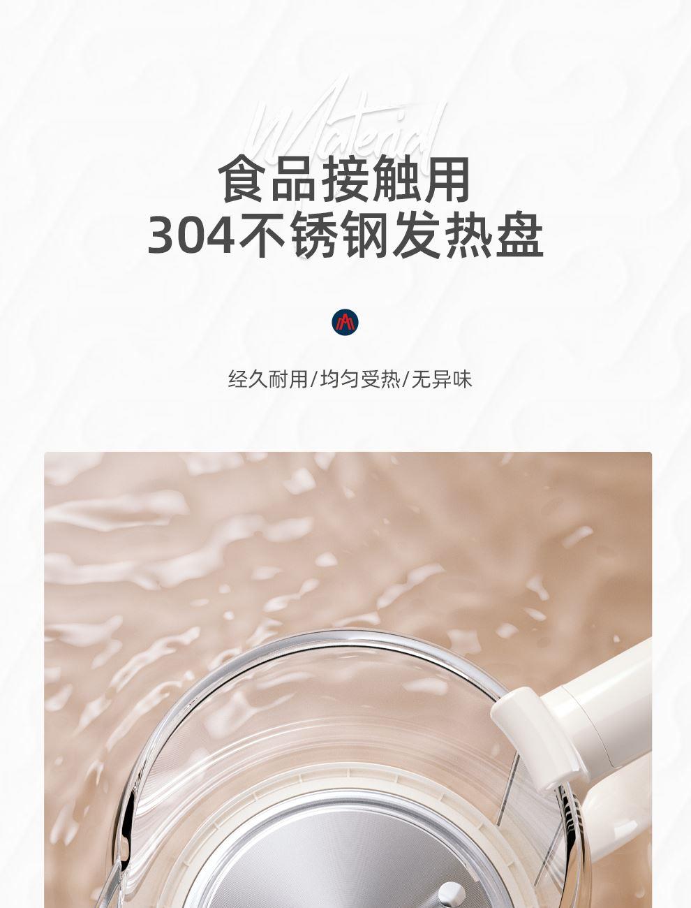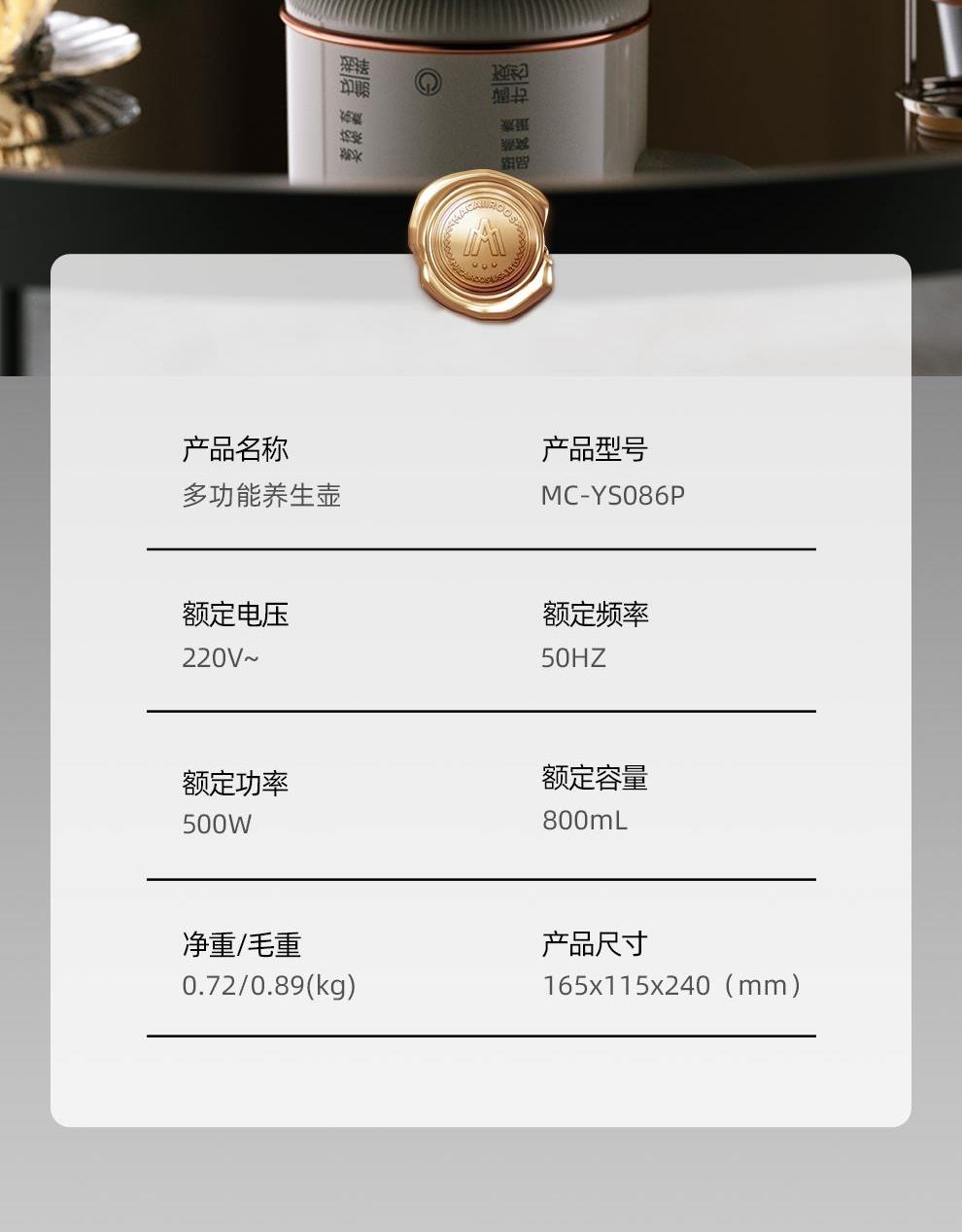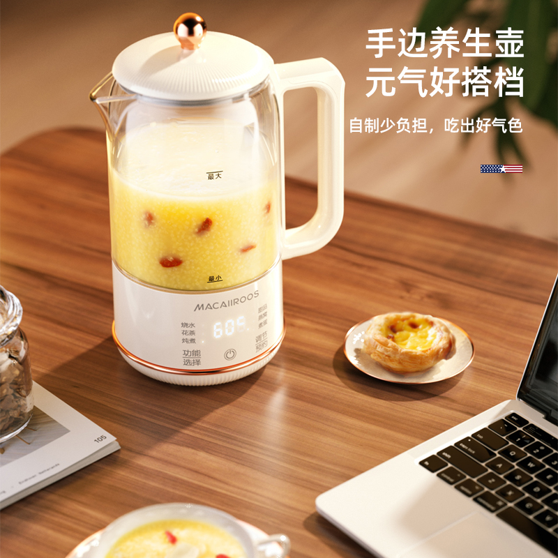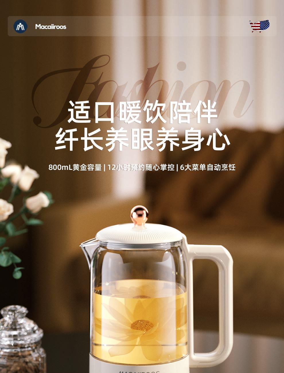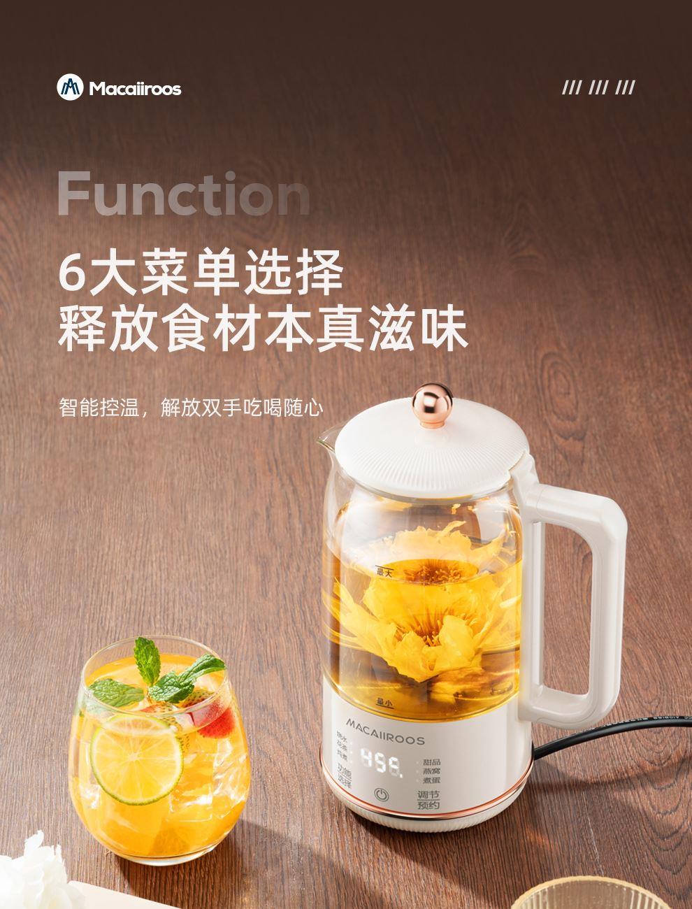 额定功率:500W 额定容量:800mL 额定电压:220V~ 额定频率:50Hz 产品净重:0.72kg 产品毛重:0.89kg 整箱重量:12.1kg 一机多能6大核心菜单集烧水、花茶、营养炖煮等,12h预约,2h定时; 小巧机身800ml私享容量,摆放桌面不占位置,慵懒轻养; 高硼硅玻璃壶身&304不锈钢发热盘耐骤冷骤热冲击,材质环保、无异味; 智能程序触摸智能控制,双重防干烧,烹饪更安心。