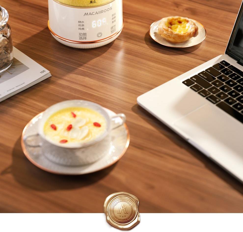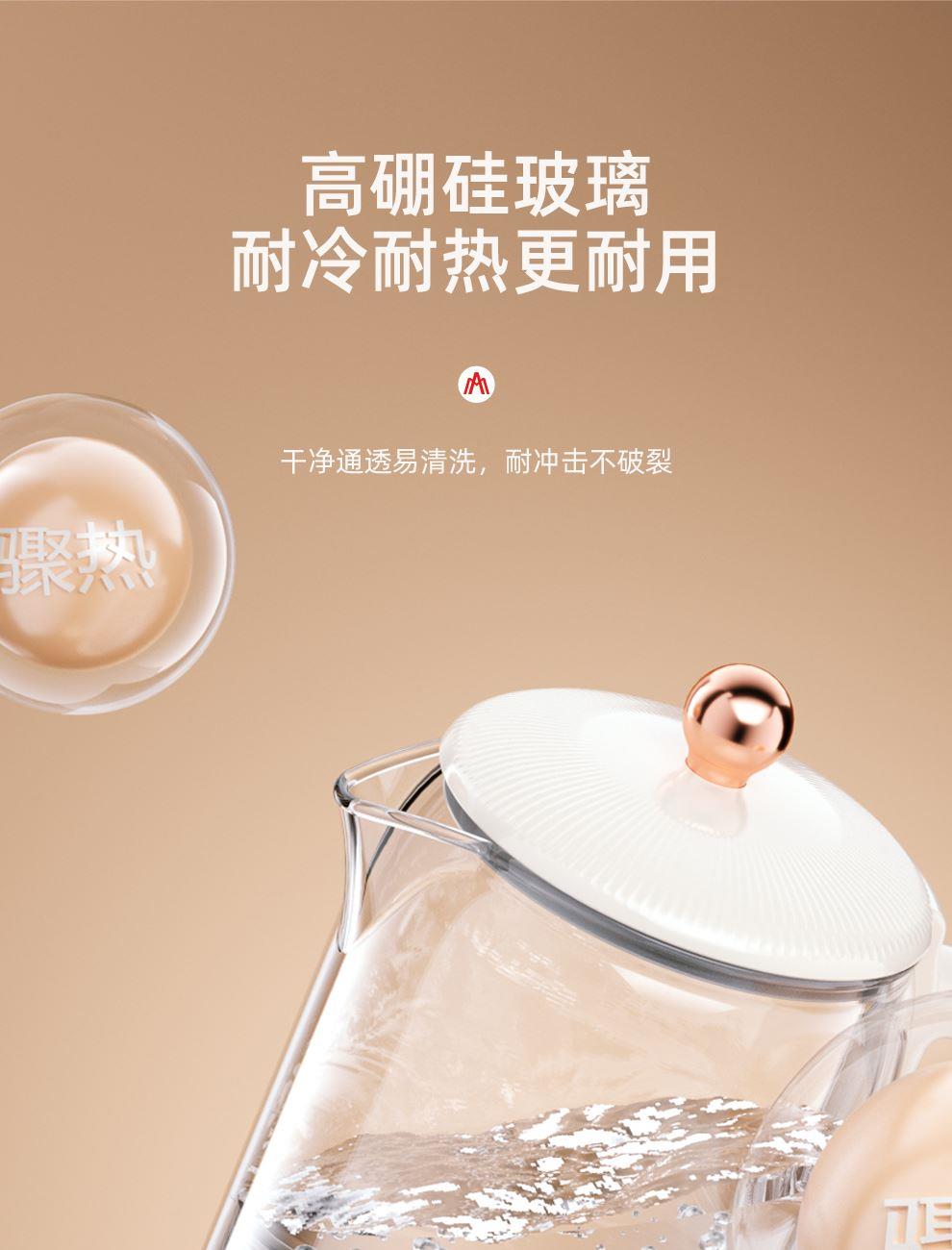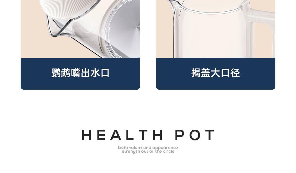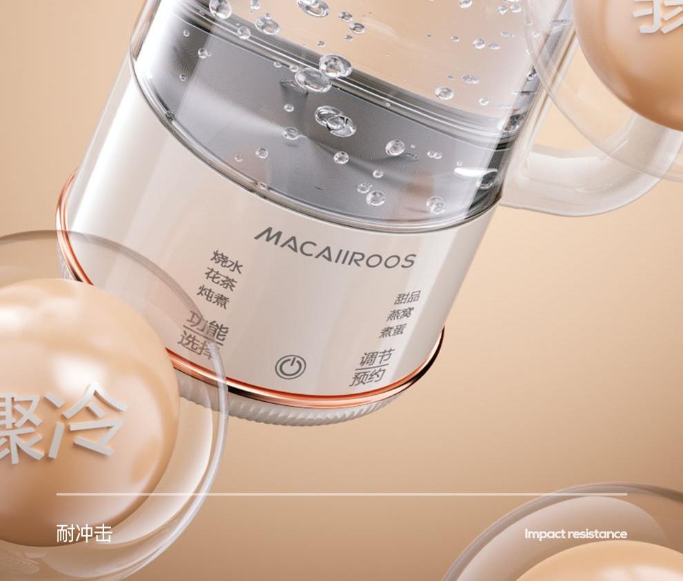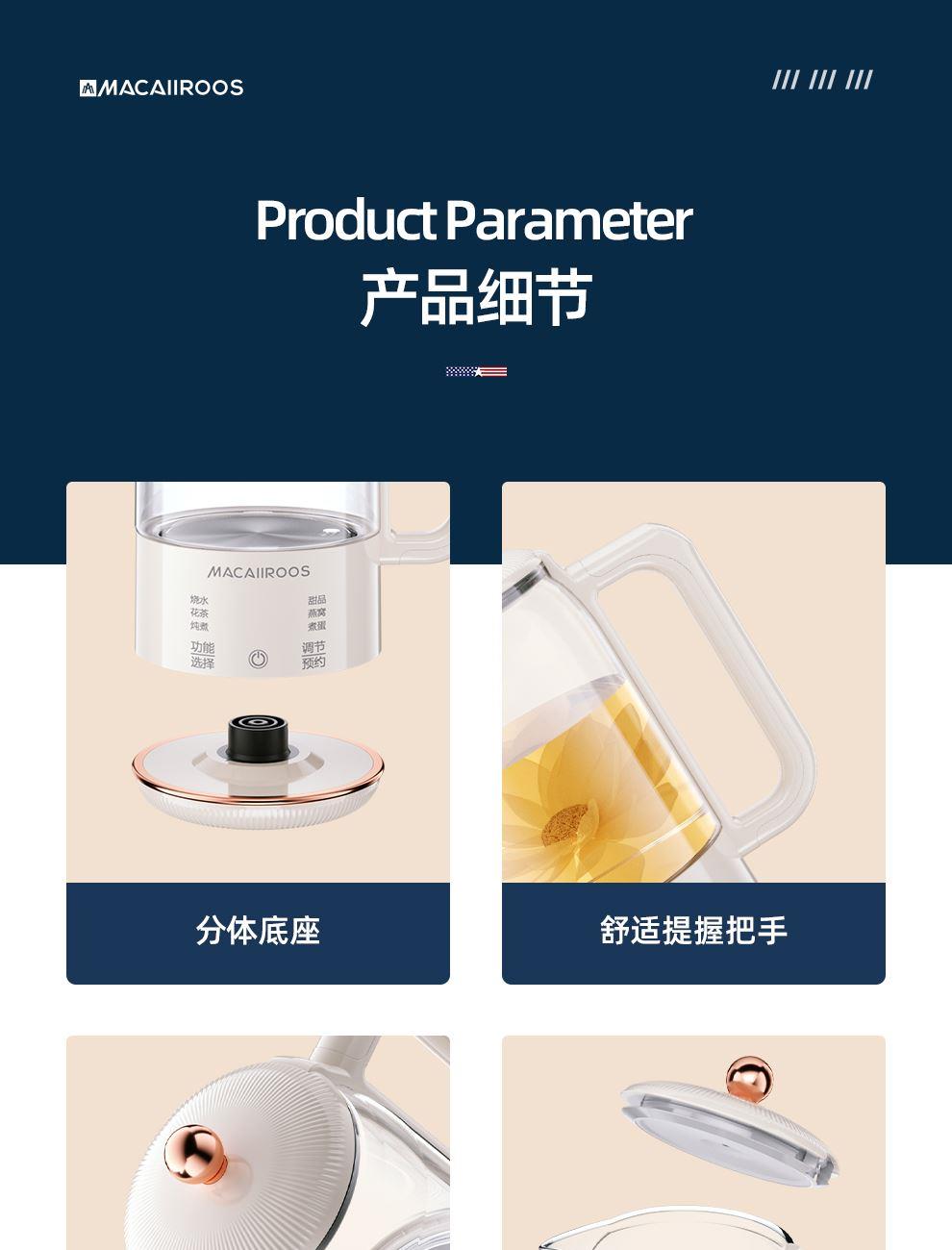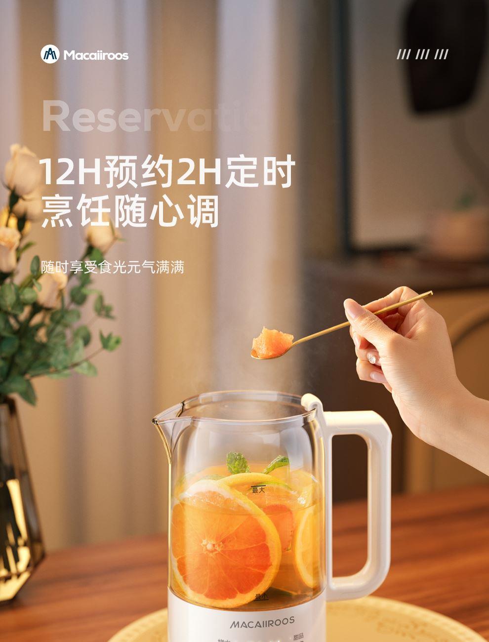 额定功率:500W 额定容量:800mL 额定电压:220V~ 额定频率:50Hz 产品净重:0.72kg 产品毛重:0.89kg 整箱重量:12.1kg 一机多能6大核心菜单集烧水、花茶、营养炖煮等,12h预约,2h定时; 小巧机身800ml私享容量,摆放桌面不占位置,慵懒轻养; 高硼硅玻璃壶身&304不锈钢发热盘耐骤冷骤热冲击,材质环保、无异味; 智能程序触摸智能控制,双重防干烧,烹饪更安心。