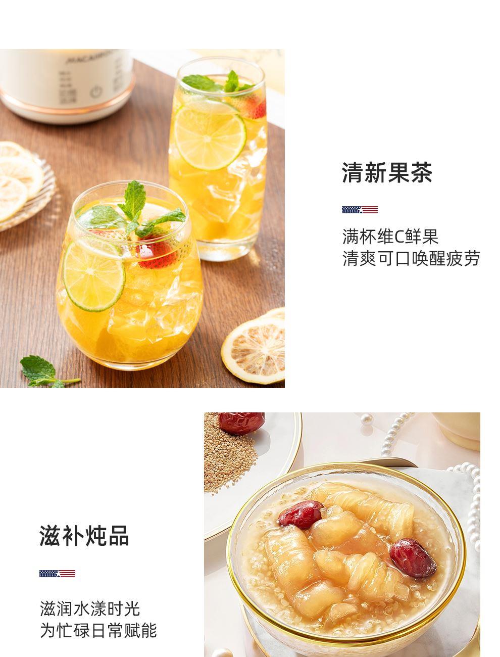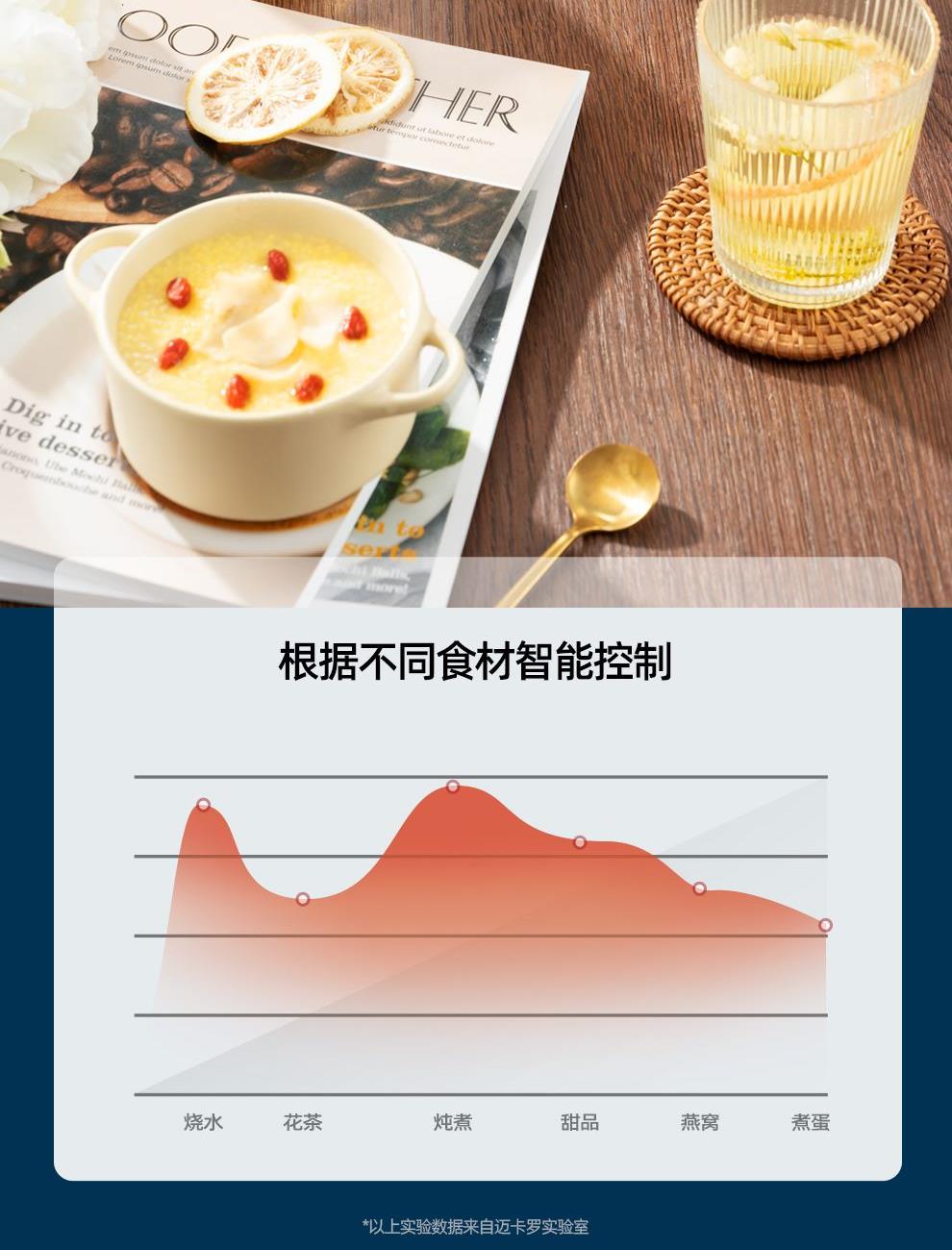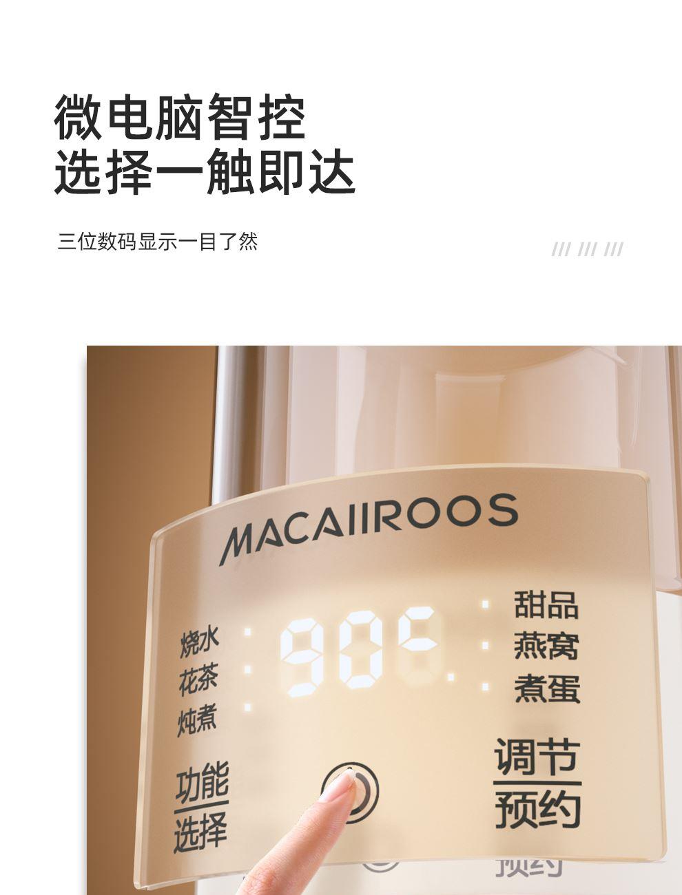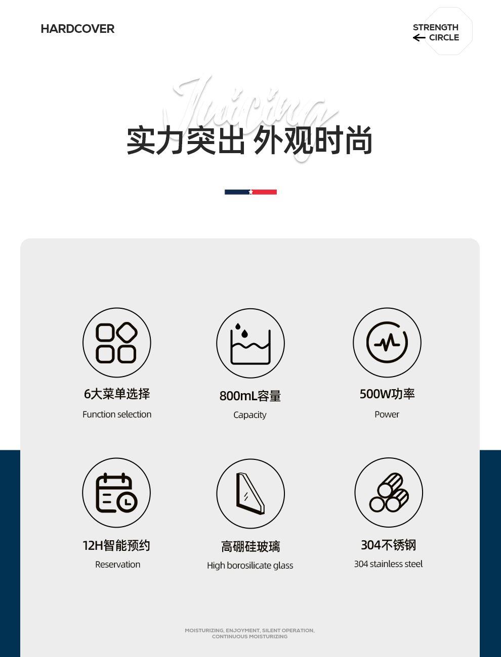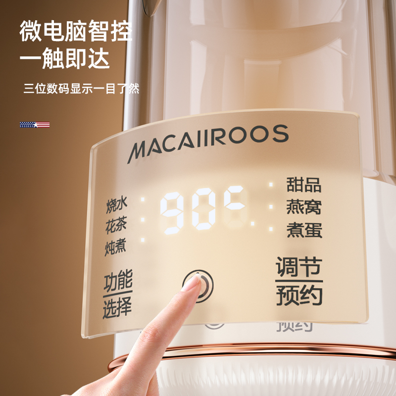 额定功率:500W 额定容量:800mL 额定电压:220V~ 额定频率:50Hz 产品净重:0.72kg 产品毛重:0.89kg 整箱重量:12.1kg 一机多能6大核心菜单集烧水、花茶、营养炖煮等,12h预约,2h定时; 小巧机身800ml私享容量,摆放桌面不占位置,慵懒轻养; 高硼硅玻璃壶身&304不锈钢发热盘耐骤冷骤热冲击,材质环保、无异味; 智能程序触摸智能控制,双重防干烧,烹饪更安心。